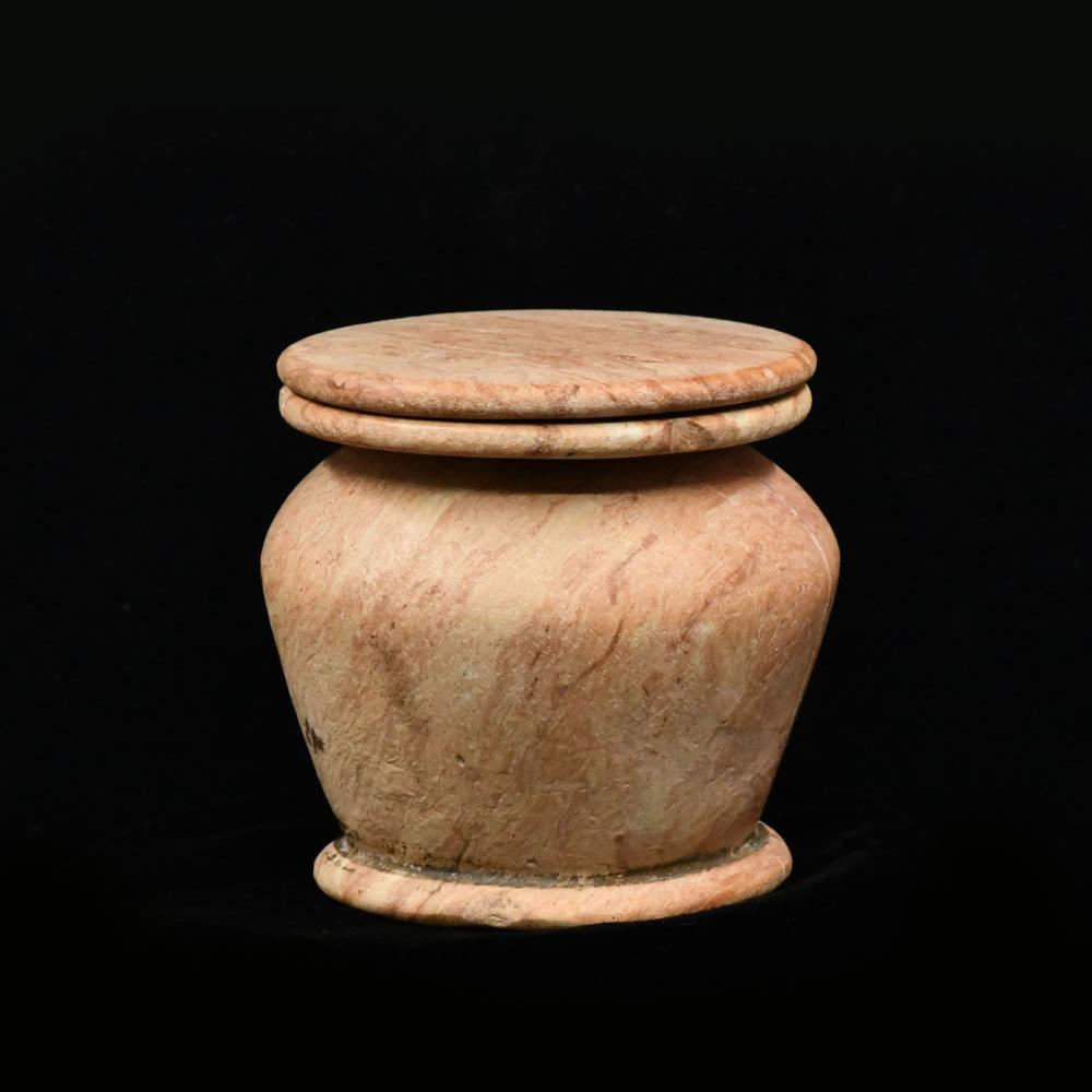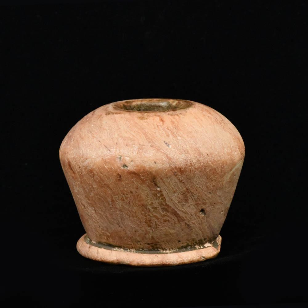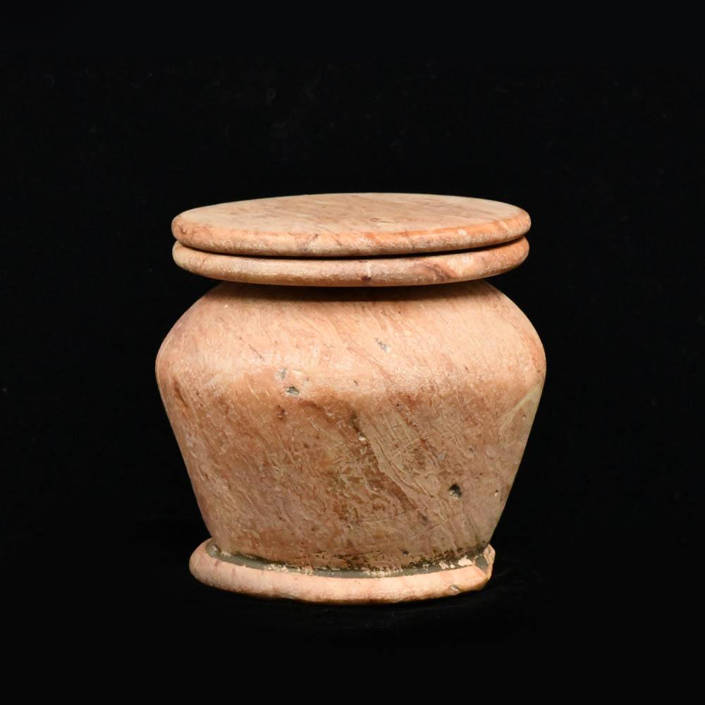 Dieses elegante, gedrungene Gefäß aus cremerosa Brekzie dient zur Aufbewahrung von Kajal (Augenschminke) und hat glatte, konvexe Seiten, die sich von einem kleinen, mit Fuß versehenen Boden nach oben zu einer hohen Schulter ausdehnen, die zu einem zweiteiligen, breiten, abgewinkelten Rand führt, der sich ablöst. Wie bei dieser Art von Gefäß üblich, ist die Bohrung im Inneren schmal und entspricht nicht der Form des Körpers. Die Ägypter verwendeten Kajal in großem Umfang, um ihre Augen zu betonen und zu schützen. Der breite Rand dieses kleinen Topfes sorgte dafür, dass keine kleinen Krümel dieses kostbaren Produkts aus den fernen arabischen Minen am Roten Meer verschwendet wurden.