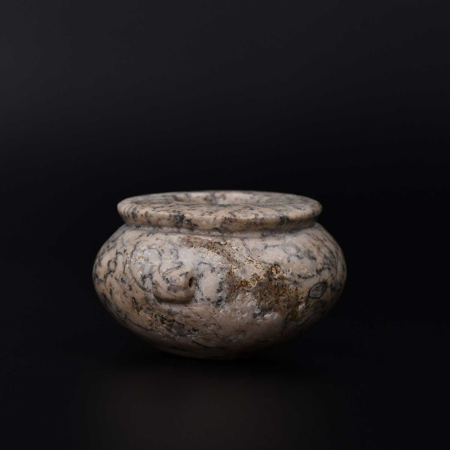 hervorragend gearbeitetes Gefäß aus weißem Gneis, dessen Gestein aus einer Vielzahl grauer bis schwarzer Einschlüsse in einer weichen cremefarbenen Matrix besteht. Die elegante Form ist charakteristisch für Steinvasen der frühen Dynastien, die durchbrochenen, horizontalen Doppelhenkel mit Ösen sind auf den Schultern angebracht, der abgerundete Rand ist versetzt und steht auf einem flachen Boden, das Innere ist ausgehöhlt, in diesem Beispiel jedoch nicht bis an die Gefäßseiten. Gefäße wie dieses Exemplar waren in der Antike hochgeschätzt und dienten vermutlich der Aufbewahrung wertvoller und exotischer Duftöle oder Salben.