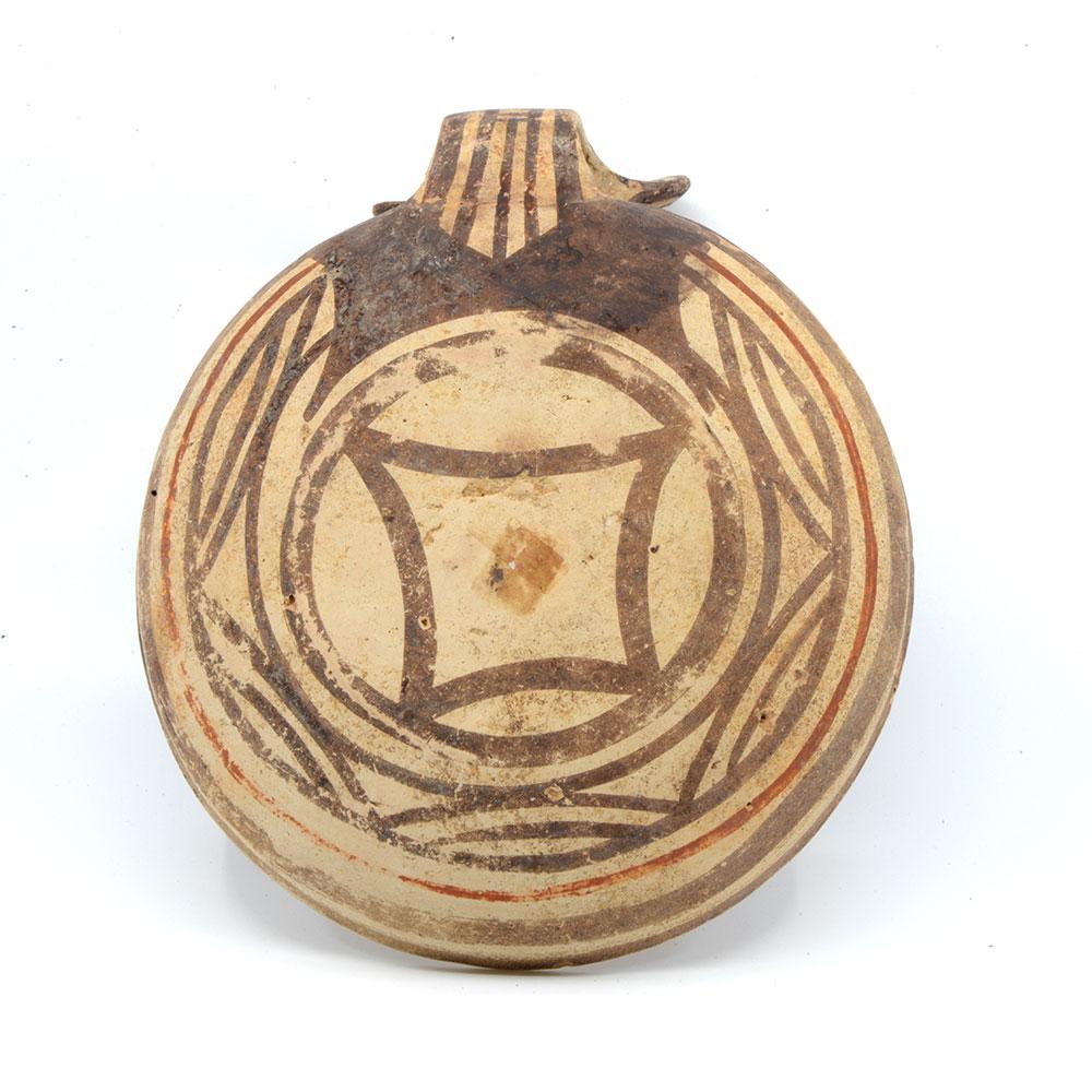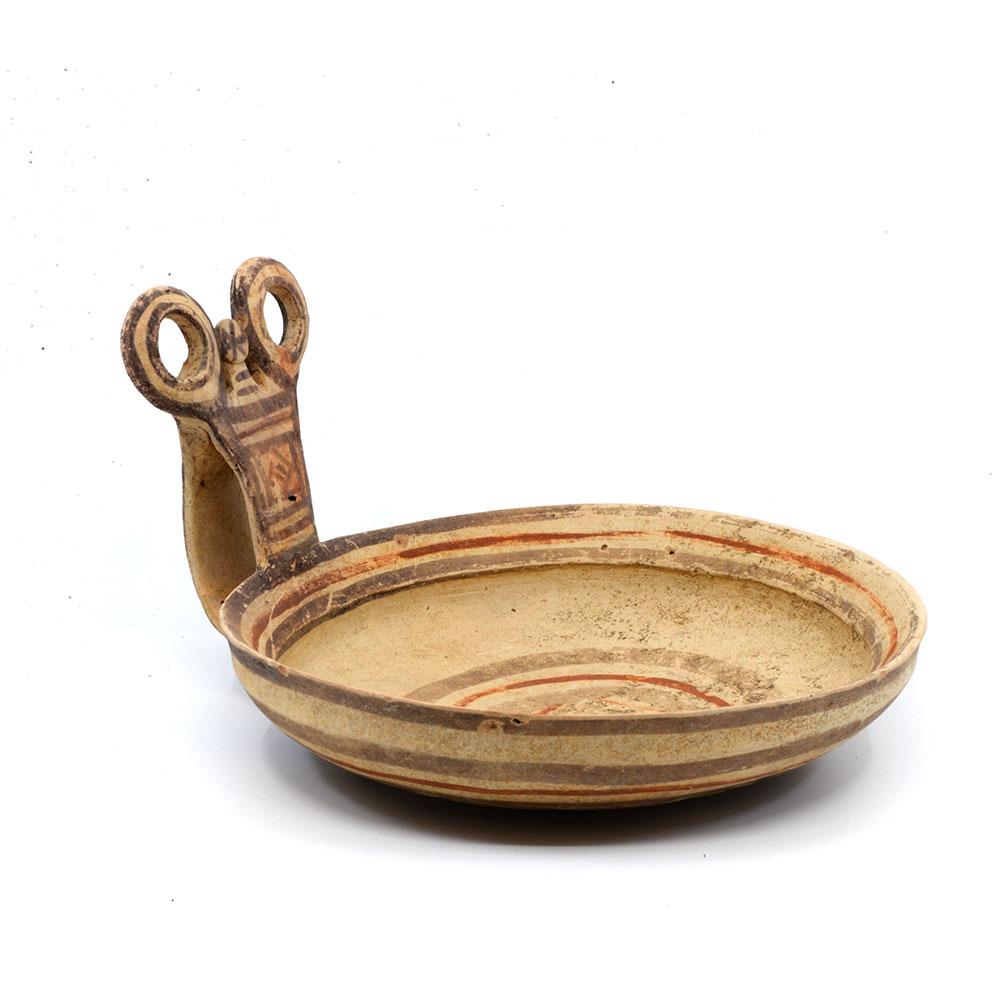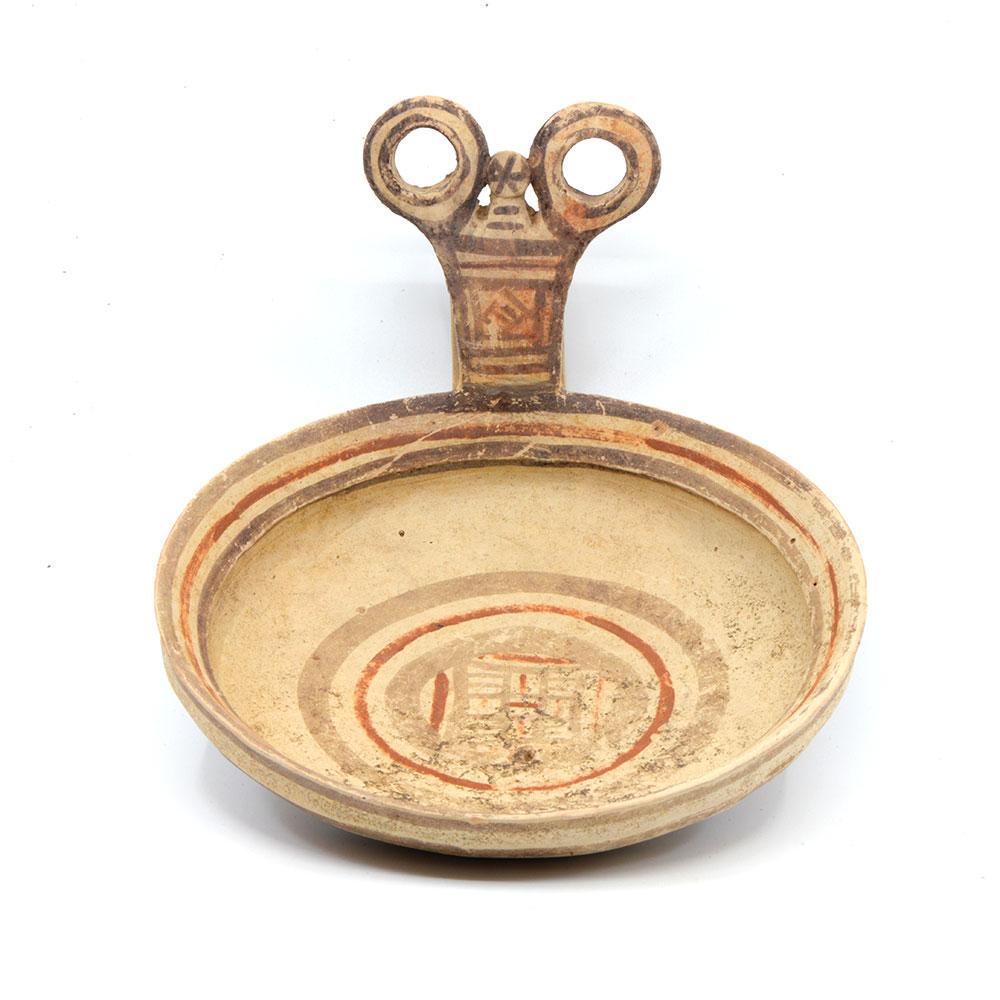 Die daunische Gesellschaft war eine Mischung aus einheimischen Italienern und Griechen, die sich in der Gegend niedergelassen hatten. Bereits im 6. Jahrhundert v. Chr. war Daunia eine äußerst wohlhabende Region, wie die reichen Grabbeigaben aus den städtischen Zentren von Canosa, Arpi und Salapia unter anderem belegen. Die Formen der Gefäße blieben stark von den Italienern beeinflusst – dieses hier ist beispielsweise eine Form des griechischen Kyathos oder Schöpflöffels mit einem flachen, langen, geschwungenen Griff, aber die Breite des Riemens ist rein daunisch. Das Eulengesichtsmotiv oben erinnert jedoch an griechischen Einfluss – Eulen waren ein häufiges Designmotiv und Symbole Athenes (und wurden auch mit Athen in Verbindung gebracht); hier imitieren sie vielleicht attische Kunst oder rufen vielleicht einfach eine Vorliebe für die Göttin hervor. Viele daunische Gefäße, wie dieses, waren mit geometrischen Verzierungsbändern verziert, die Listati genannt wurden. Dieses besondere Exemplar hat eckige und gebänderte lineare Muster in Schwarz und Rot auf einem cremefarbenen Hintergrund. Ein unverwechselbares und einzigartiges Gefäß.