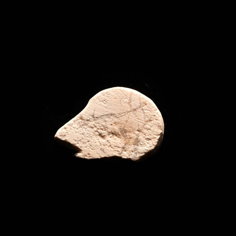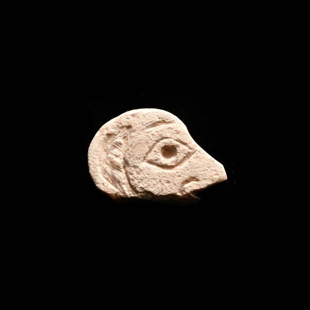 Dargestellt ist ein Männergesicht im Profil, mit markanter Nase, abfallender Stirn, rasiertem Kopf, verkürztem Ohr und einem großen Auge, das durch eine gebohrte Pupille betont wird. In vollständigeren Beispielen werden auch Männer mit glattrasierten Gesichtern dargestellt, was darauf schließen lässt, dass sie an einer religiösen Zeremonie teilnahmen, die eine rituelle Reinigung des Körpers erforderte.