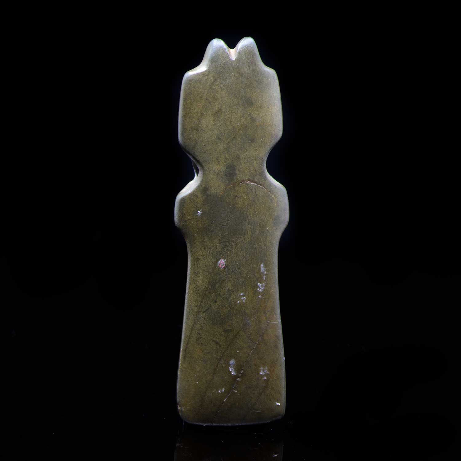 Dieser frühe Anhänger stammt wahrscheinlich aus Guanacaste und hat die Form einer Kelte oder Axt, wobei die Spitze in Form eines Eulenkopfes und -torsos gearbeitet ist. Kreisförmige Augen und ein breiter, nach unten gebogener Schnabel definieren den Kopf über gefalteten Flügeln, in einer einfachen Version des klassischen costaricanischen Vogelanhängers aus Jade. Der Vogelkeltenanhänger wurde in den folgenden Jahrhunderten vielen Ausarbeitungen unterzogen, wobei diese wesentlichen Merkmale stets erhalten blieben.