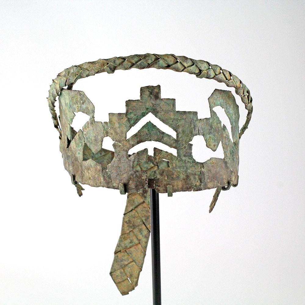 Zustand : Professionelle Konservierung durchgeführt, die leichte Oberflächenreinigung und Entfettung, Neuausrichtung der Vorderseite und erneutes Verkleben kleiner Brüche umfasste. Etwas Verlust an einer Seitenlasche, ansonsten ist die Tiara intakt und insgesamt in ausgezeichnetem Zustand. Das Armband ist intakt und insgesamt in ausgezeichnetem Zustand, beide Objekte mit guter, altersgemäßer grüner Patina. Mit maßgefertigter Halterung in Museumsqualität. Ein professioneller Behandlungs- und Zustandsbericht begleitet dieses Objekt und ist auf Anfrage erhältlich.