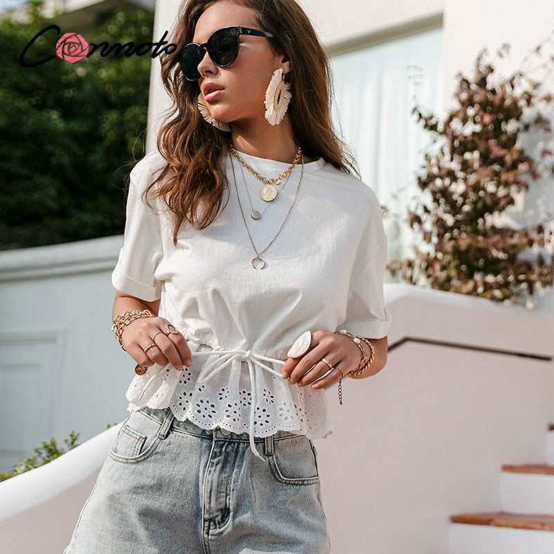 Conmoto Lässiges weißes T-Shirt mit Kordelzugbund und Rüschen, O-Ausschnitt, kurzärmelig, T-Shirts aus Baumwolle, elegante Urlaubsoberteile, Sommer