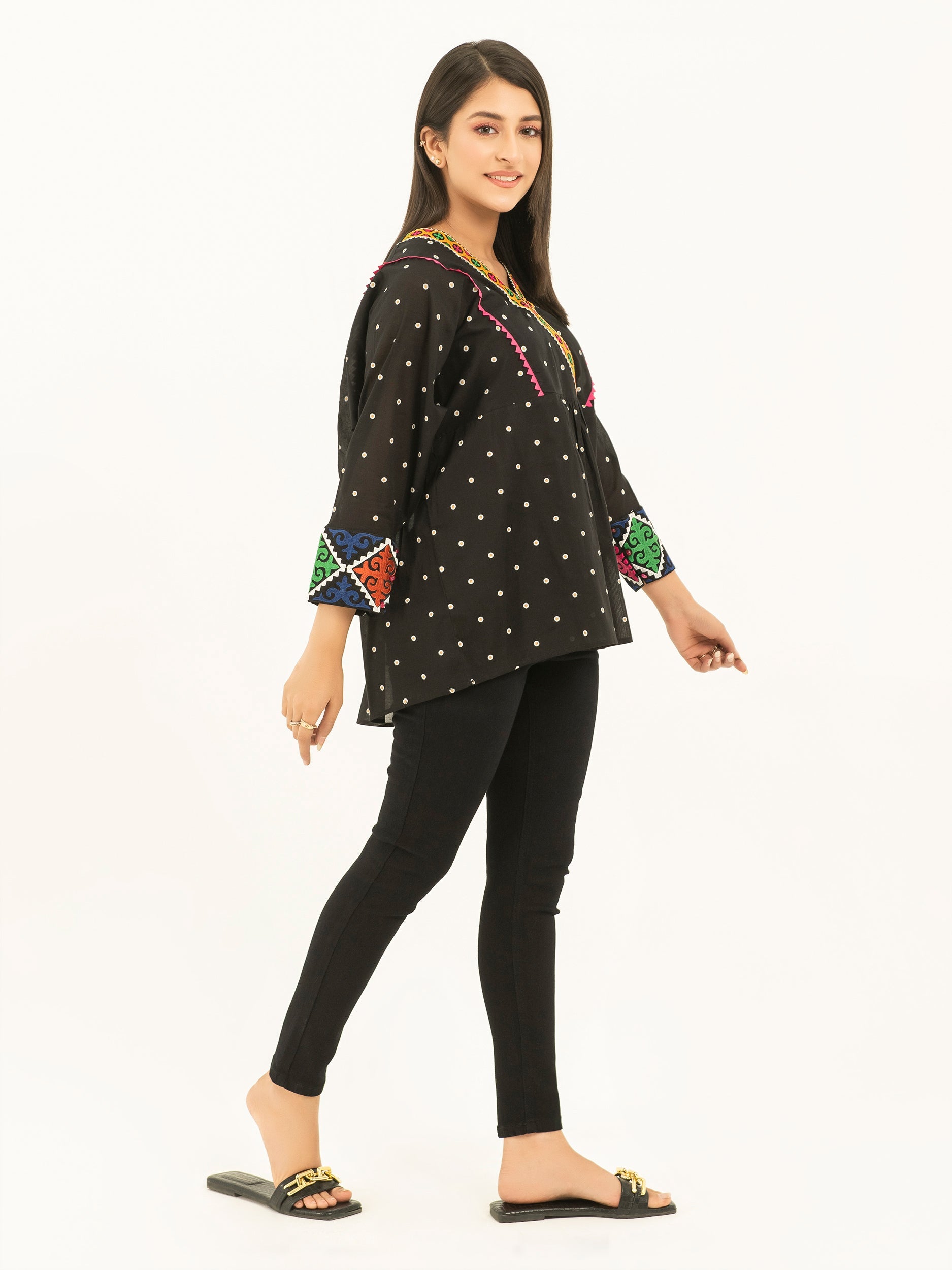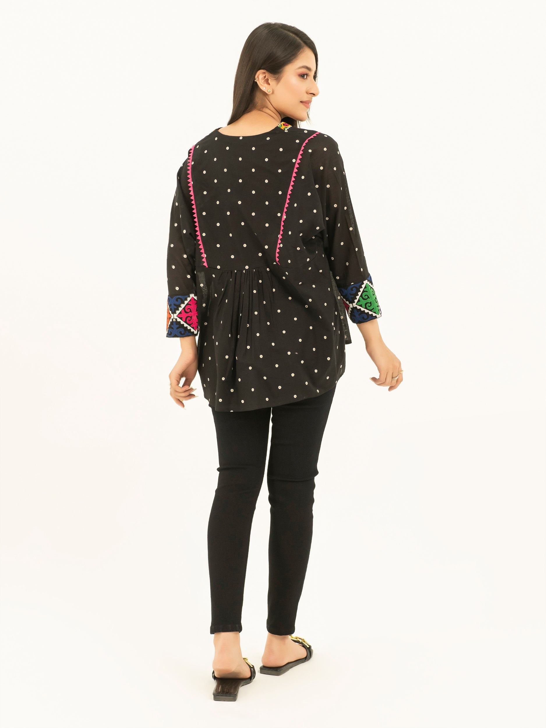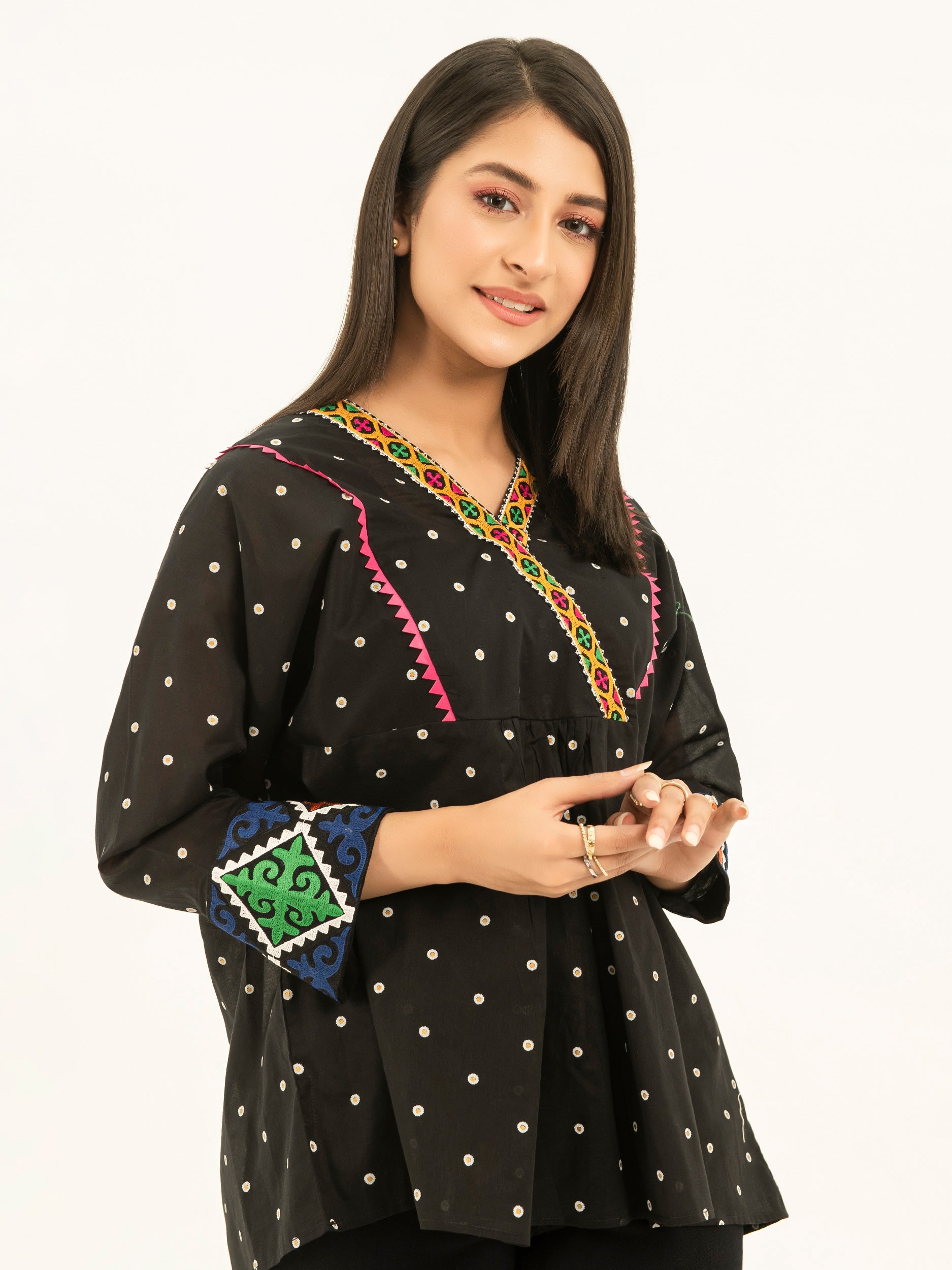 - Ätherisches Stickmuster am Halsausschnitt, an der Knopfleiste und an den Manschetten