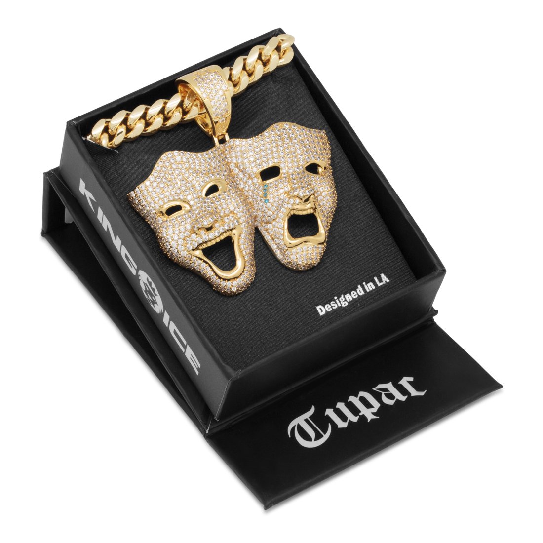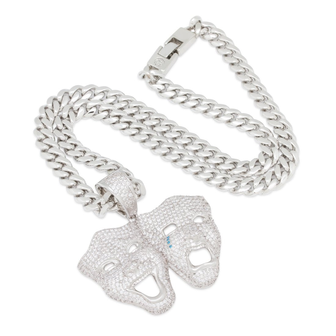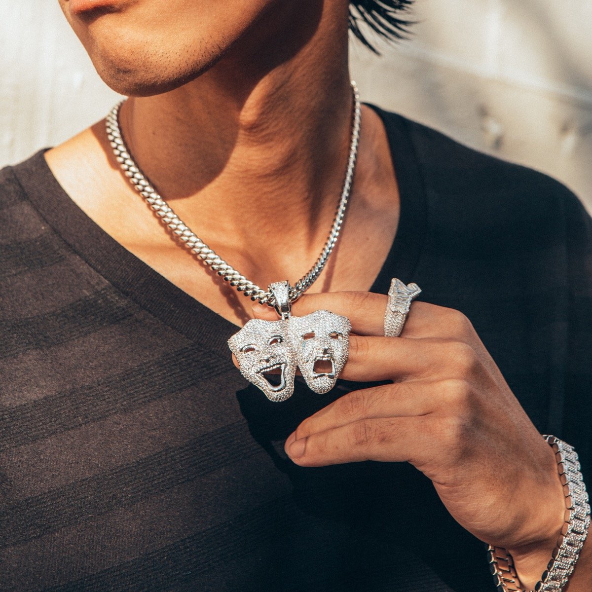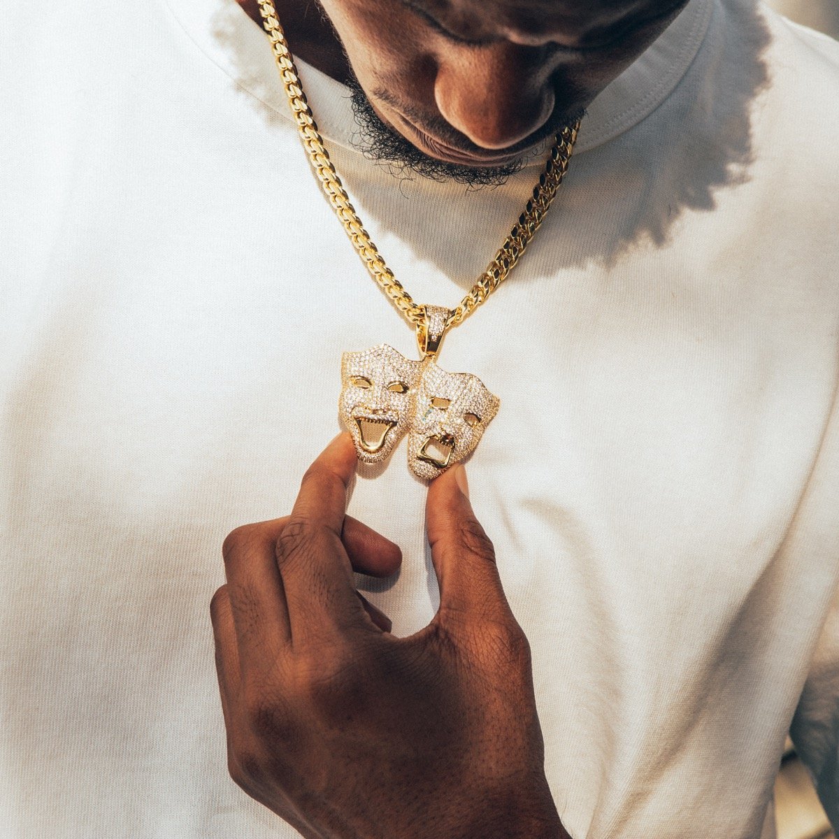 Dieser Anhänger wurde vom legendären West Coast Hip Hop, den Tragedy and Comedy Masks, inspiriert. Die gesamte Oberfläche des Stücks ist mit Steinen bedeckt und weist ein blaues Steintränendetail auf.