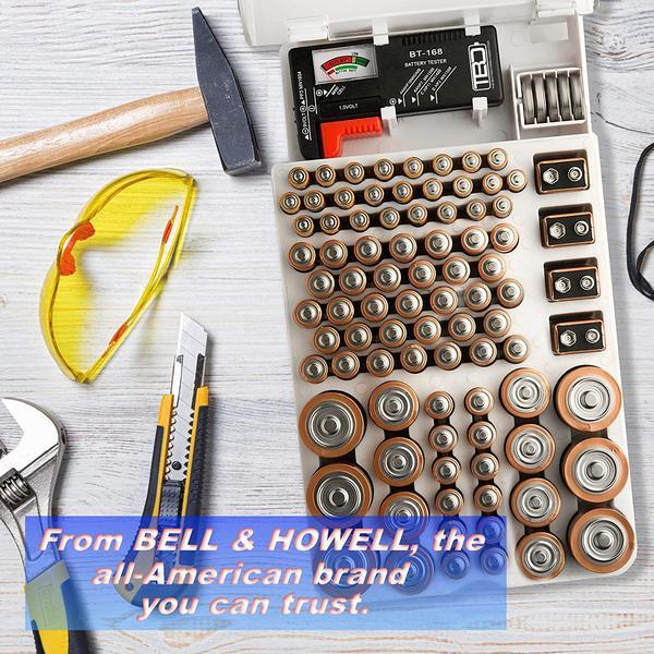 • Hält bis zu 93 Batterien der verschiedenen Größe; 45 AA, 25 AAA, 4 9 Volt, 8 c, 6 d und 5 flache Batterien.