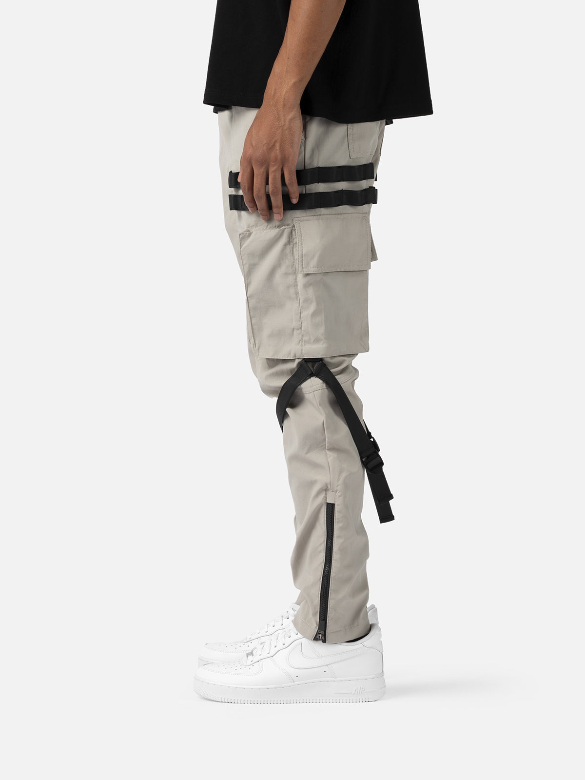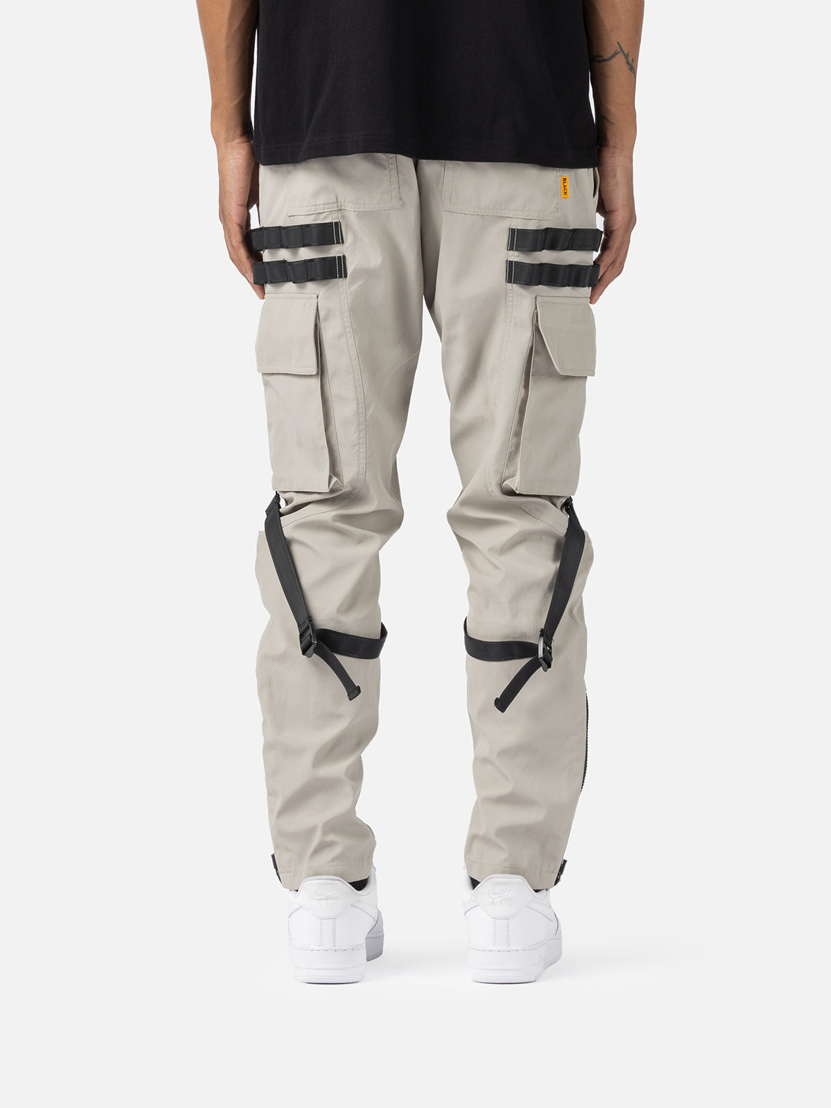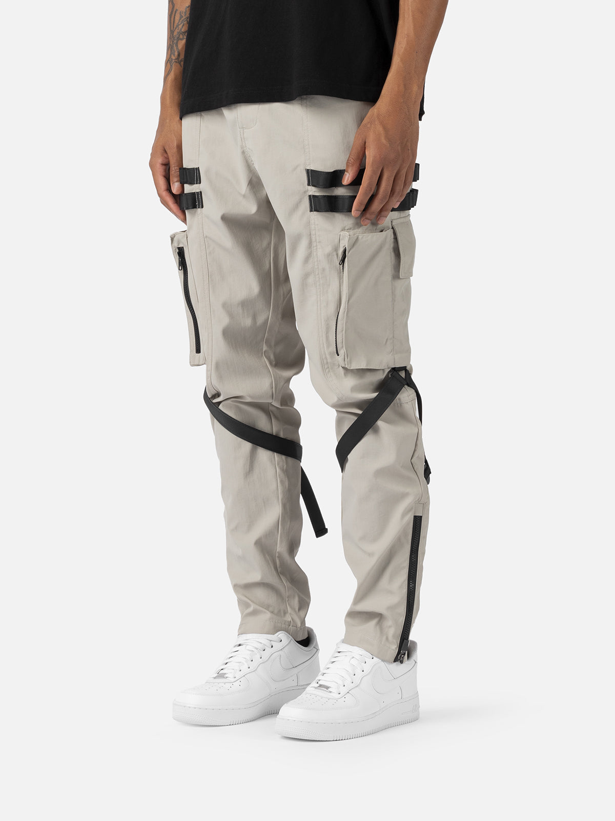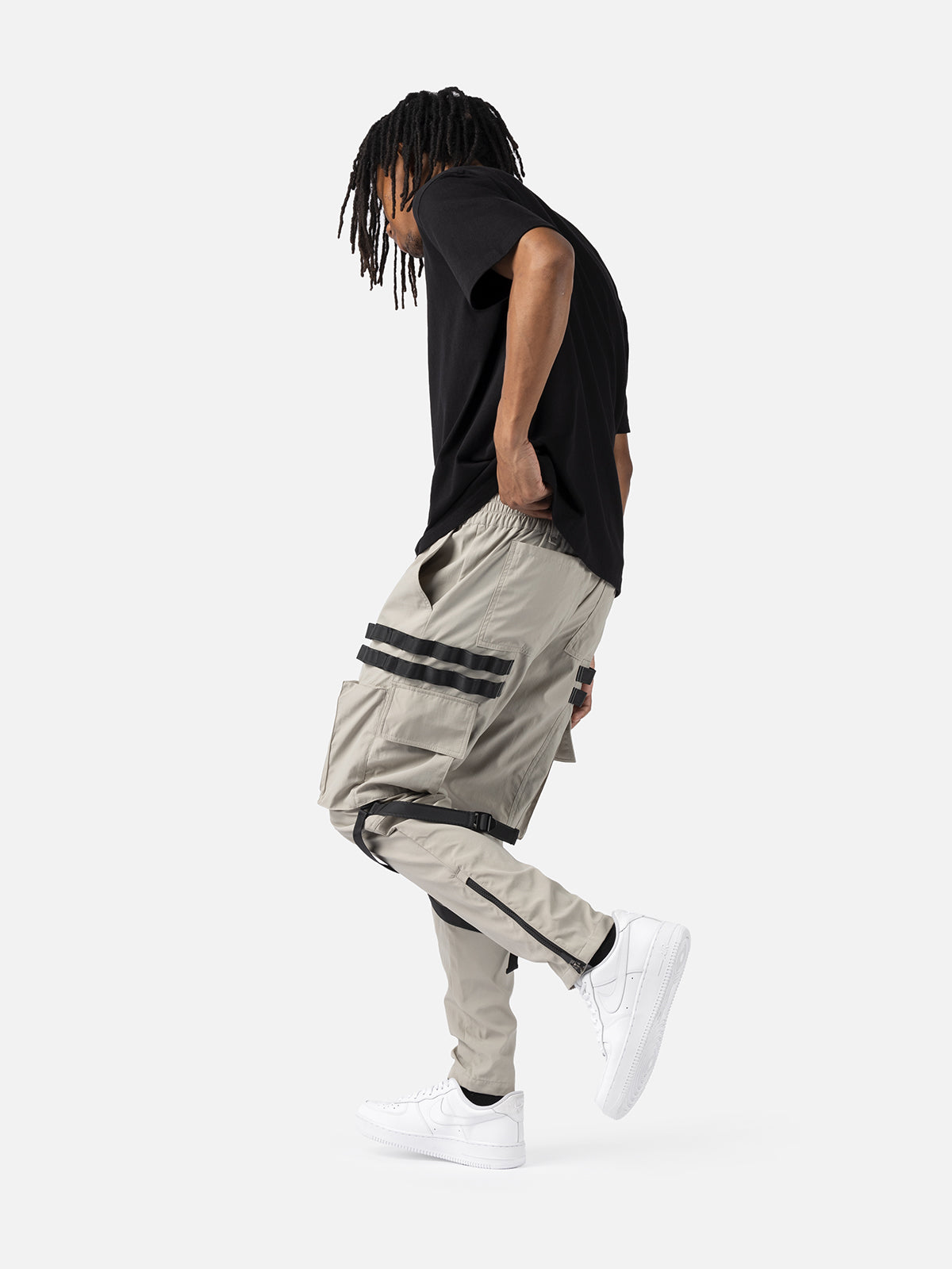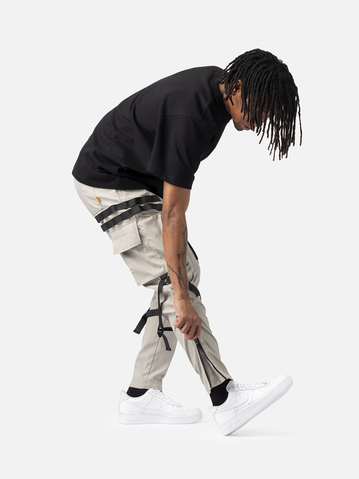 Der T1 Cargo ist aus verstärktem Nylon gefertigt und verfügt über eine Streifenverzierung, einen Reißverschluss und Pattentaschen an der Seitennaht. Abgerundet wird das Ganze durch Gurtband- und Schnallenverzierungen an der Wade.