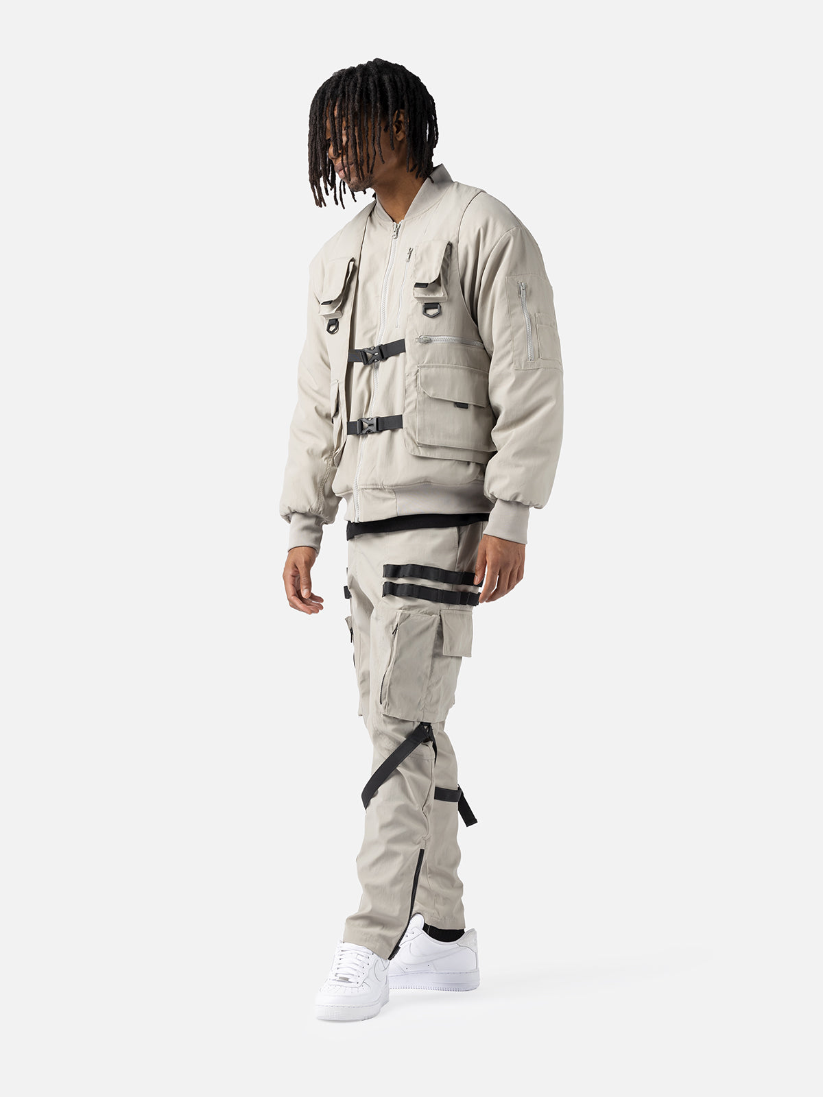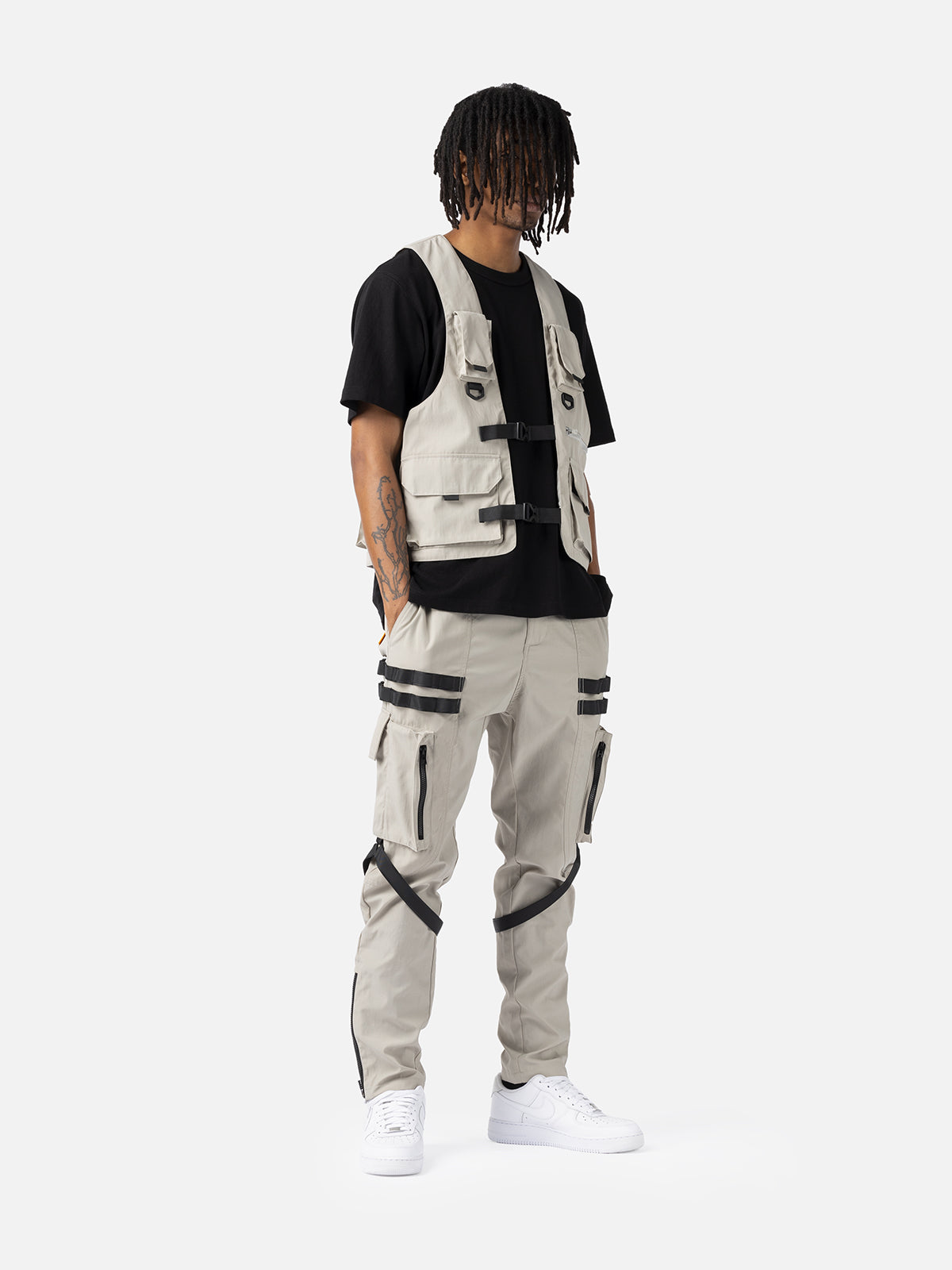 Die aus verstärktem Nylon gefertigte Tactical Vest verfügt über fünf funktionelle Taschen auf der Vorderseite und eine geräumige Pattentasche auf der Rückseite. Die Weste wird vorne in der Mitte mit Gurtbändern und Schnallen befestigt.