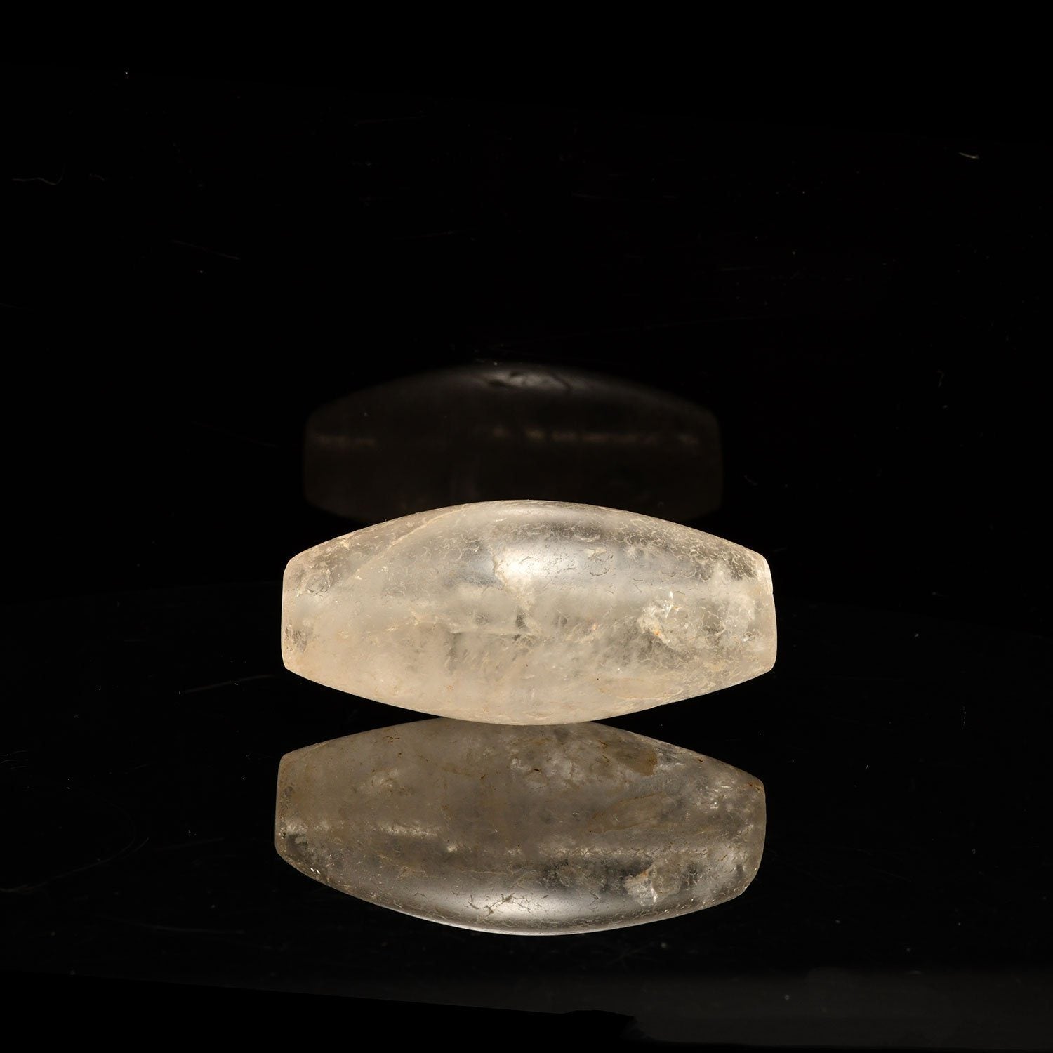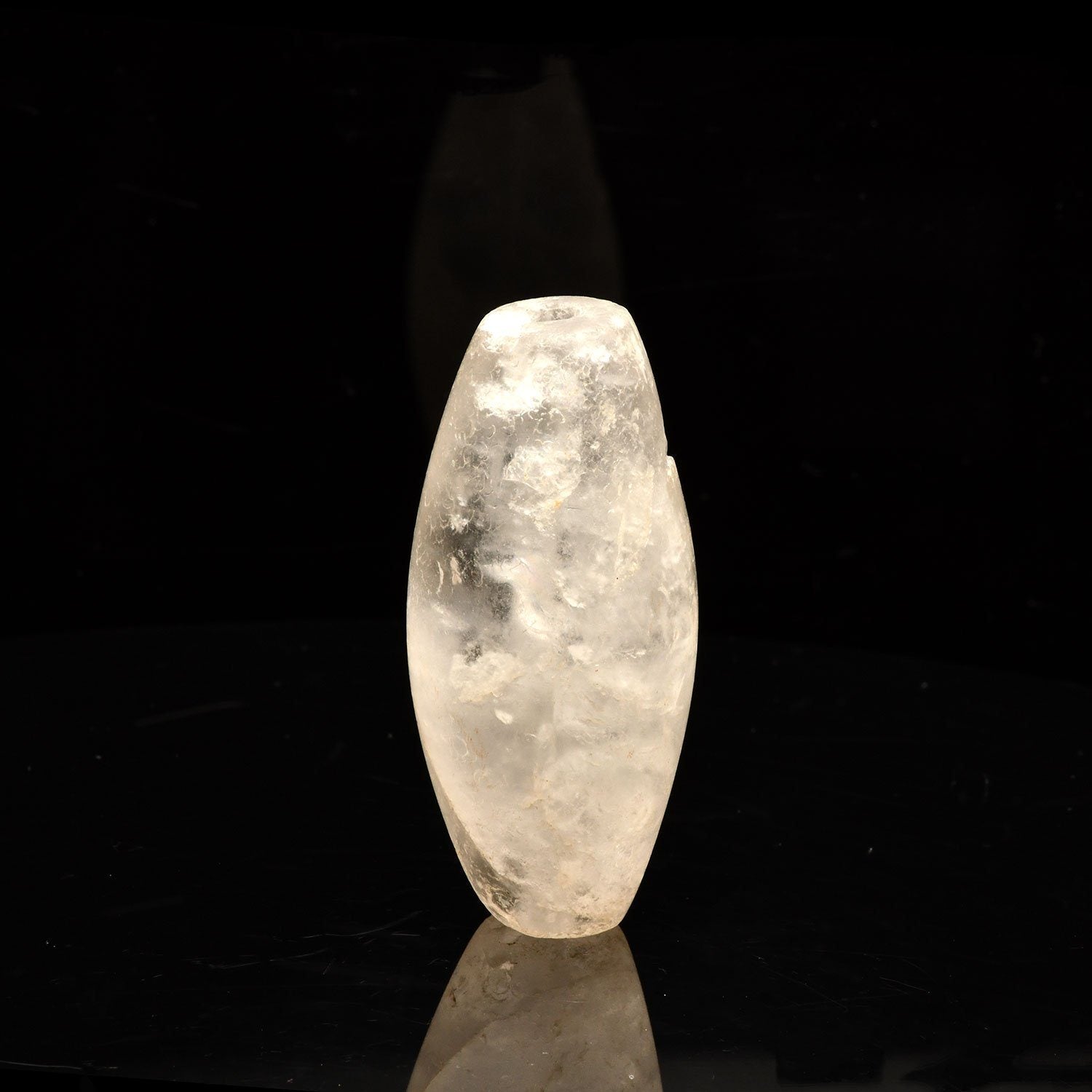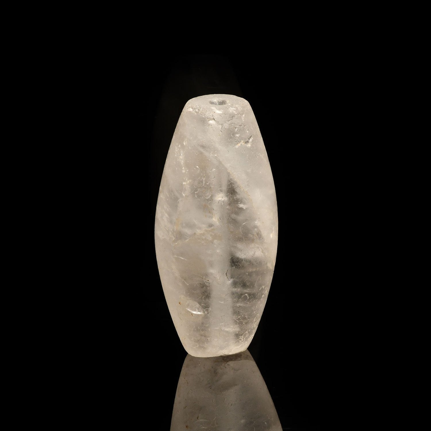 Eine sehr große und eindrucksvolle tonnenförmige Perle, handgeschnitzt aus klarem Quarz, mit einer Längsbohrung zur Aufhängung.
