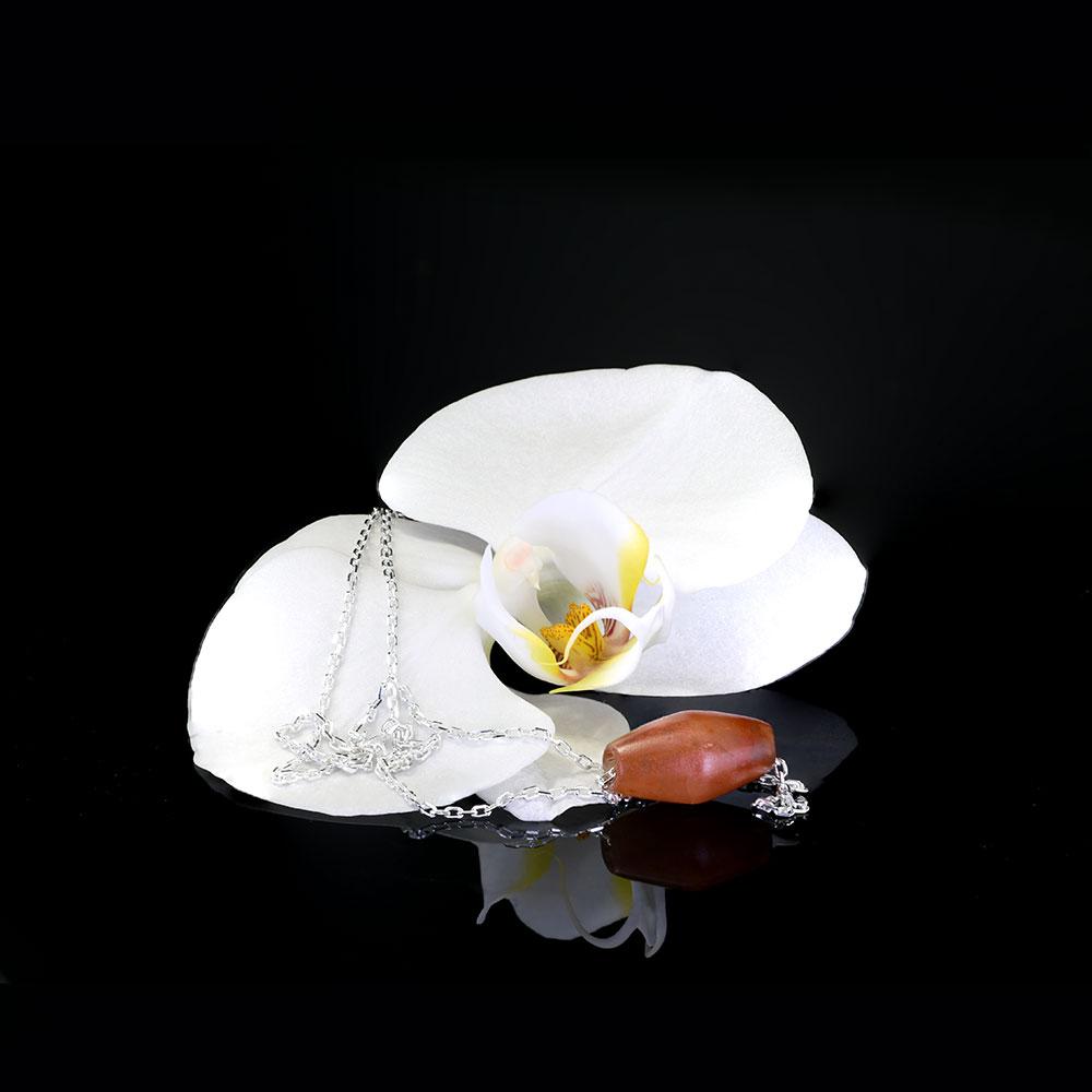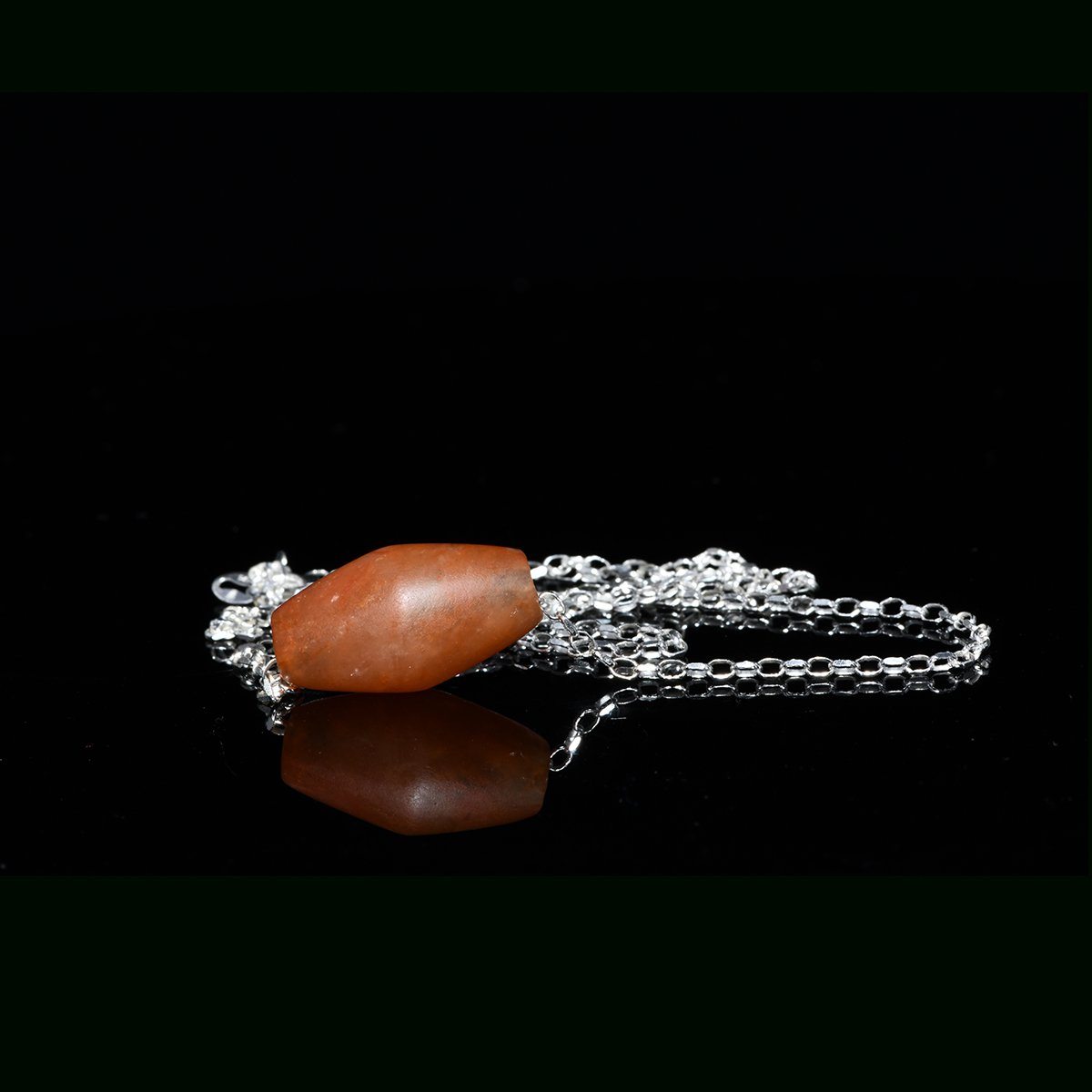 Dieses primitive Juwel blieb in der tonnenförmigen Perle erhalten und wurde im Mittleren Reich zu einem wesentlichen persönlichen Schmuckstück bei Bestattungsritualen.  Solche Perlen wurden um den Hals oder auf die Brust des Verstorbenen gehängt und ursprünglich einzeln an einer Kordel getragen, die eng um den Hals gebunden war, oder an beiden Enden befand sich eine runde oder zylindrische Perle aus grüner Fayence oder Feldspat.  Dieses Karneol-Exemplar wurde auf eine moderne 20-Zoll-Silberkette aufgefädelt.