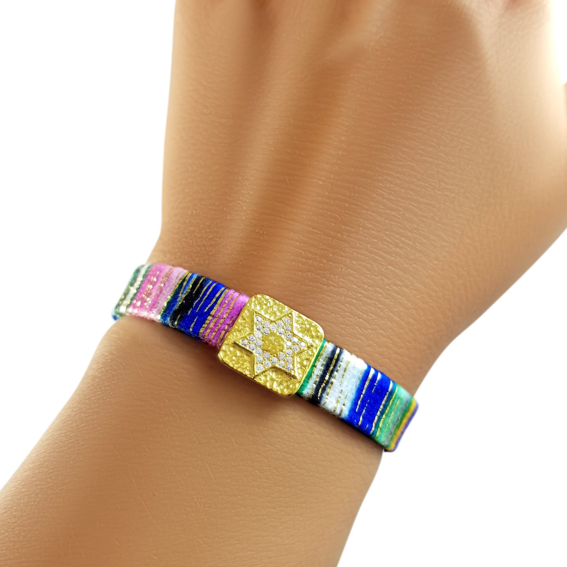 Dies ist ein so lustiges Davidstern-Armband mit stilvollen Quasten, die an der Rückseite baumeln. Der Look ist lustig und die Farben in Kombination mit dem auffälligen Design sind einfach perfekt!