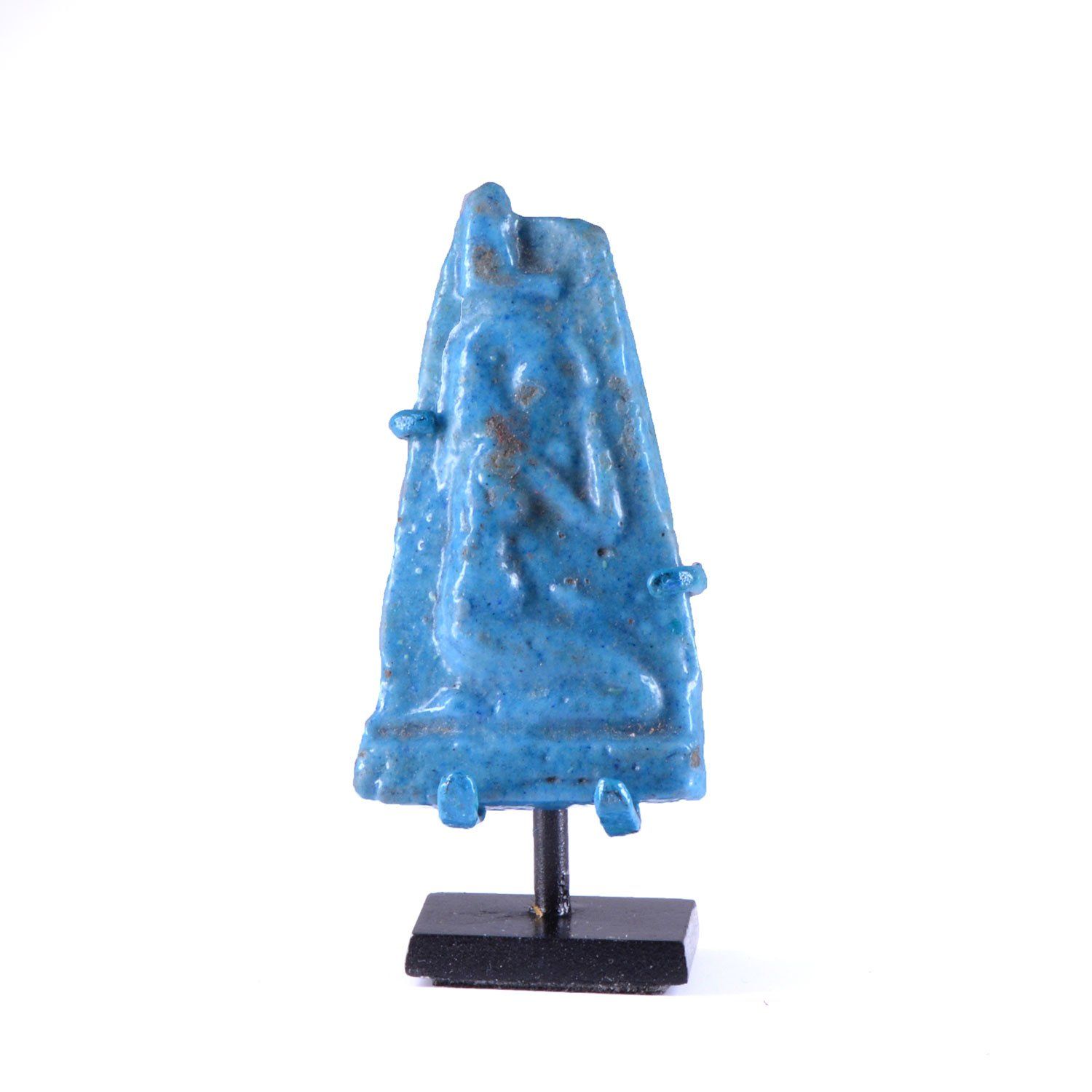 Ein trapezförmiges Fayence-Amulett in Form einer Plakette mit dem erhabenen Reliefbild der Göttin Isis. Die Göttin kniet auf einem niedrigen Sockel und hält ihre rechte Hand in einer Geste der Trauer vor ihr Gesicht.  Sie trägt ein langes Etuikleid und eine dreiteilige Perücke. Ihr charakteristischer Kopfschmuck ist eigentlich eine Hieroglyphenschrift ihres Namens: das Zeichen für einen Thron. Zwischen den vielen Lagen Leinenstreifen, in die Mumien eingewickelt wurden, wurden normalerweise zahlreiche Grabamulette platziert.  Bestimmte Amulette und ihre erforderliche Position am Körper sind in Grabtexten wie dem „Totenbuch“ aufgeführt. Amulette wurden manchmal direkt auf die Umhüllungen genäht oder in ein Perlennetz eingearbeitet, das die Mumie bedeckte. Dieses Amulett wurde mit einer flachen Unterseite modelliert und ist zur Befestigung durchbohrt.