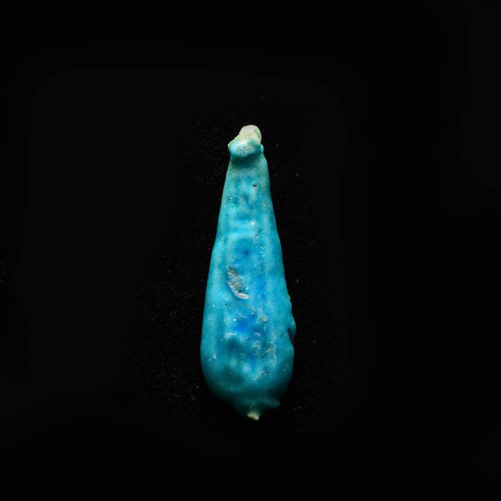 Aus leuchtend blau glasierter Fayence, das tropfenförmige Lotosende trägt die Inschrift einer Kartusche für Amenhotep III.