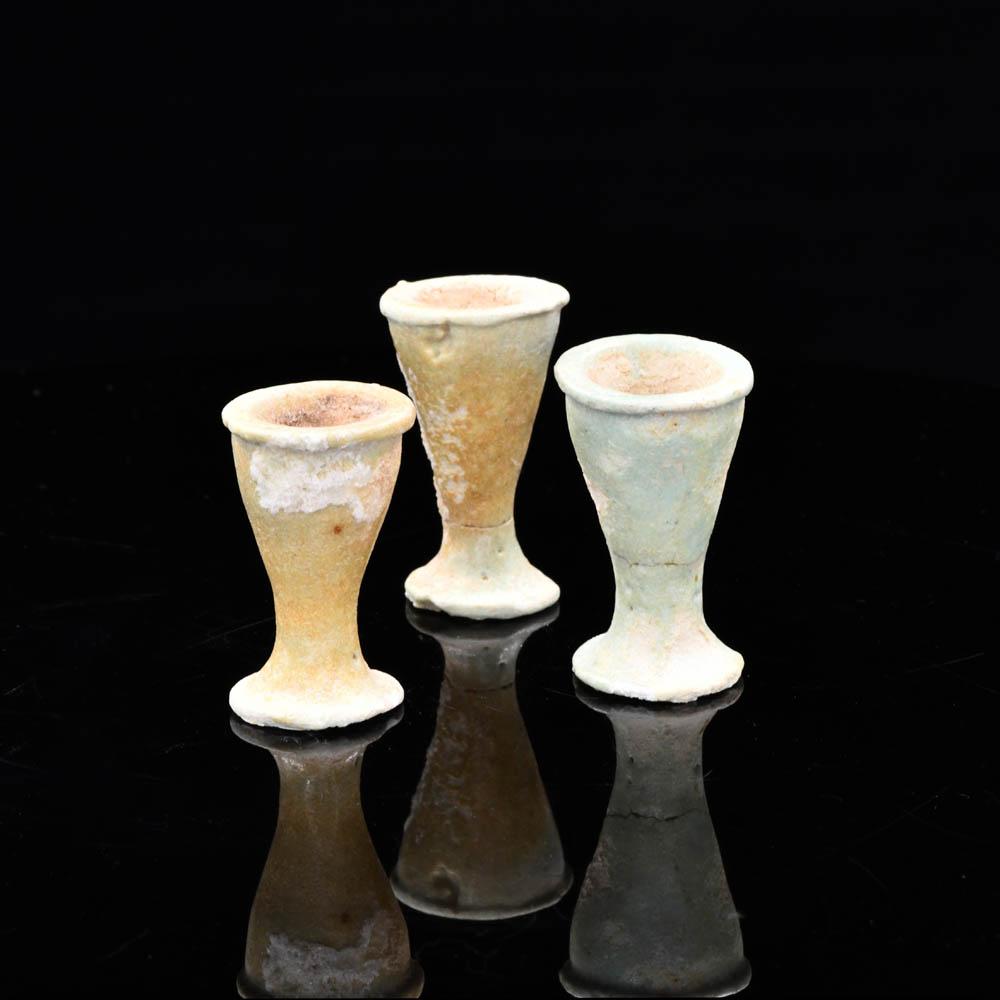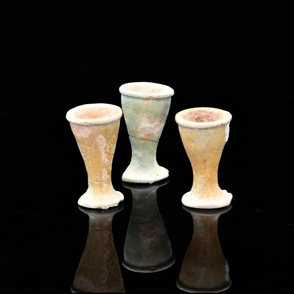 Diese zierlichen Exemplare bestehen aus blassgrüner Fayence-Zusammensetzung und haben nach außen gebogene Ränder. Der schmale zylindrische Körper verjüngt sich zu einer konischen Form mit Fuß, einer davon mit eingraviertem Hieroglyphenzeichen.