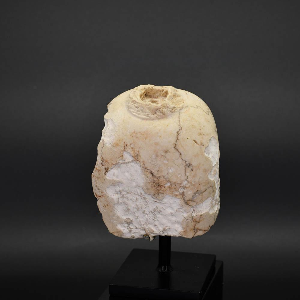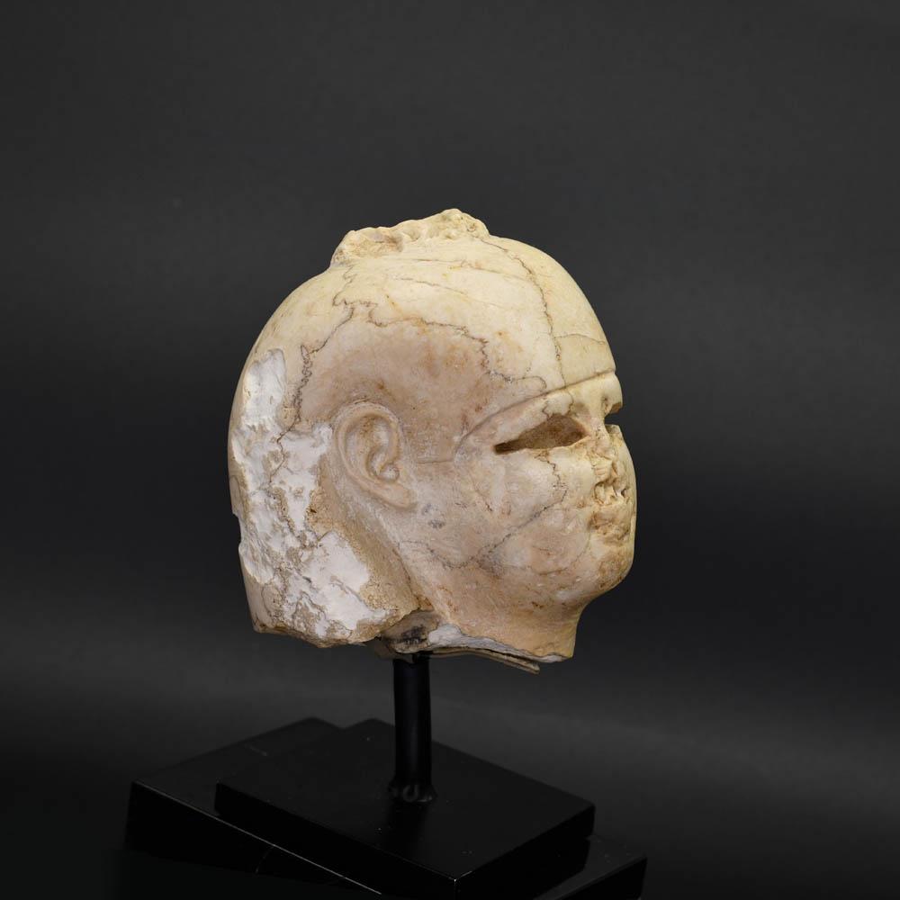 Zustand: Professionelle Konservierung durchgeführt, die leichte Oberflächenreinigung und Entfettung umfasste, kleinere Fehlstellen wurden aufgefüllt und stabilisiert. Die eingelegten Augen fehlen jetzt, die Rückseite und die Seiten weisen Verluste an der polierten Oberfläche auf, nur die Basis der Krone ist noch vorhanden. Trotz der Beschädigung präsentiert sich der Kopf außergewöhnlich gut und ist insgesamt in gutem Zustand.