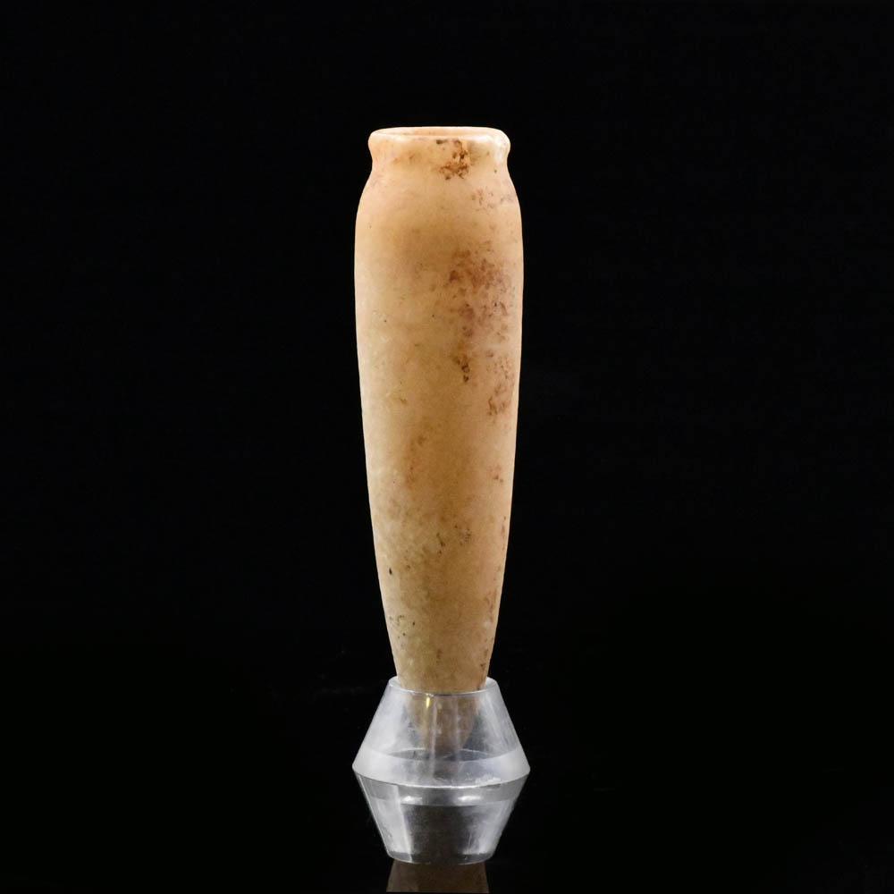 Dieses einzigartige Kosmetikgefäß aus dem Alten Reich aus cremefarbenem Alabaster verfügt über einen ausgestellten Rand, eine weite Öffnung und einen langen, schmalen Korpus, der sich zu einer spitzen Basis verjüngt.