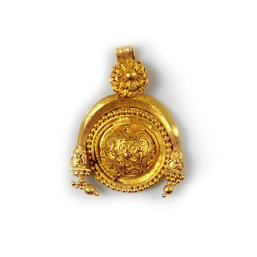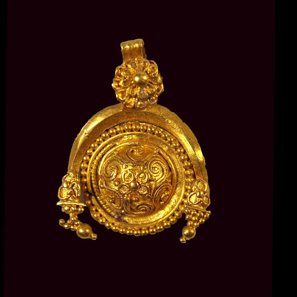 In Form einer Scheibe mit einem erhabenen zentralen Buckel, der mit Filigran und Granulation verziert ist, eingerahmt von Bändern aus gedrehtem und glattem Drahtfiligran und Granulation, die zu einer Mondsichel verbunden sind, wobei die Spitzen beide in einer Rosette mit drei Blütenblättern über umgekehrten Pyramiden aus Granulation enden, wobei die Aufhängeschlaufe mit einer zweistufigen Rosette mit einem Granulat in der Mitte versehen ist.
