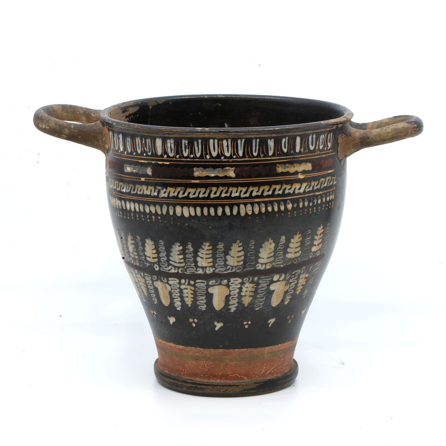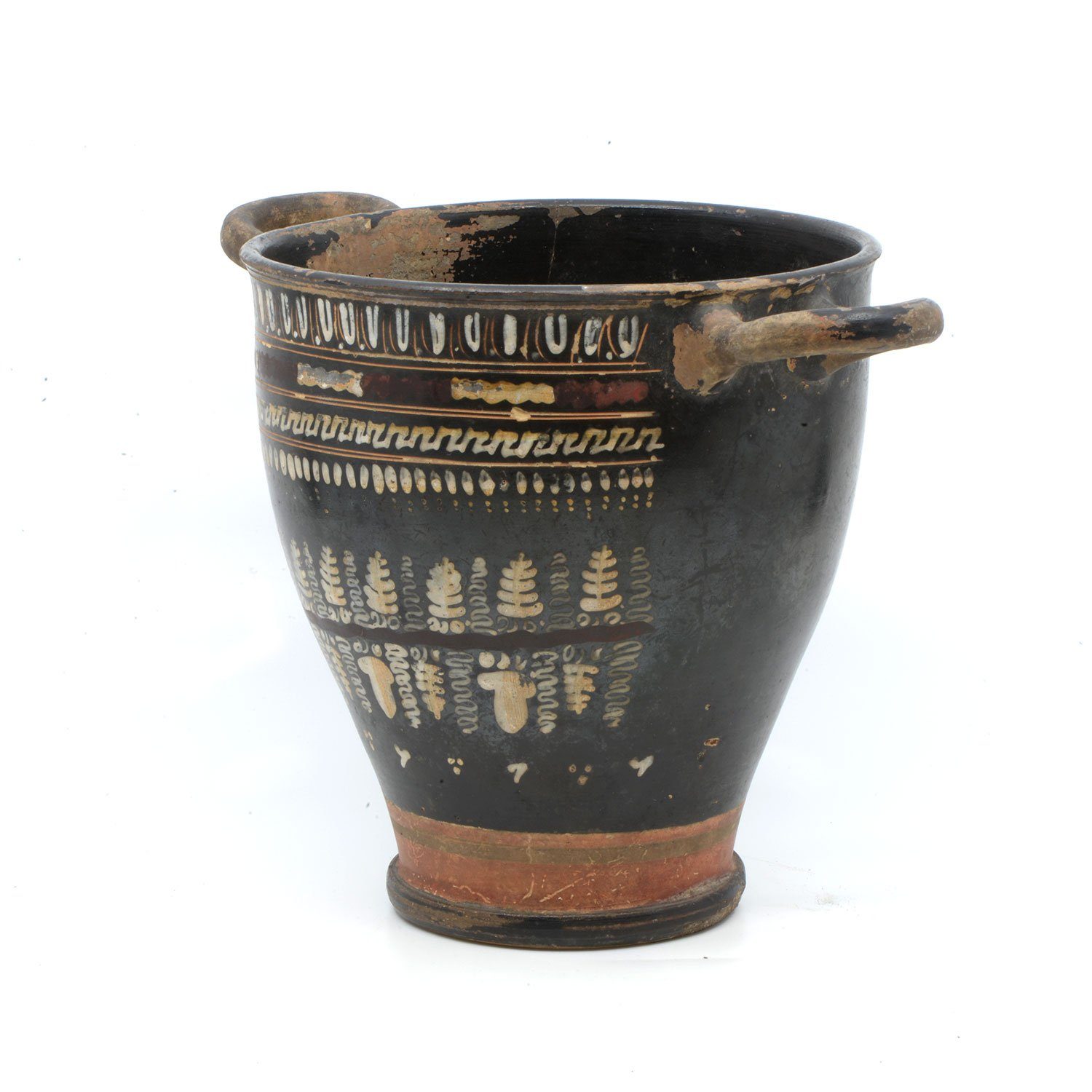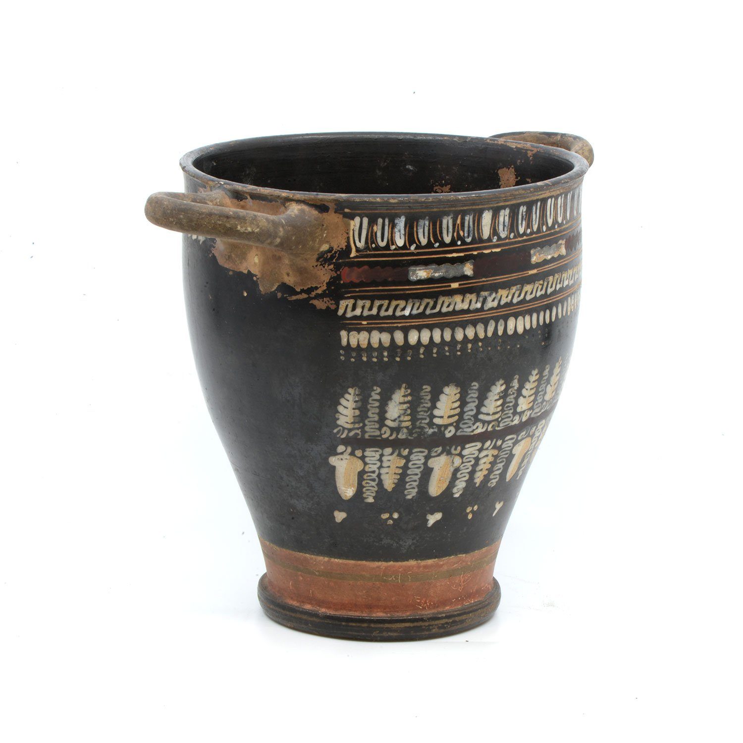 Ein großes Weintrinkgefäß auf einem niedrigen Rindensockel mit sich verbreiterndem Korpus, leicht gewölbtem Rand und zwei senkrecht zum Rand angebrachten Henkeln. Korpus mit weißem, gelbem und rotem Weintrauben- und Weinrankenmuster bemalt, darüber mehrere dekorative Bänder, die durch eingeschnittene Linien voneinander getrennt sind.