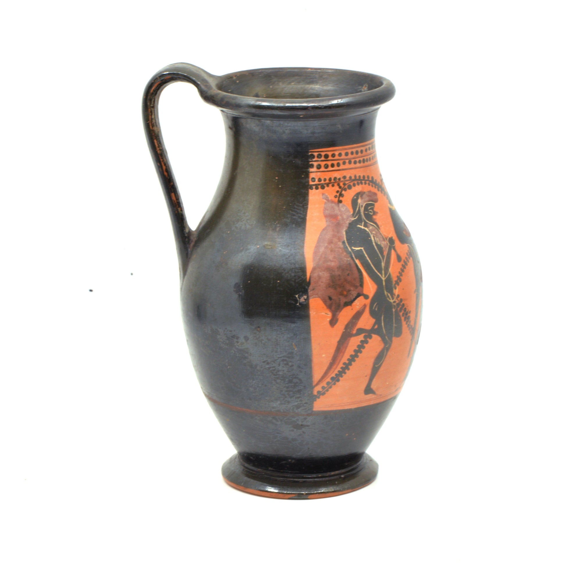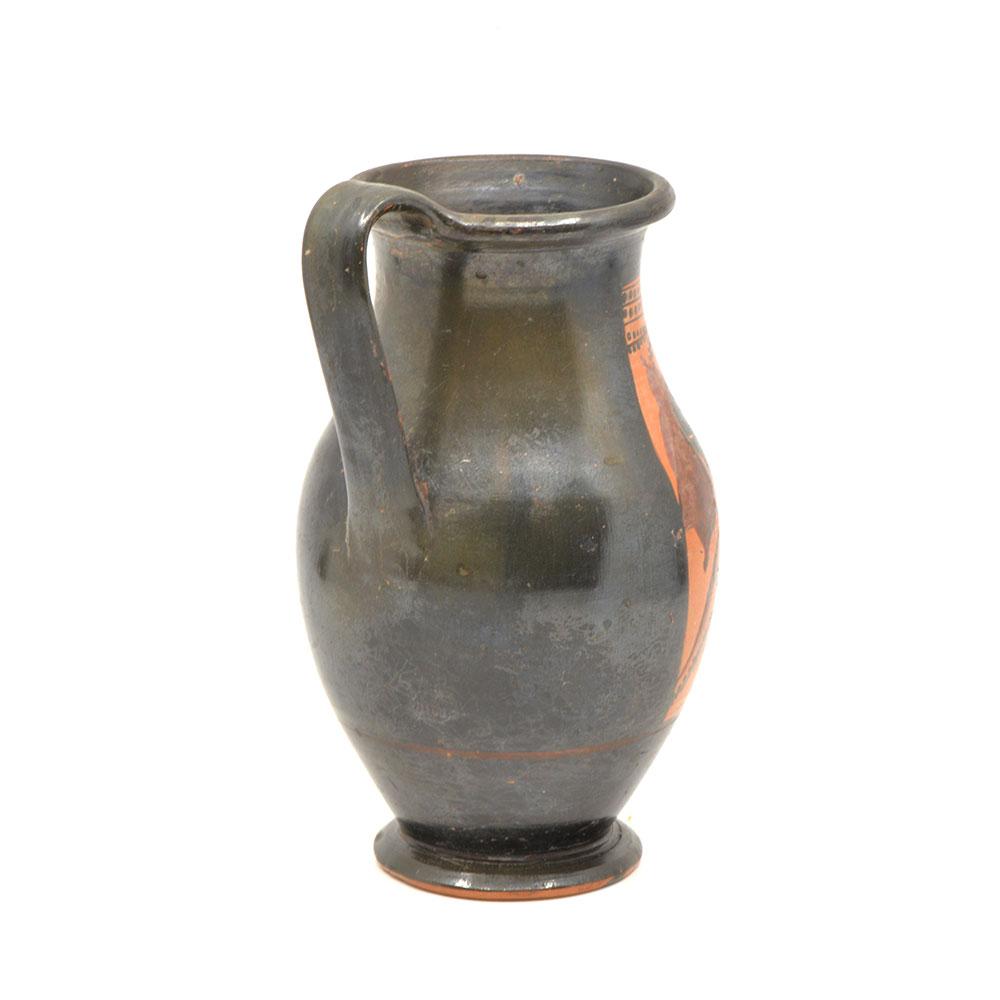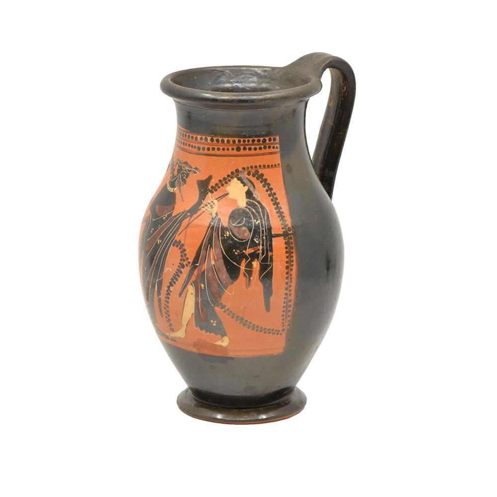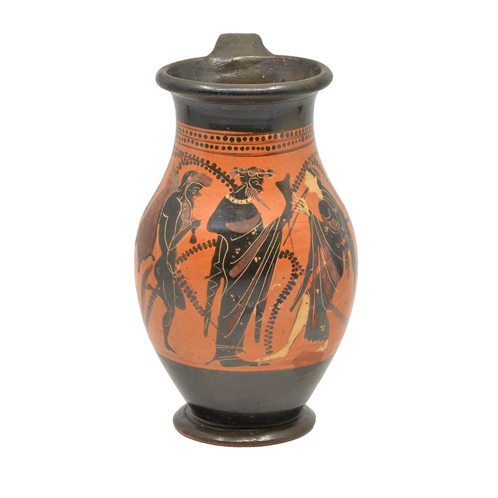Die Olpe ist eine Art Weinkrug, der in seiner Form einem modernen Krug ähnelt. Es ist ein sehr verbreiteter Vasentyp in der athenischen schwarzfigurigen Vasenmalerei im späten 6. Jahrhundert v. Chr., von etwa 525 bis etwa 500 v. Chr. Dionysos, der Weingott, und seine männlichen und weiblichen Begleiter (Satyrer und Mänaden) werden oft auf Olpai dargestellt, da dieses Motiv natürlich für die Verwendung der Form geeignet ist. Auf dieser Vase hält Dionysos ein Trinkhorn (Rhyton) und der Satyr (der einen vollen Weinschlauch über der Schulter trägt) und die Meanad tanzen. Dies ist ein für viele Olpai charakteristisches Bild.