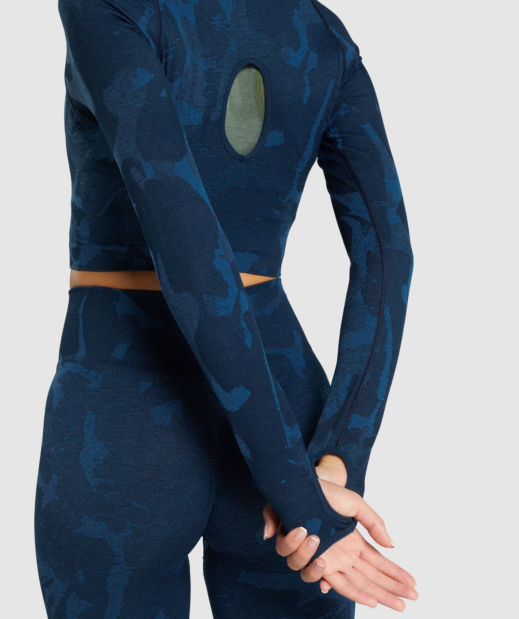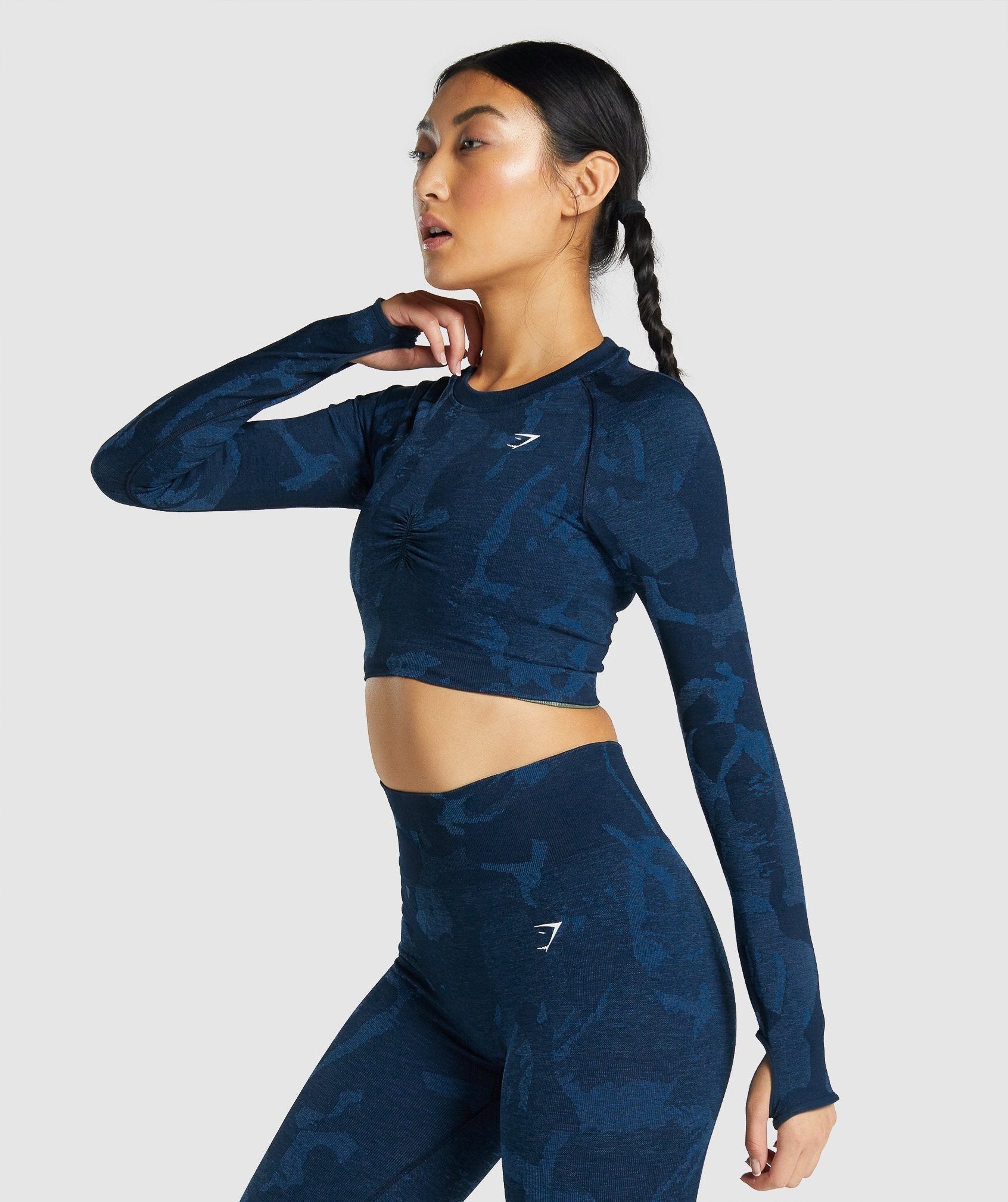 Gymshark Adapt Camo nahtloses Langarm Crop Top - Savanna | Marine