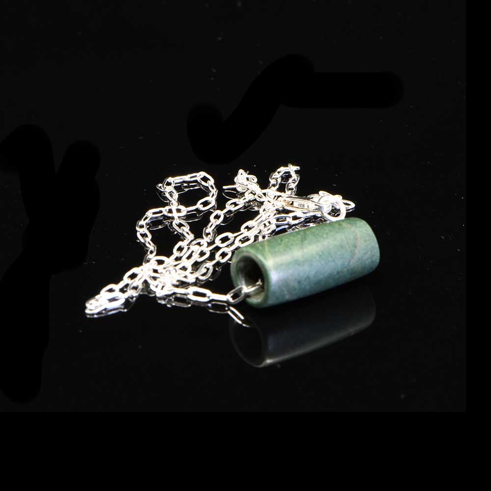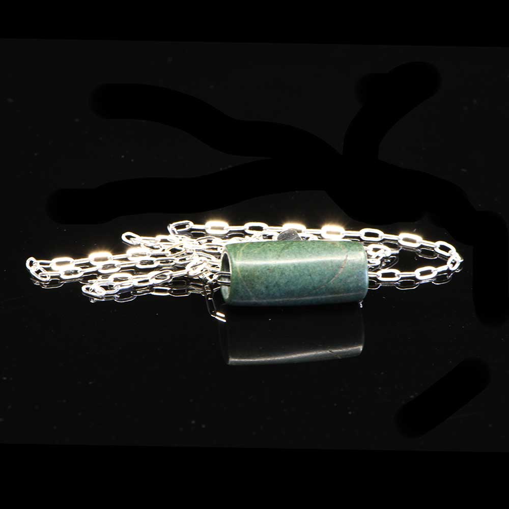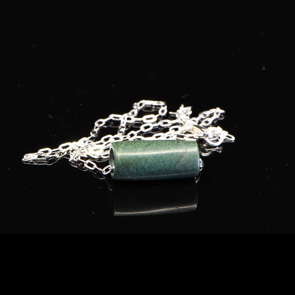 Die tonnenförmige Perle ist handgeformt und auf eine sanft polierte Oberfläche poliert. Als Halskette auf einer 18 Zoll langen Schlangenkette aus Sterlingsilber aufgereiht.
