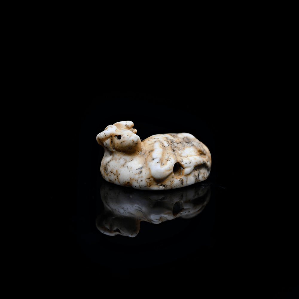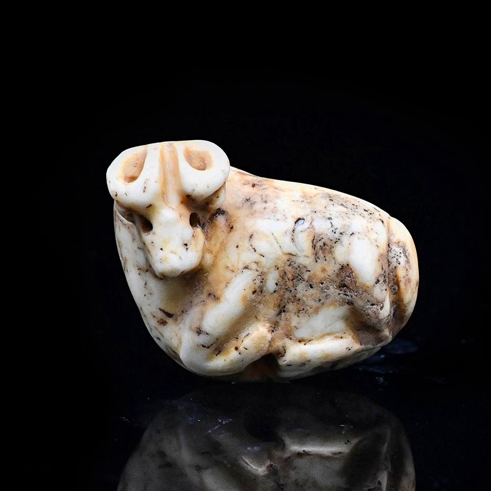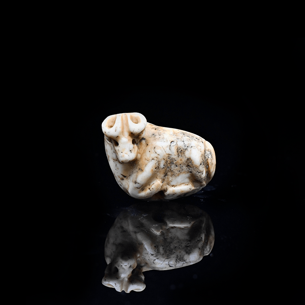 Feinfühlig aus Marmor modelliert, azoomorphes Stempelsiegel in Form eines liegenden Stiers mit klar dargestelltem Kopf, Hörnern und Beinen. Die Augen des Stiers sind durch Bohrlöcher angedeutet. Seitlich nahe der Basis zur Befestigung durchbohrt, die Unterseite mit zwei stilisierten Tieren durch markante Bohrlöcher und den Gliedmaßen durch eingeschnittene Linien, was eine taxonomische Identifizierung erschwert.