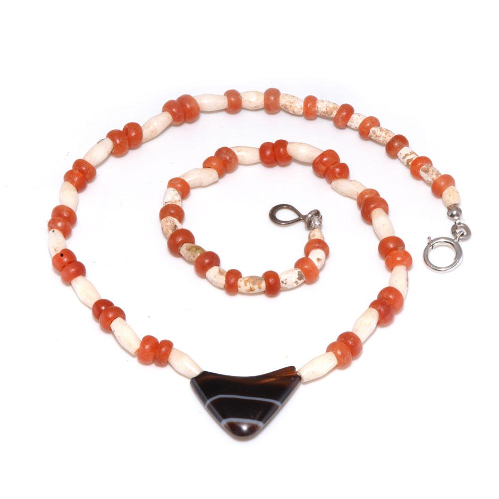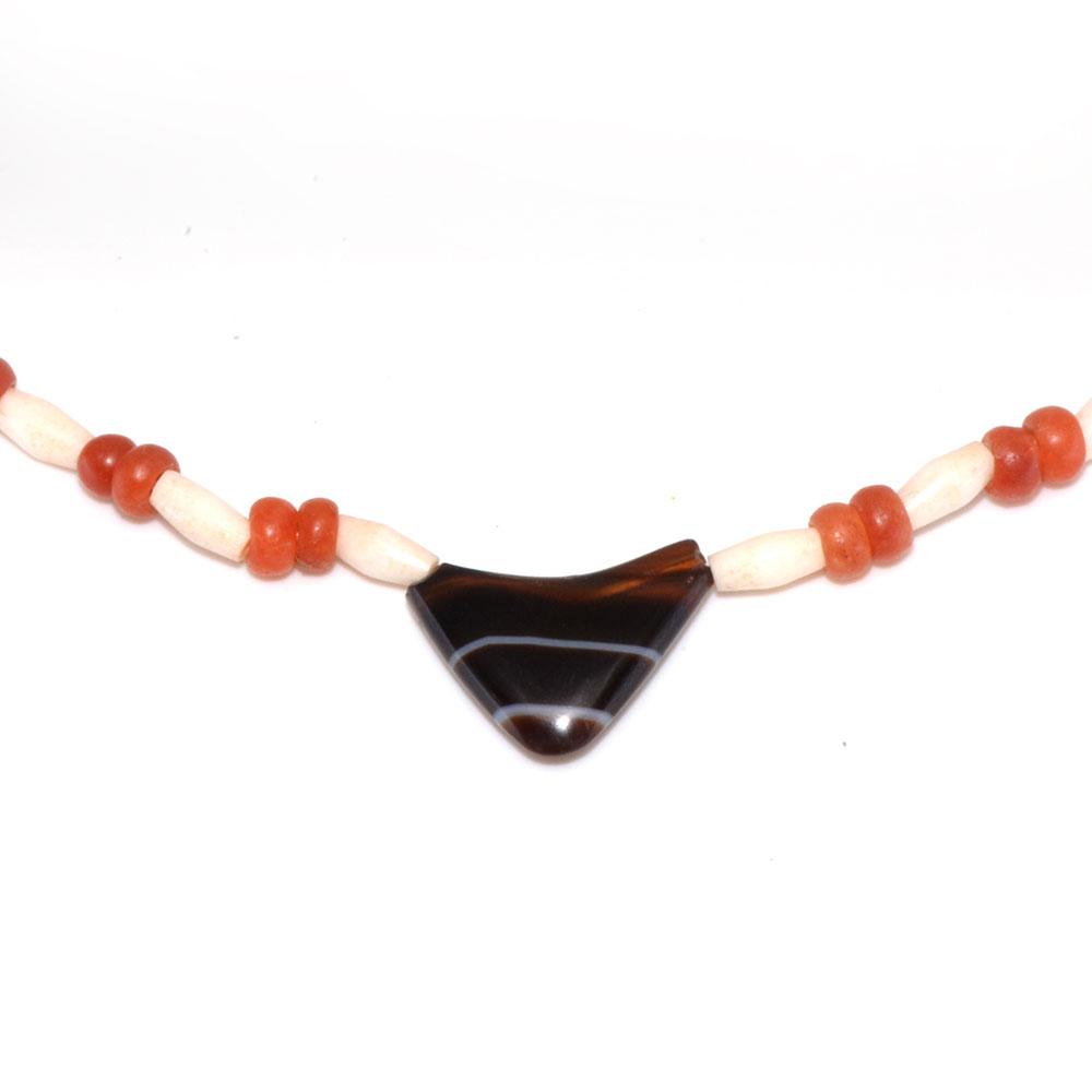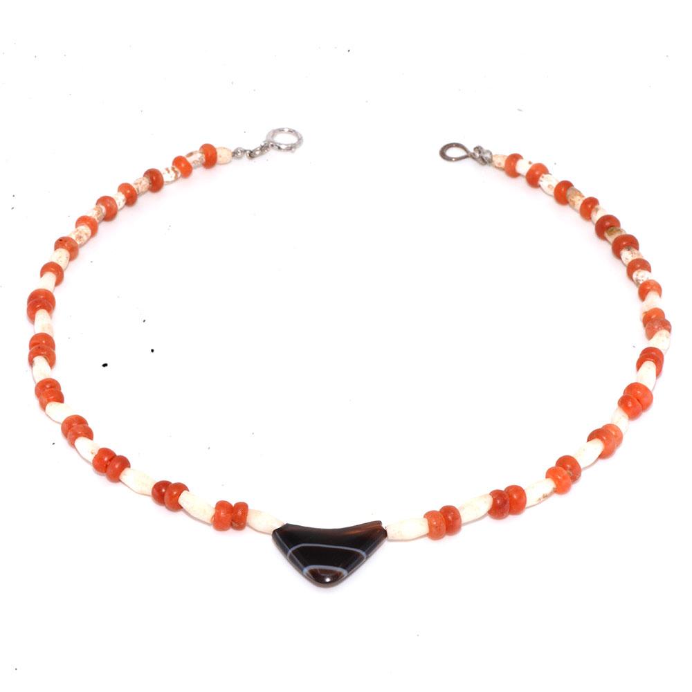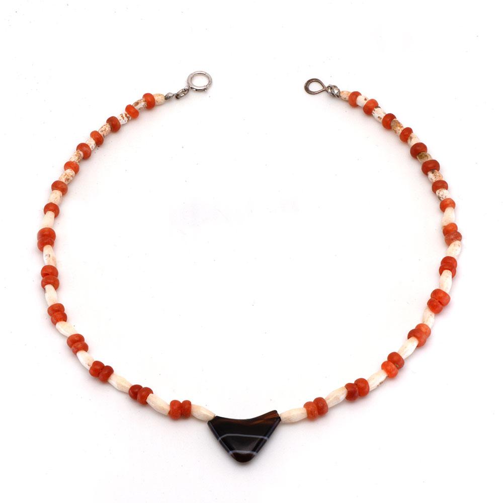 Eine Halskette aus Karneol- und Muschelperlen mit kleinen Muschelperlen, die sich mit Paaren kleiner Karneolperlen abwechseln, in der Mitte ein dreieckiger gebänderter Achatanhänger.
