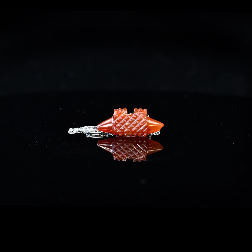 Diese ungewöhnliche Perle wurde aus wunderschönem, feurig rot-orangefarbenem Karneol geschnitzt und weist ein zentrales Rechteck mit präziser Schraffur auf, das an beiden Enden in einer Spitze endet, während in die Oberseite zwei kleine Aufhängeösen geschnitzt sind.