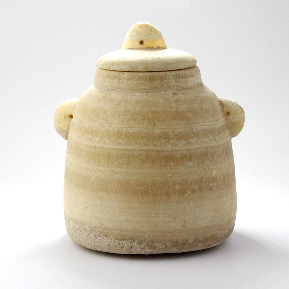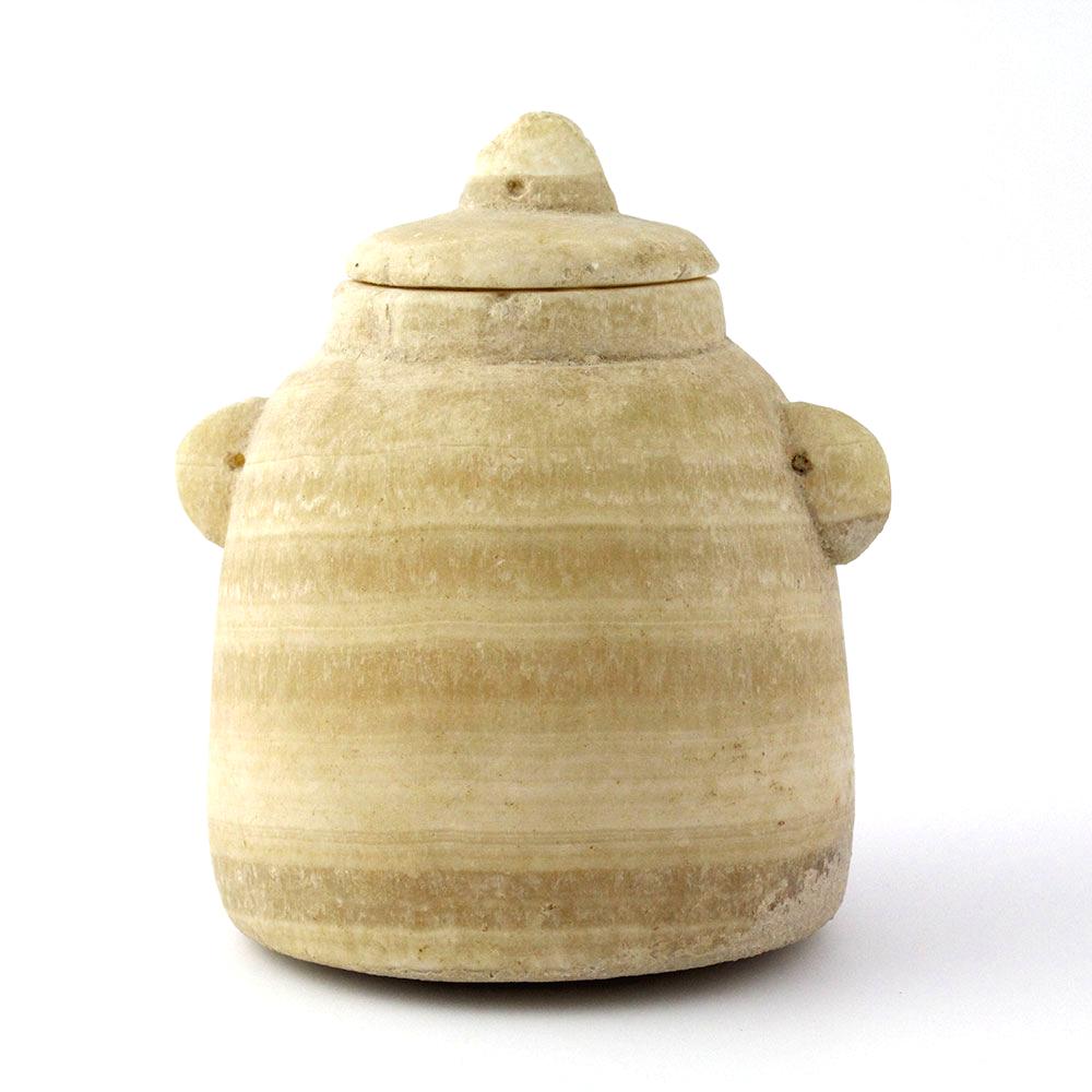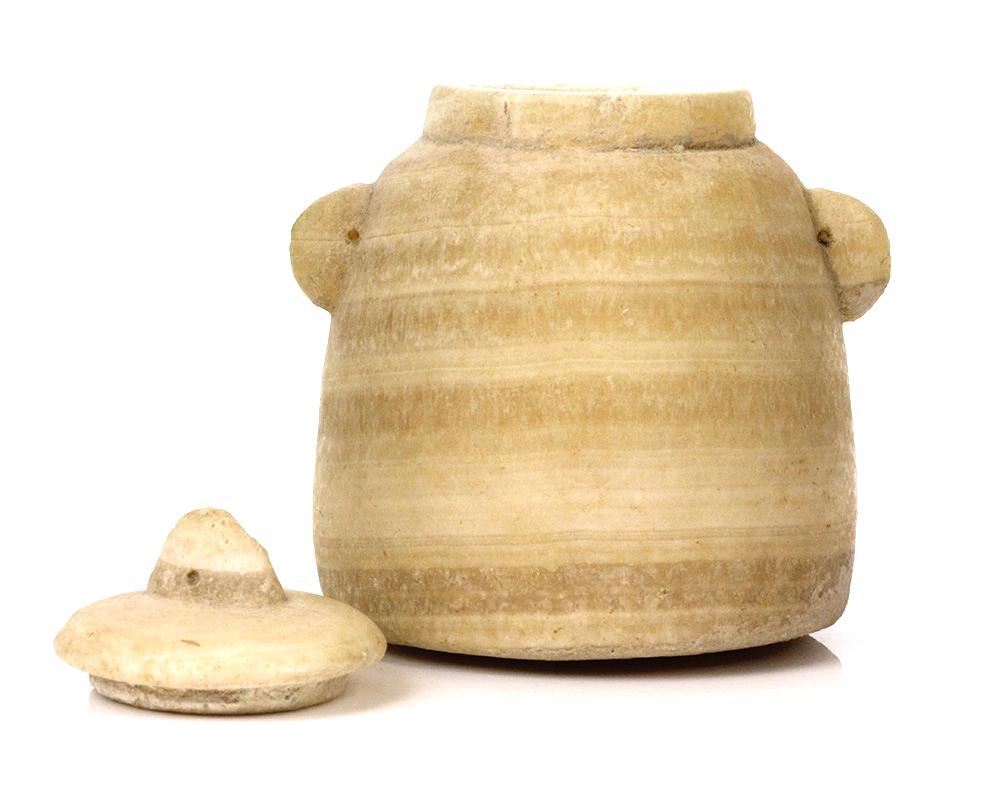 Dieses sogenannte „Bienenstock“-Gefäß aus gebändertem Alabaster hat eine konische Form, der gebänderte Alabasterkörper verjüngt sich zu einer flachen Basis und weist an der Schulter zwei kleine durchbrochene Ösengriffe auf.  Auch der dazugehörige Deckel weist mittig einen durchbrochenen Ösenabschluss auf.  Gefäße dieser besonderen Form wurden zur Aufbewahrung von parfümierten Ölen, aromatischen Gummiharzen, Weihrauch (Weihrauch oder Myrrhe) oder halbfesten Salben (aromatische Salben) wie dem „Balsam von Gilead“ verwendet, der in der Bibel als besonders wertvolles Gut beschrieben wird.  Solche Gefäße gehörten zu den begehrtesten und wertvollsten Handelsgütern des alten Arabien.