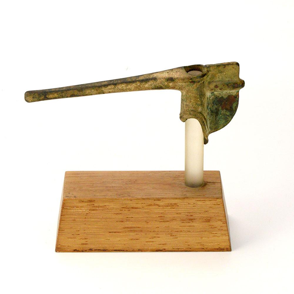 Charakteristisch für diesen besonderen Typ ist sowohl der ausgeschnittene, abgeschrägte untere Teil der Tülle als auch der Flanschstumpf mit horizontalem Grat; Tülle und Flansch haben einen dicken Umriss. Beispiele dieses Typs haben unterschiedliche Klingenformen (siehe Nr. 513), die sie als Meißel, Spitzhacken oder Äxte definieren, aber die schräge Tülle und der Flansch kennzeichnen diese Stücke als zur selben Gruppe oder Art gehörend. Das hier gezeigte Beispiel ist eine Axt: Die obere Kante ist horizontal, die untere wölbt sich bis zur Tülle.