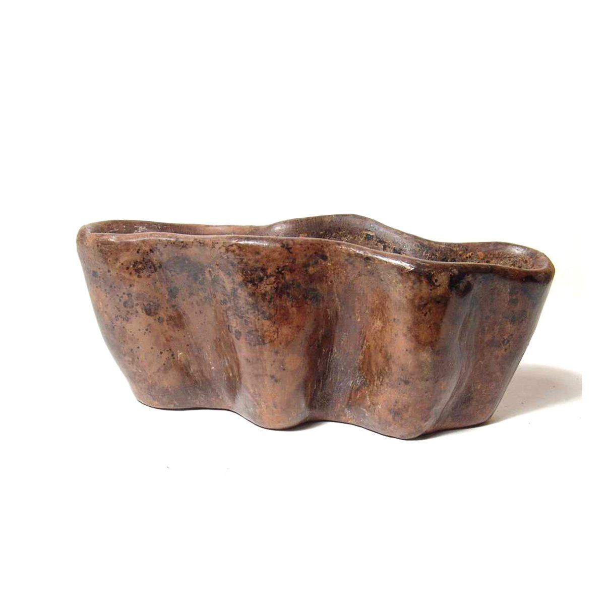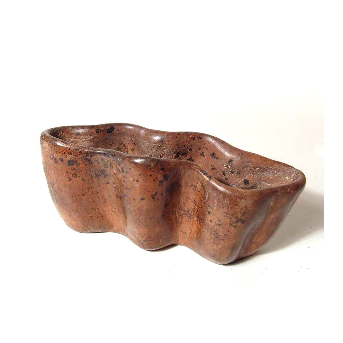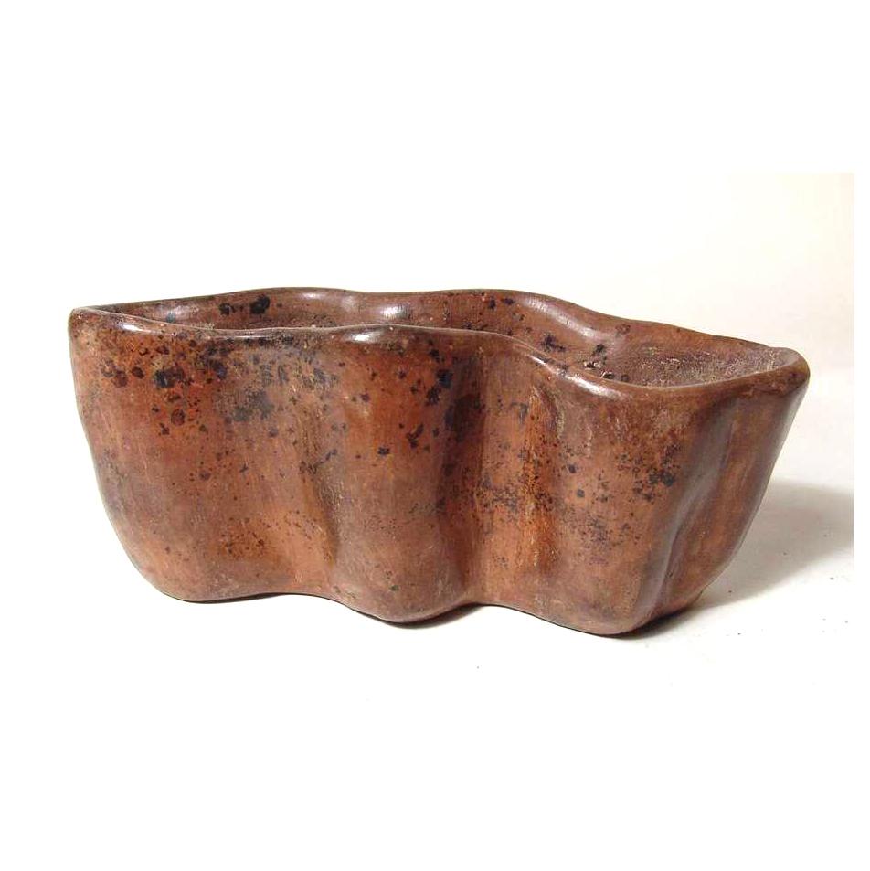 Ein schönes präkolumbisches Colima-Schlangengefäß mit interessanter Form und wunderschön polierten, glänzend braunen Oberflächen mit verstreuten Mineralablagerungen.