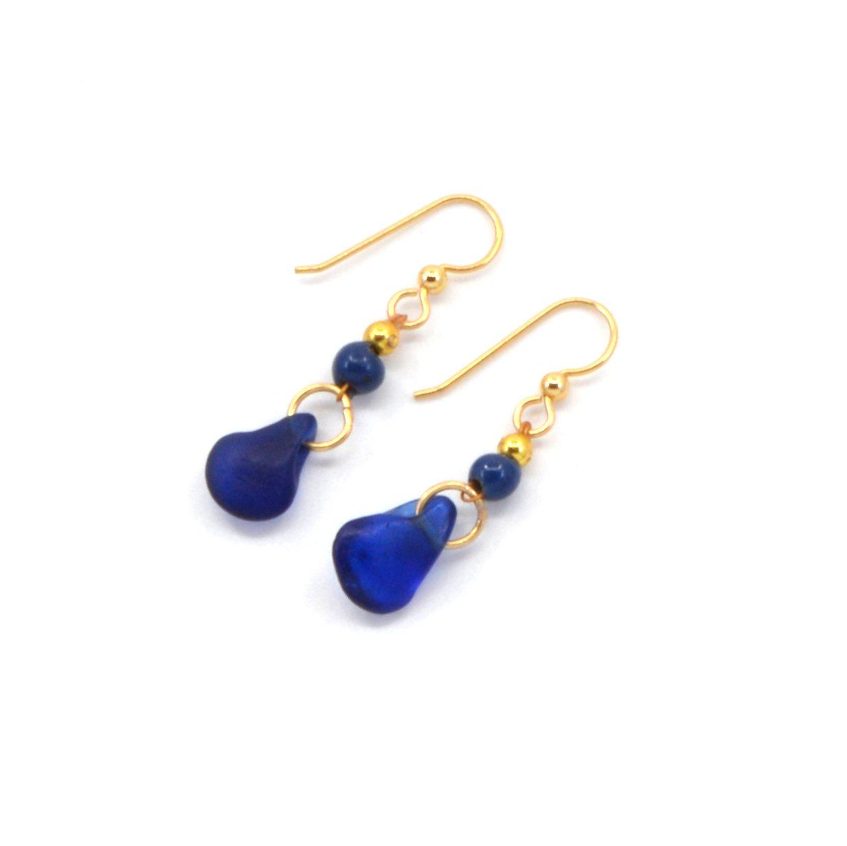 eine sehr hübsche Halskette mit abwechselnd tropfenförmigen Anhängerperlen aus dunkelblauem Glas und hellblauen eiförmigen Perlen, zwei gerippten Goldperlen auf der Vorderseite, zusammen mit einem passenden Paar Ohrhänger mit späteren Ohrhaken aus 18 Karat Gold und Goldperlen.