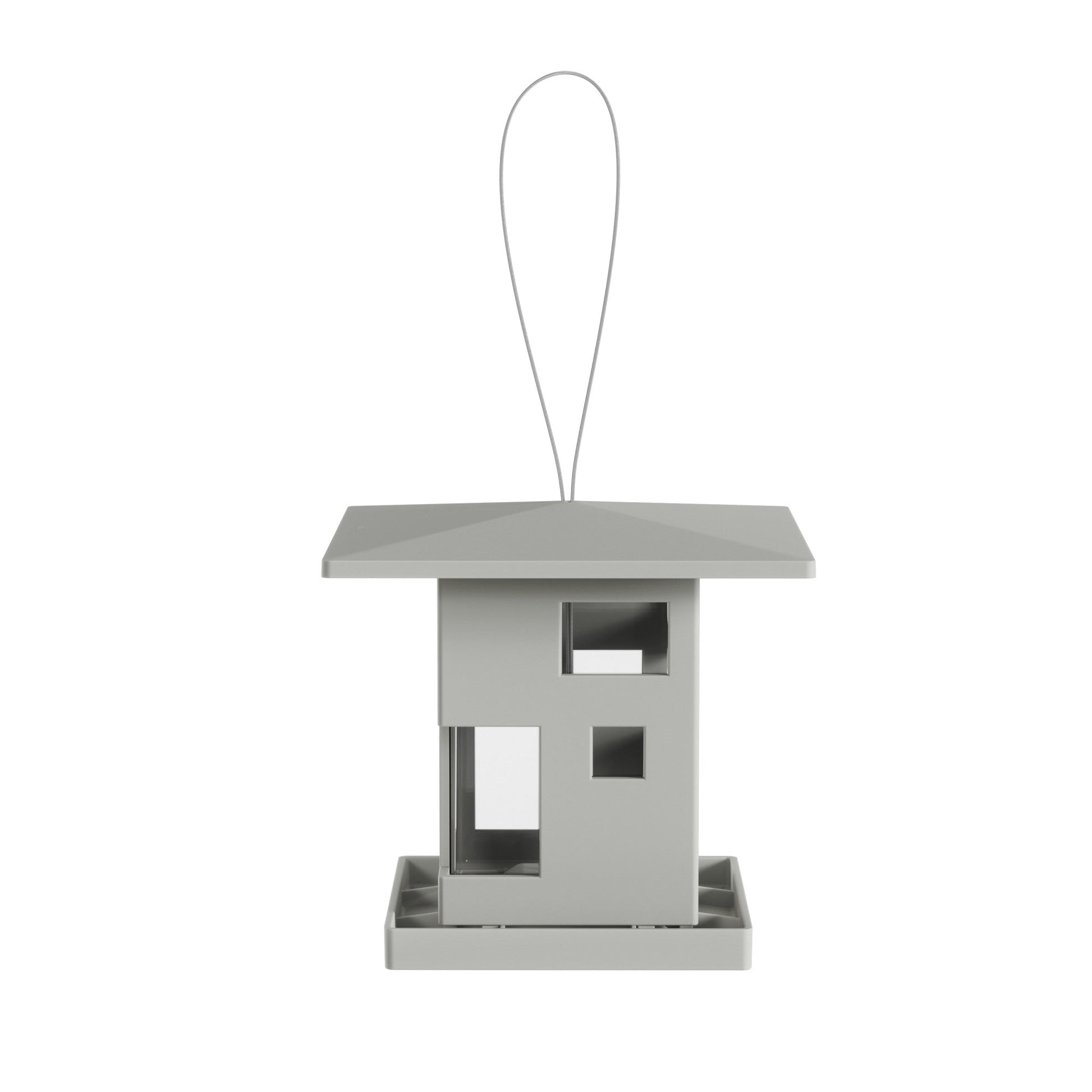 Invite wild birds to dine in style-and satisfy your taste for modern design-with this hip new spin on the traditional bird feeder. The Bird Cafe bird feeder from Umbra features a cube-shaped architectural form with asymmetrical windows. When filled, seed is visible through the clear plastic windows and flows out of holes in the bottom into the wrap-around tray for birds to perch on and feast. Bird Cafe's roof features an overhang design, allowing rain to clear off so that the bird feeder stays dry no matter the weather. Constructed of durable, molded plastic with a steel cable for hanging. Remove the lid to fill with seed from the top.