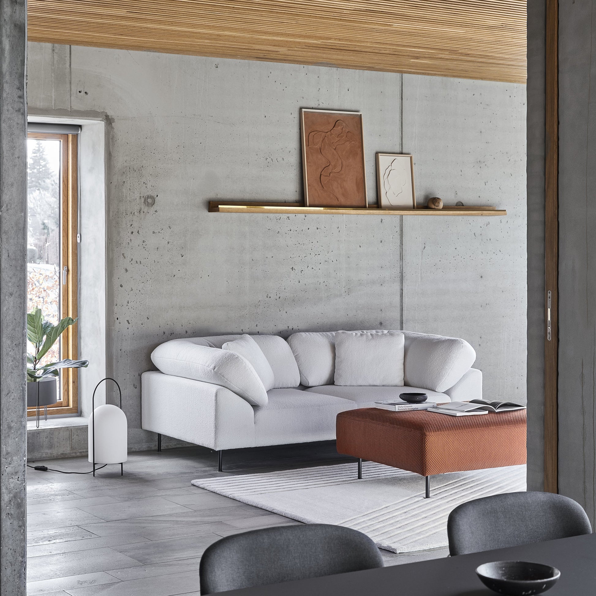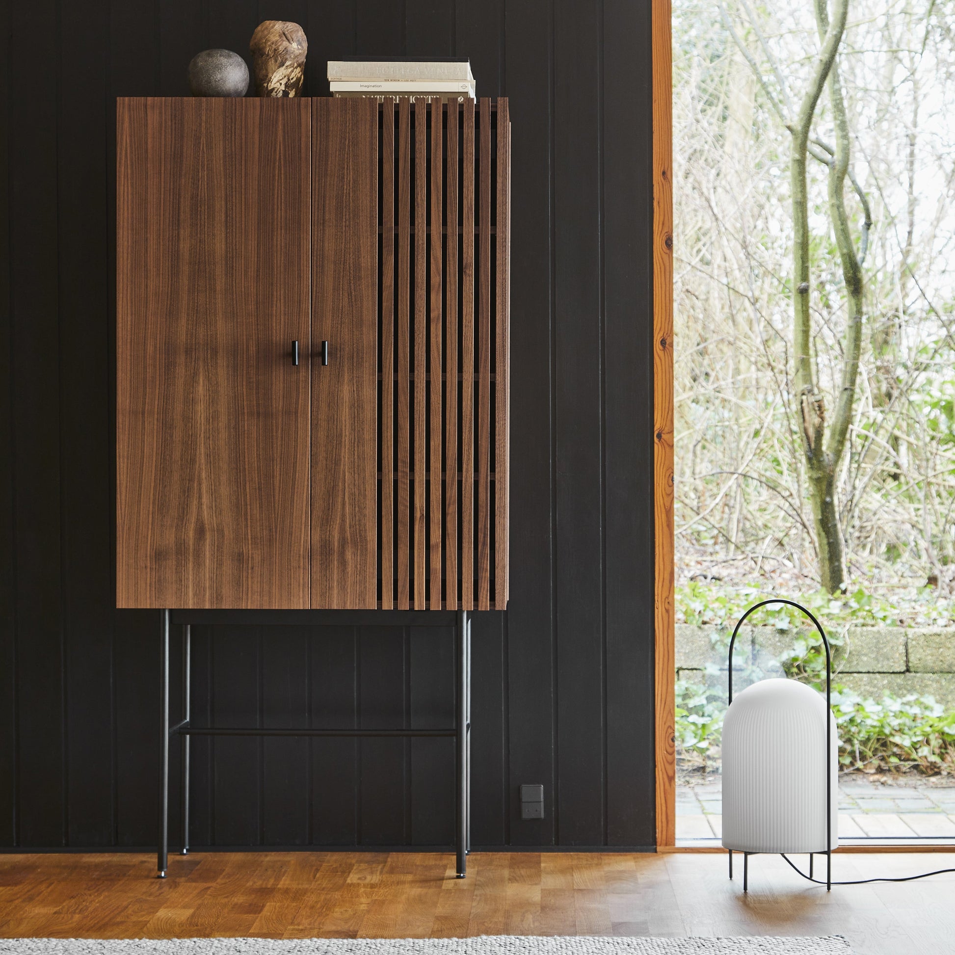 Ghost floor lamp is a modern interpretation of antique portable oil lamps. The slim metal rod surrounds the lampshade protectively while the overarching bail functions as a handle for carrying the lamp around. Made of translucent opal glass, the shade gives an illusion of a white cloth thrown over the light source. Resembling the appearance of a friendly ghost in the air. The subtle vertical groove pattern on the surface fades out gradually upwards, emphasizing the lamp’s refined sculptural character. The cord comes with a dimmable switch.