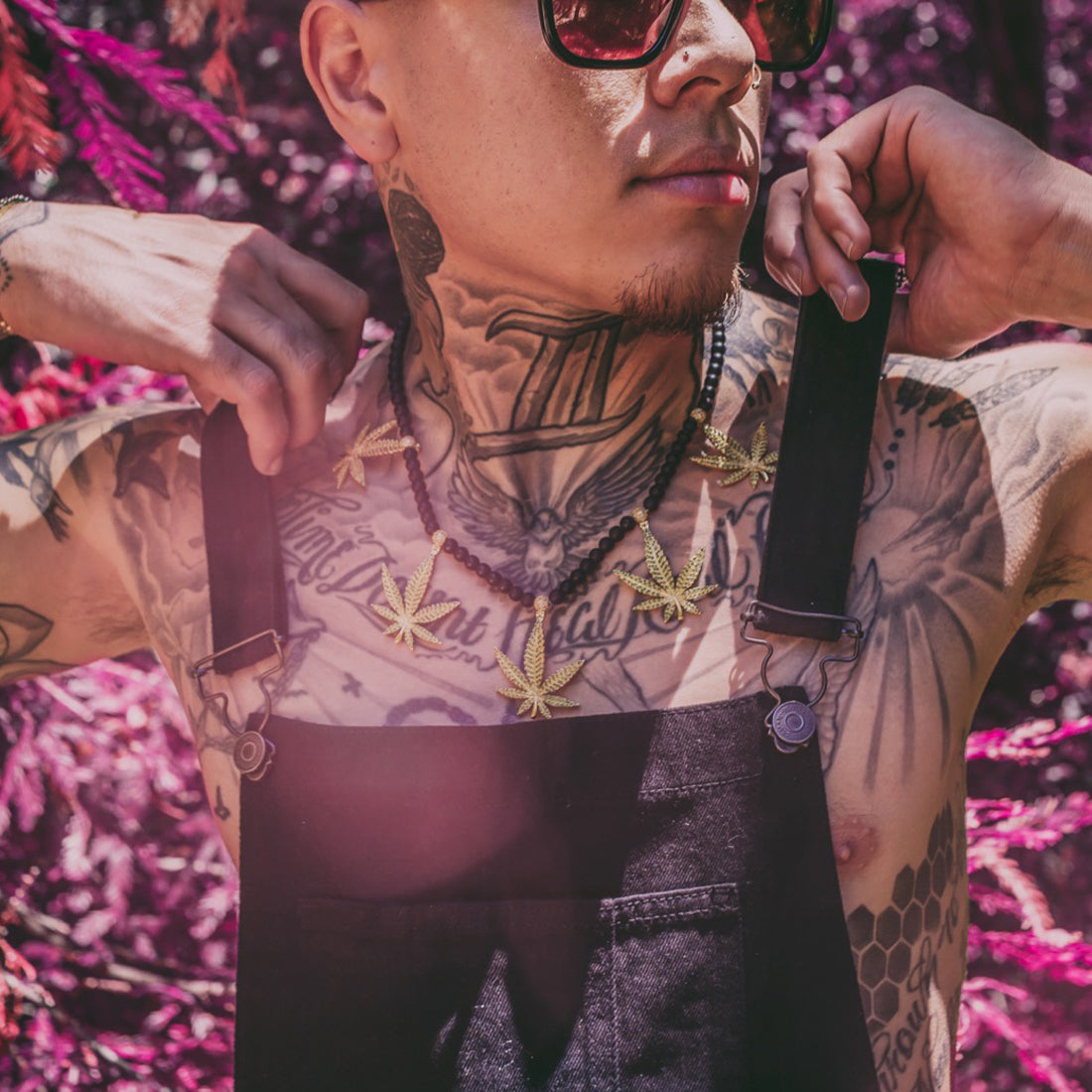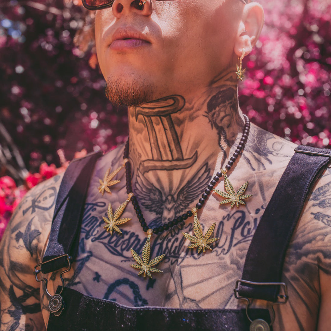 This necklace features five cannabis leaves that hang evenly between them for a clean, full neck look. Each pendant features green stones on the front and a fully detailed leaf on the back, separated by black genuine gemstones and an iced spherical bail.
