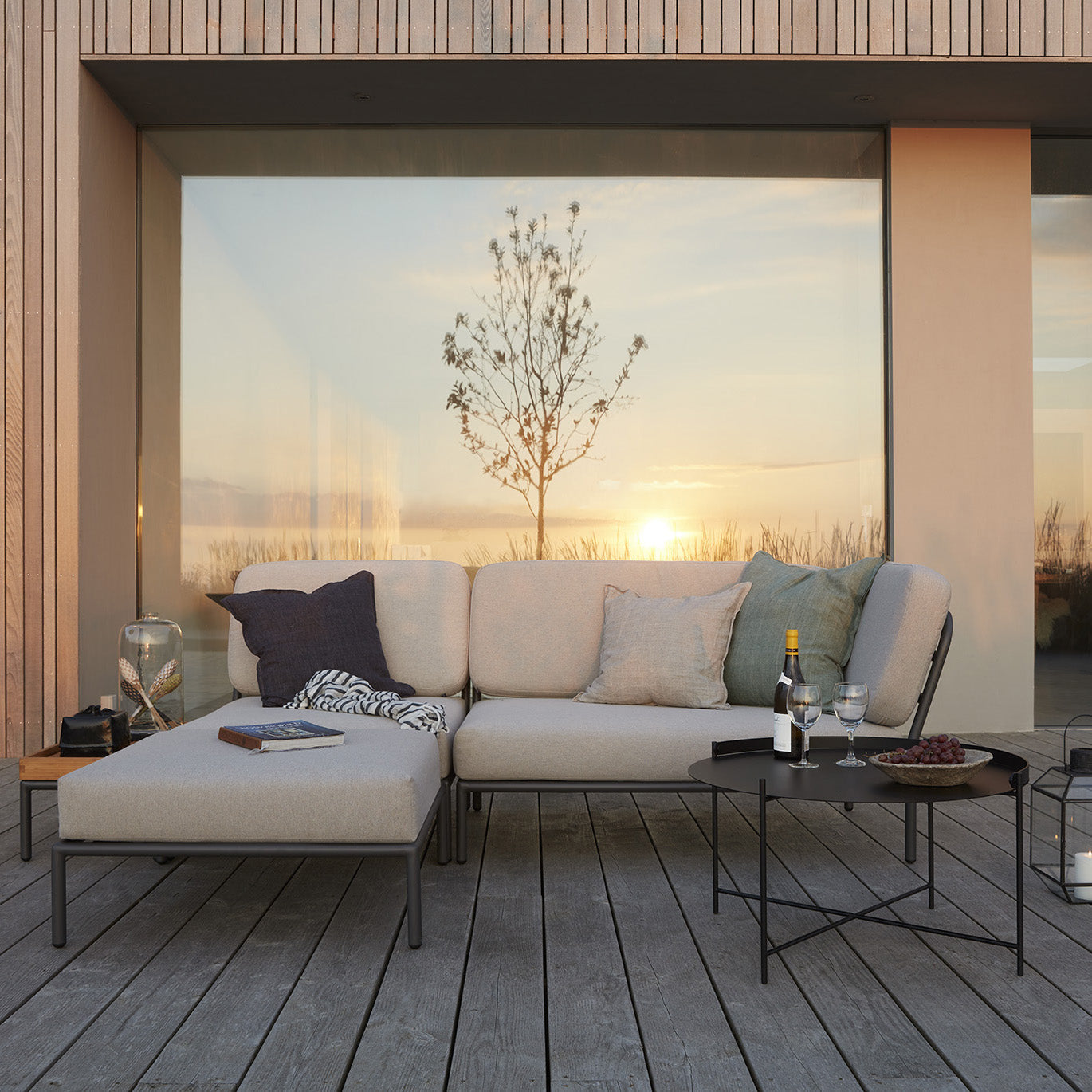 It’s all about level, to come eye to eye with nature, to relate to the horizon and to get lines and shapes to move up to a higher level! The lightweight frame and soft cushions creates both contrast and comfort – and lures with relaxed lounge atmosphere. Colorful fiber ends from the process of reusing the primary material may appear in the weave and vary the fabric color from one batch to another. This creates a unique fabric with a natural look and vintage charm. The fabric is Oeko-tex certified, water-repellent, stain-proof and easy to maintain.