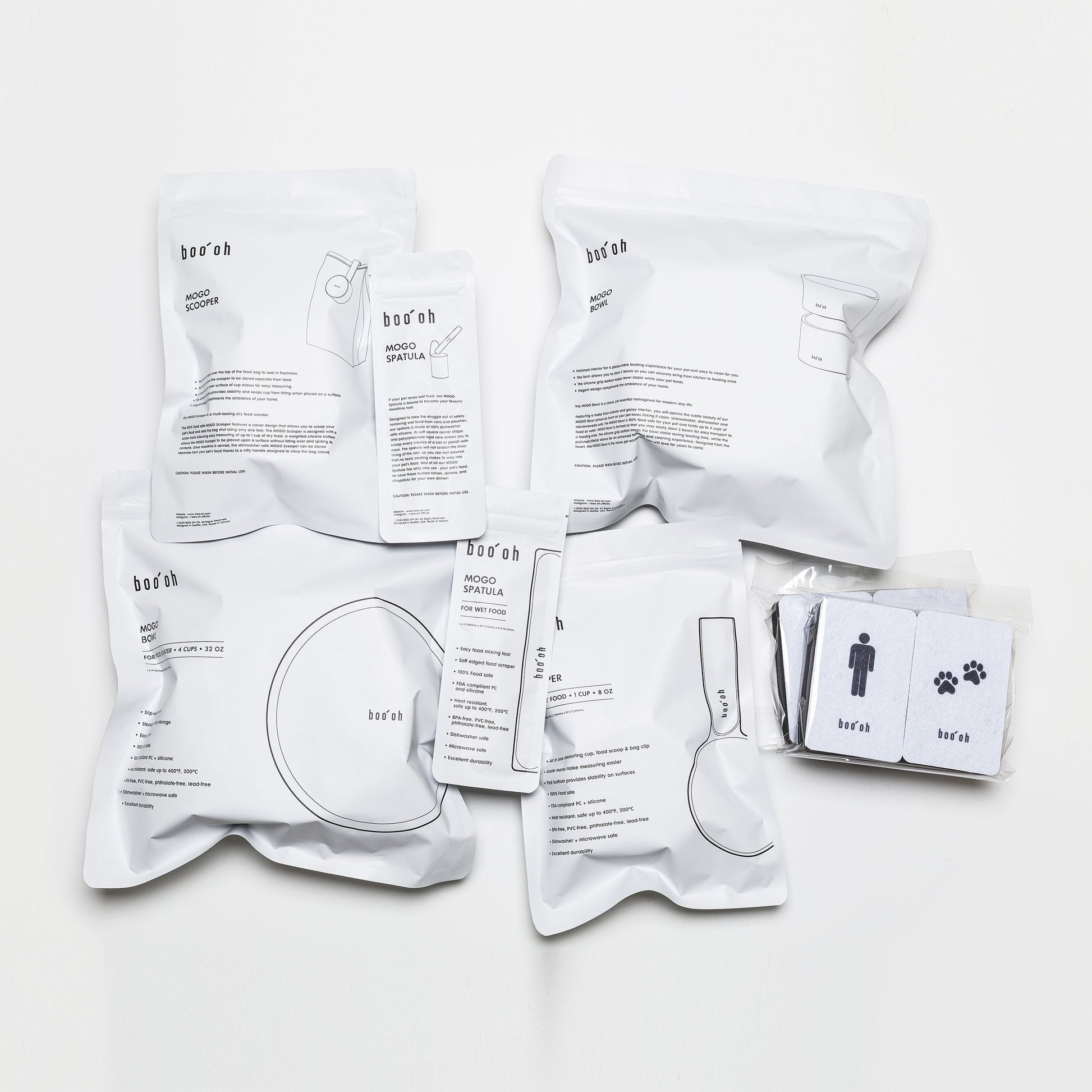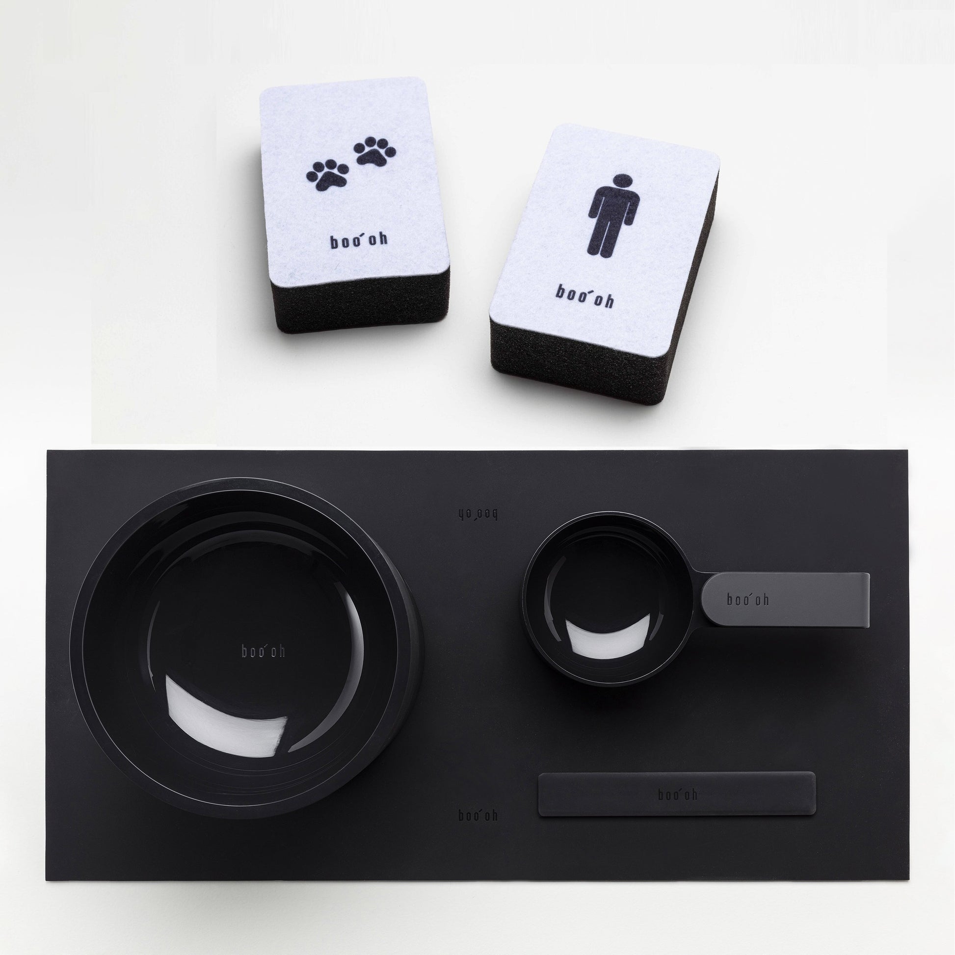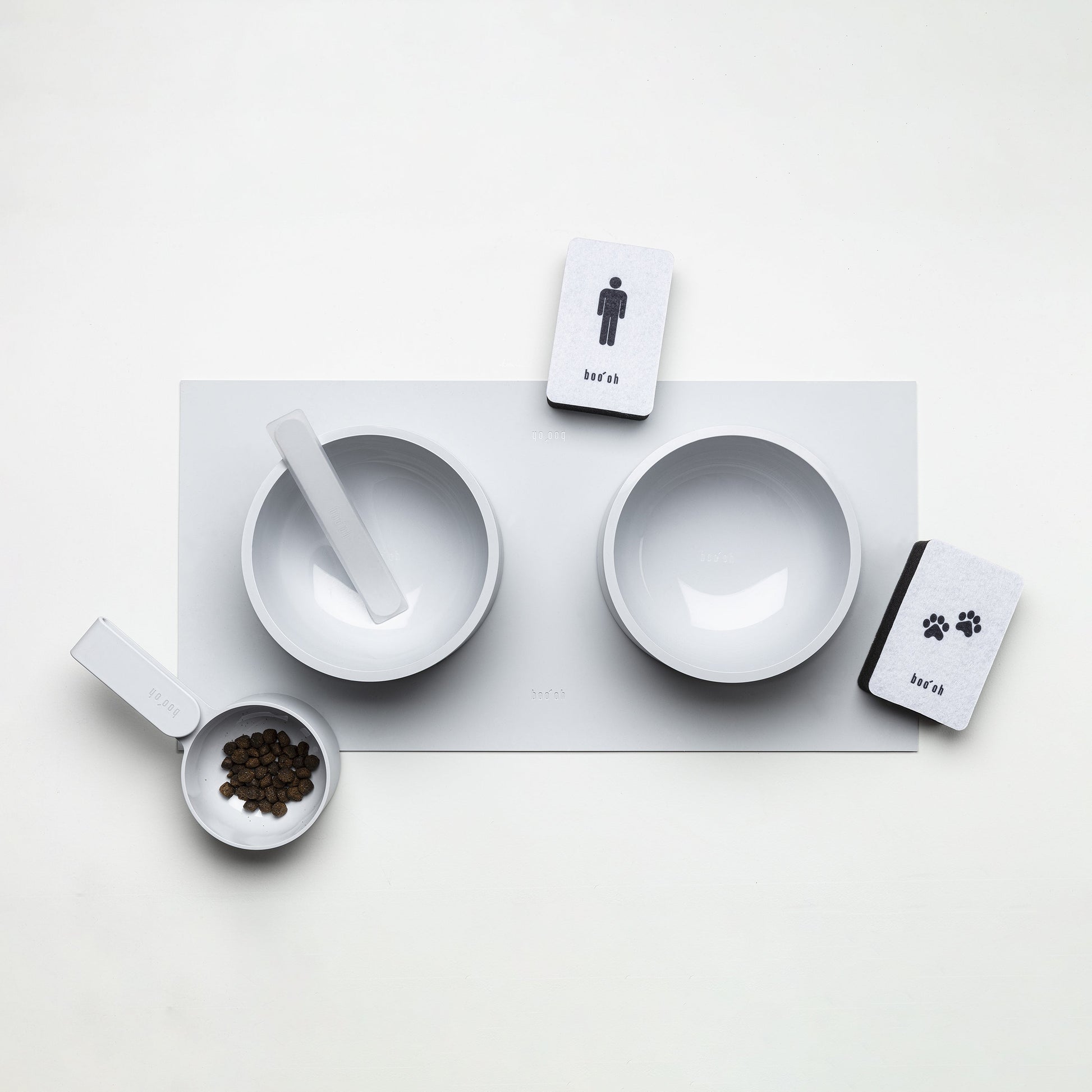 Blending a minimalist aesthetic with maximum functionality, specially priced feeding kit includes two bowls, a scooper, a spatula, a tray in your chosen color of light gray or dark gray. As a special gift, the kit also contains two MOGO cleaning sponges- one for you and one for your pet. The graphic designs on the sponge tops make it easy to distinguish the two and prevent the accidental transfer of bacteria and chemicals from your pet bowls to your human dishes.