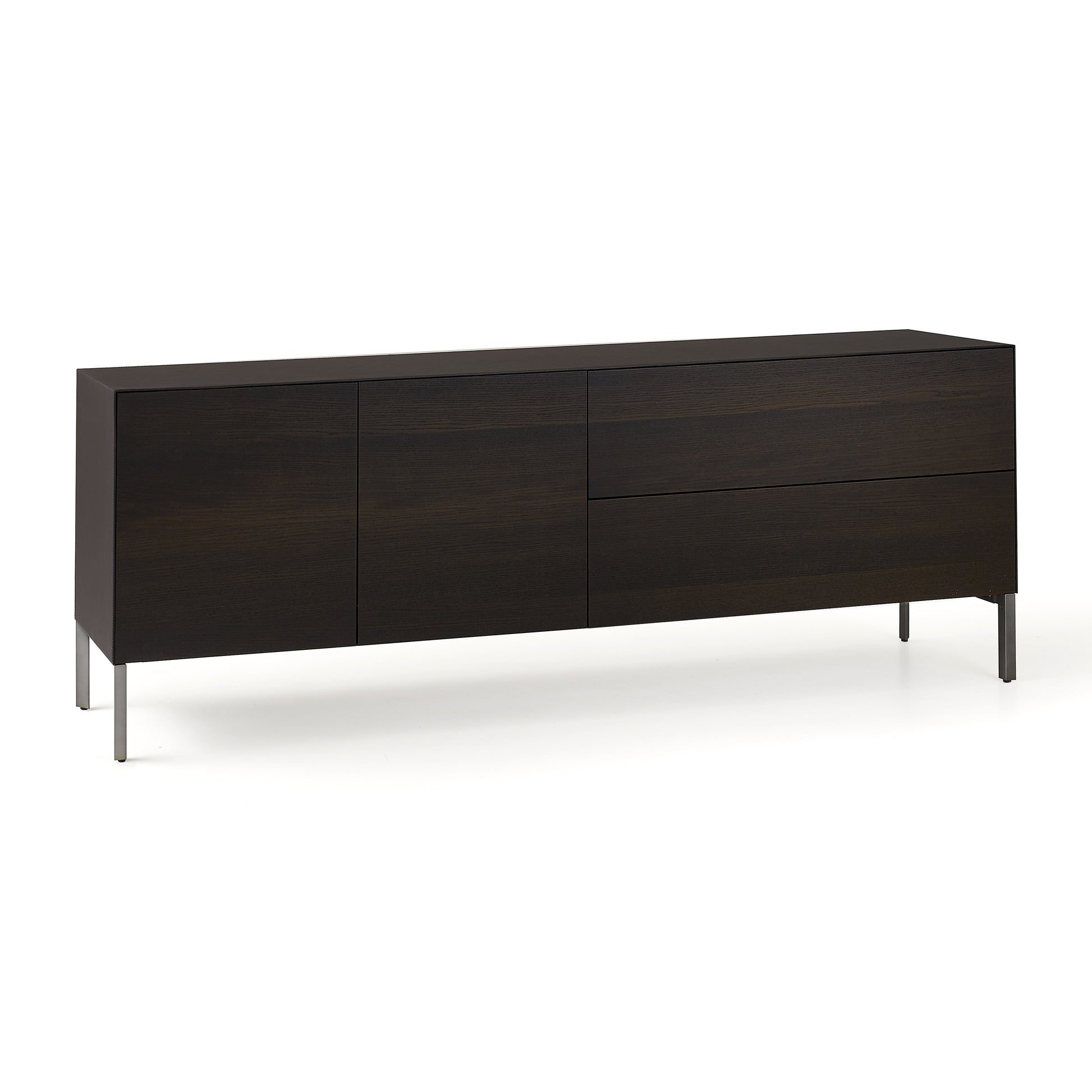 The sharp, unfussy design of its lines lends elegance and refined appeal. the continuity of its surfaces is one of its key features: the whole structure is wrapped in a continuous slim panel, just 4 mm thick, producing a rich monolithic look. The decision to banish handles in favor of the elegant push-to-open system adds to this effect. With a host of different finishes for the base and a choice of high gloss and matt lacquered colors, wood, glass and mirrored finishes as well as the original natural slate finish, the unit changes appearance according to individual preferences.