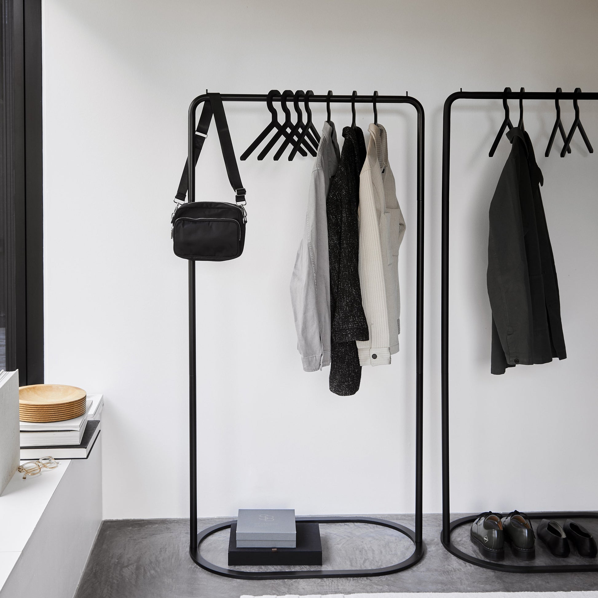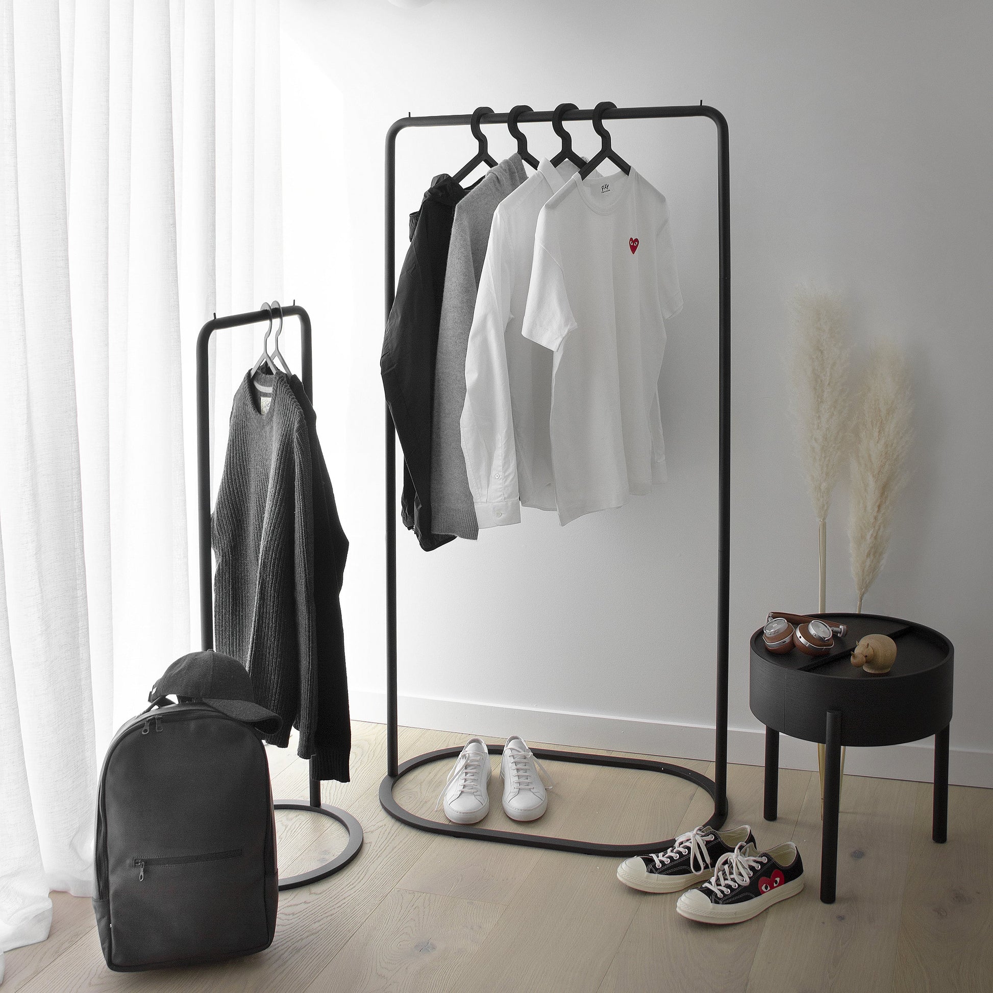 O&O is inspired by two different-shaped O-rings that belong together and can be arranged as desired in a variety of positions. The two separate elements, in different heights and widths, rise from the ground as a sleek but stable construction. Beautiful on their own or as a merged unit. With its flexible feature, O&O is ideal for the modern lifestyle. Place it in the hallway, walk-in closet or bedroom or move it between the spaces and arrange it as desired in a variety of positions.