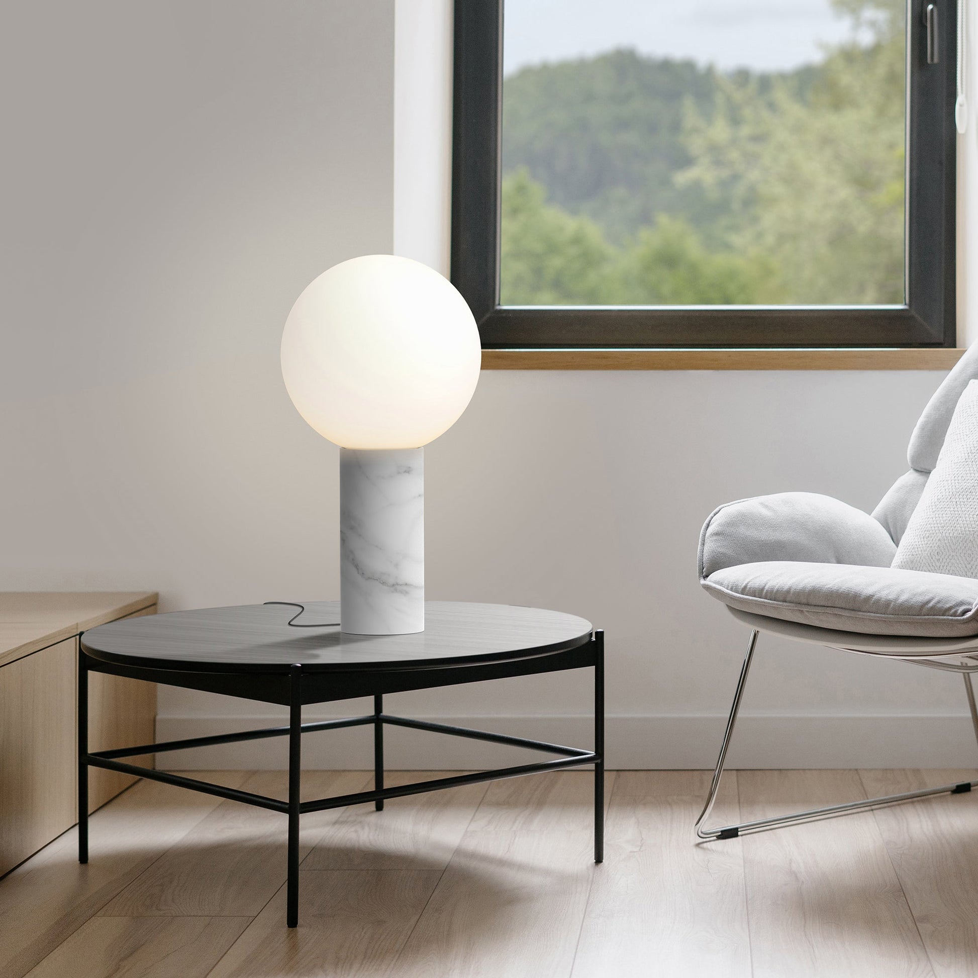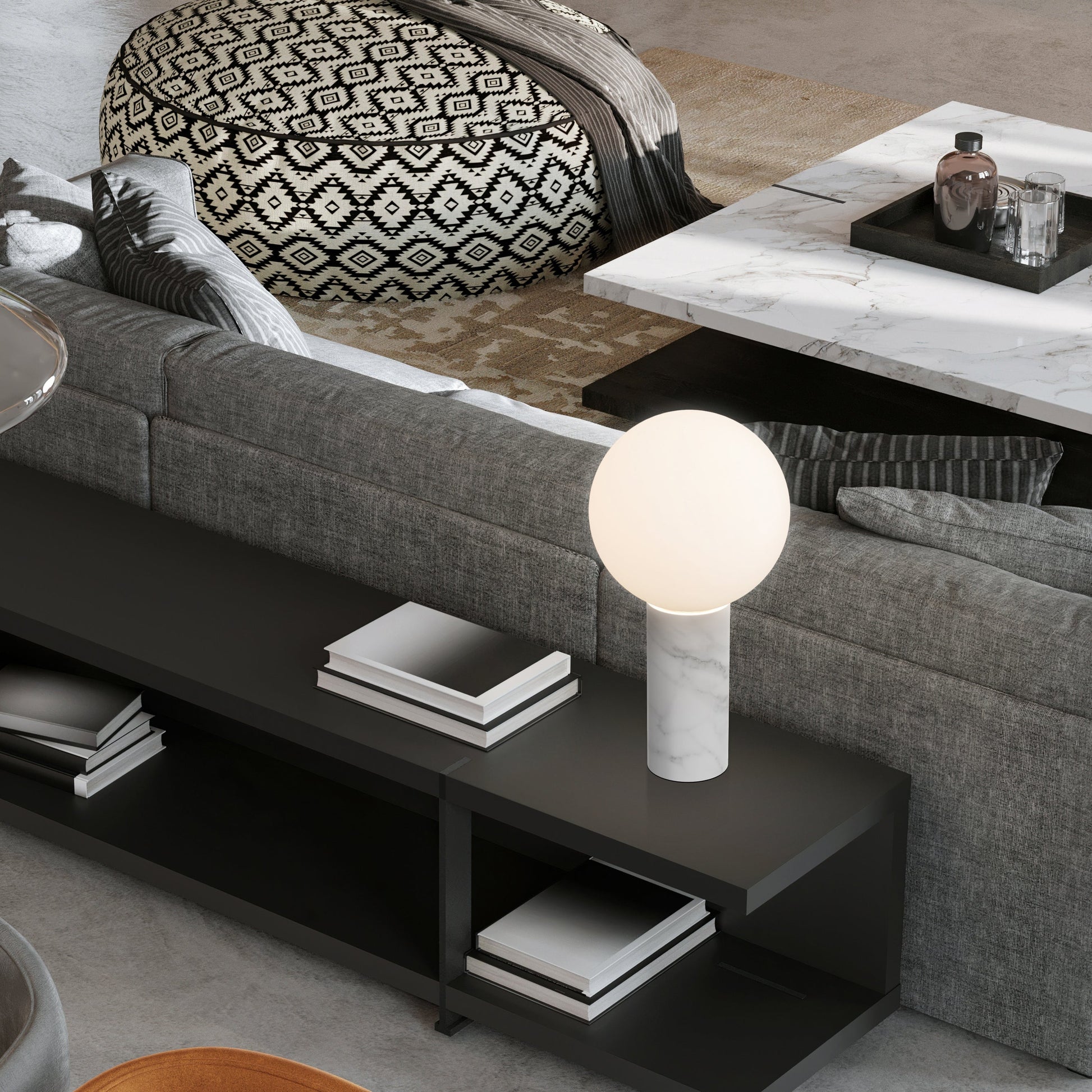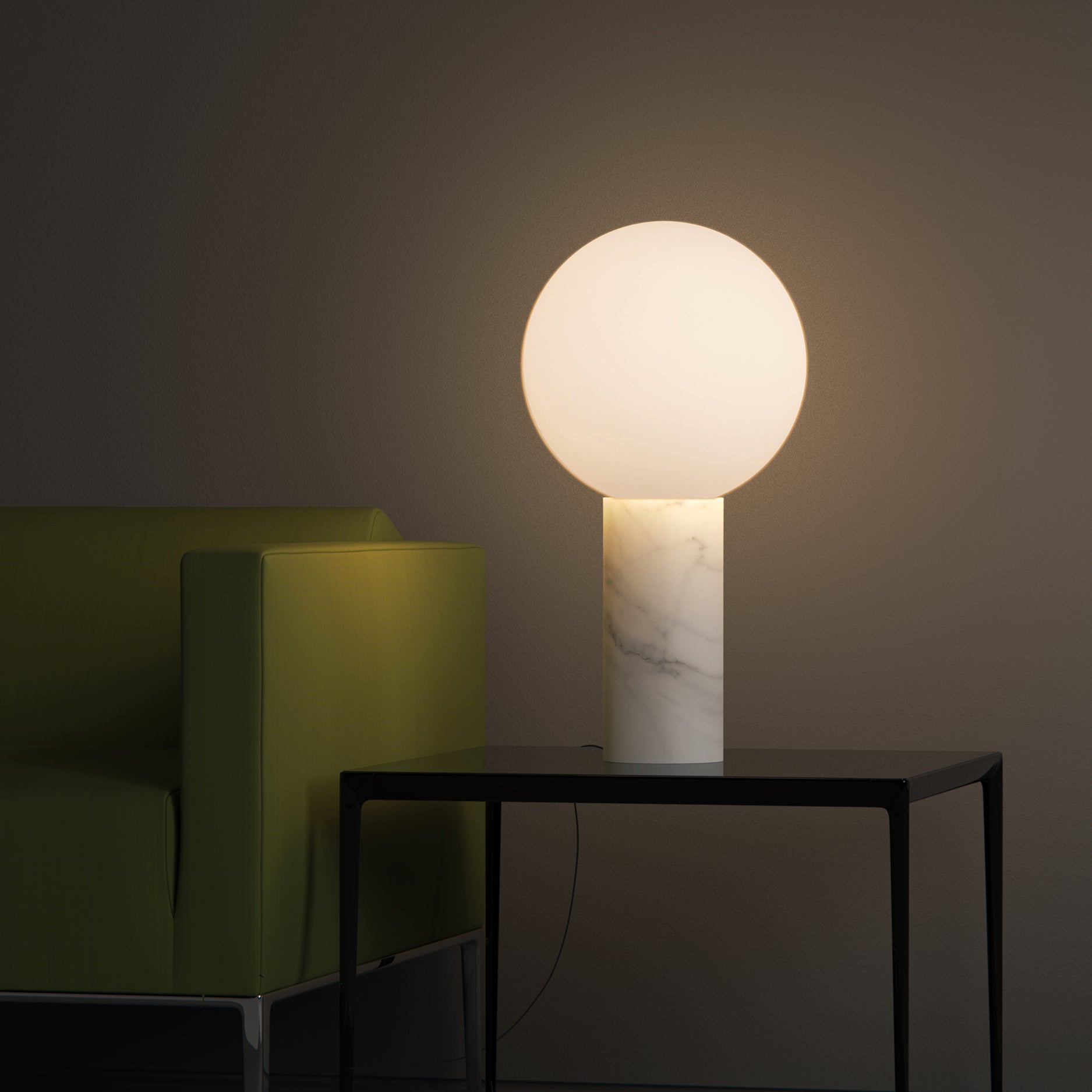 Playful and sculptural in design, Pilar is a study in geometric proportions that meticulously bring out the character of its materials to create pure warm, ambient illumination for any range of spaces. Pilar embodies a harmonious dialogue between solidity and lightness featuring a monolithic column in marble with a hovering glass globe that define its iconic silhouette. Pilar is offered in both Carrara white and Marquina black marble bases with a mating 12”(30.5cm) frosted Opal glass globe and features an inline full–range dimmer to select any desired light setting and ambiance.