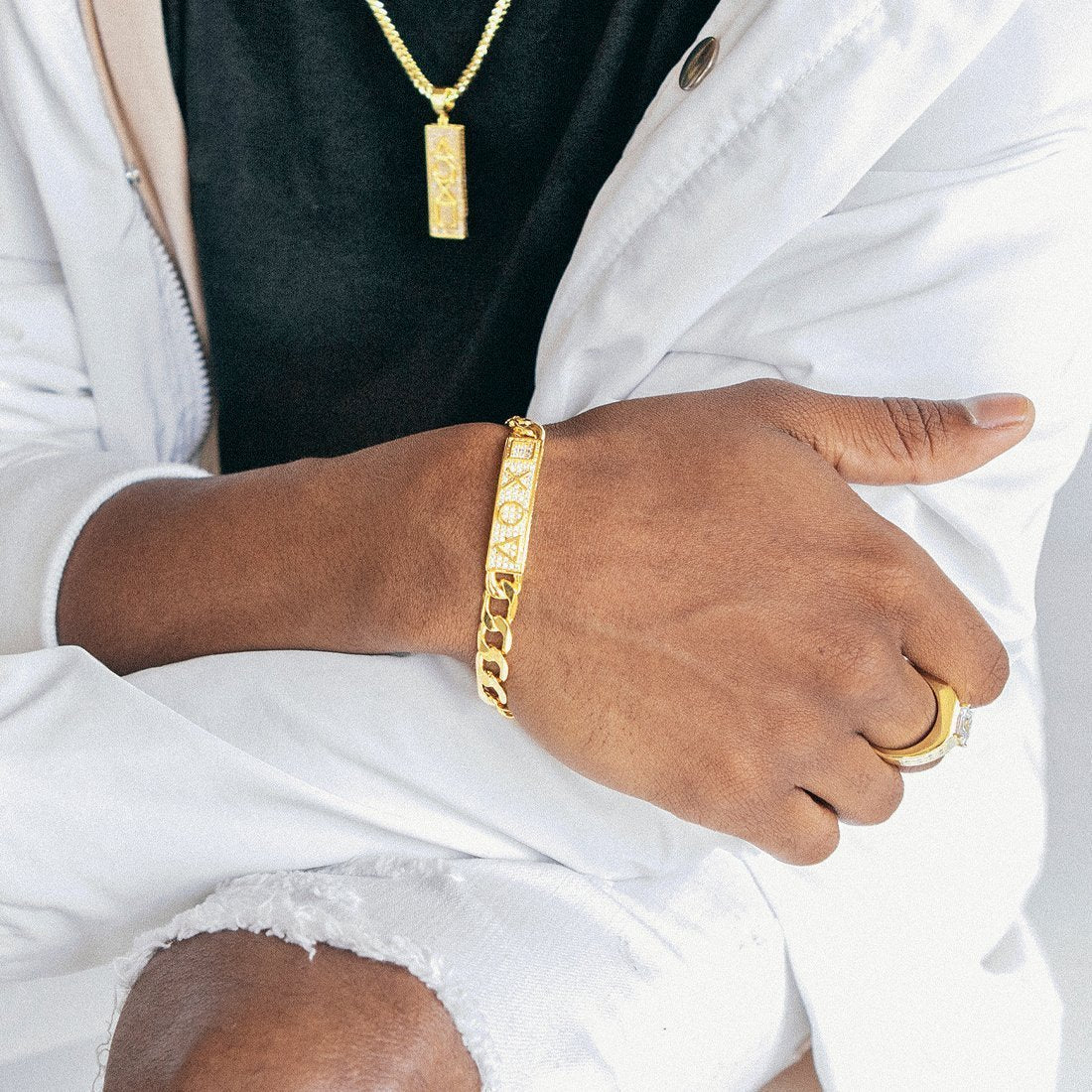 The bracelet pays homage to these classic buttons. Each stainless steel bracelet is dipped and plated five times in 14K Gold for a bold look. VVS Diamond Simulate stones border the plaque-like stainless steel design for an icy finish.