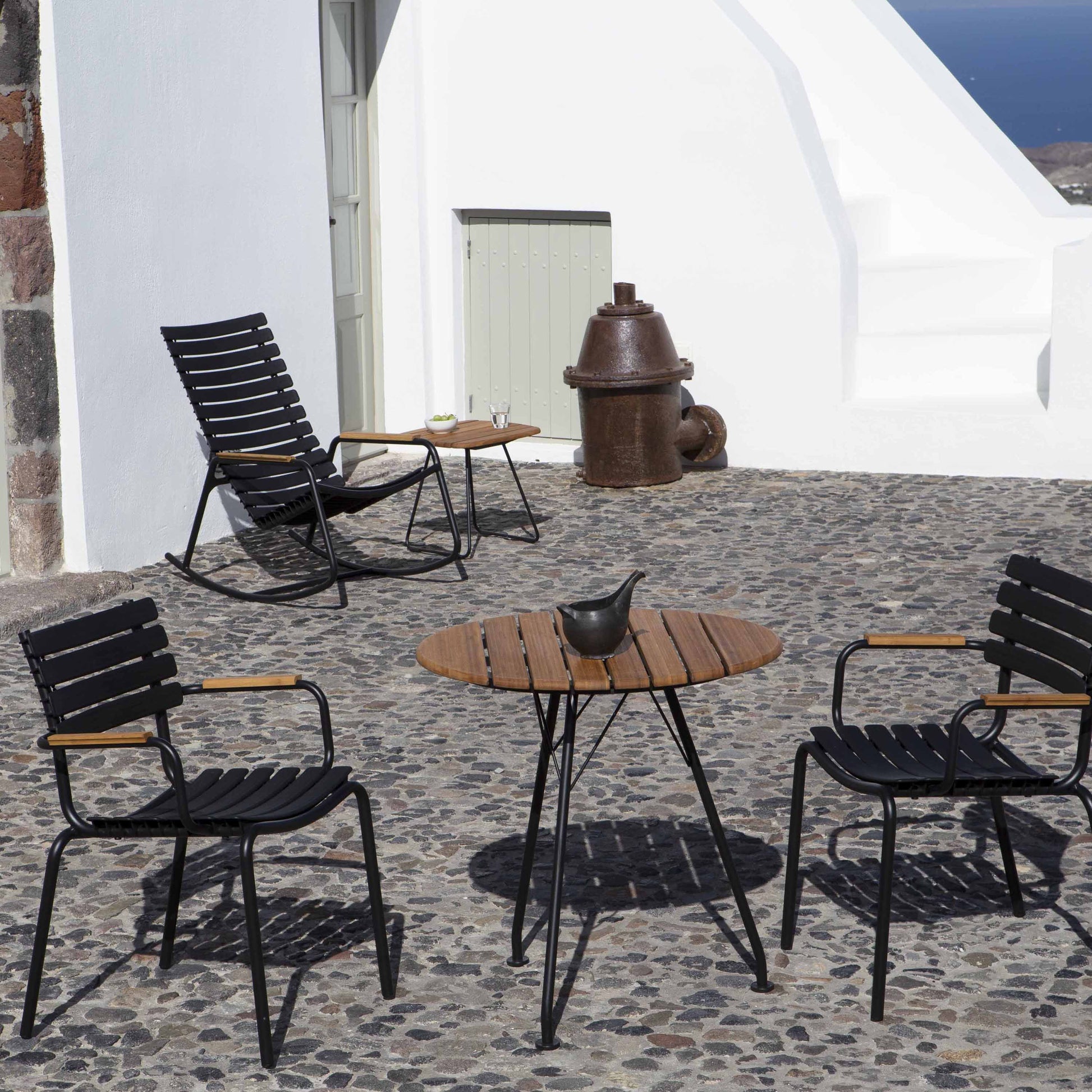 ReCLIPS is a line of chairs with wide plastic lamellas clipped on a light powder coated aluminum frame. The lamellas are made from Danish household plastic trash and produced in Denmark. The technology behind re-using plastic household trash for furniture production is developed in Denmark. With ReCLIPS you are basically looking at the result of mixing Danish design and Danish innovation - and converting this new thinking and materials into a chair. ReCLIPS Dining chair comes in 4 mono colors with the choice of adding armrests in bamboo. The aluminum frame combined with the UV protected plastic lamellas, keep the maintenance to a minimum. ReCLIPS Dining chairs are stackable.