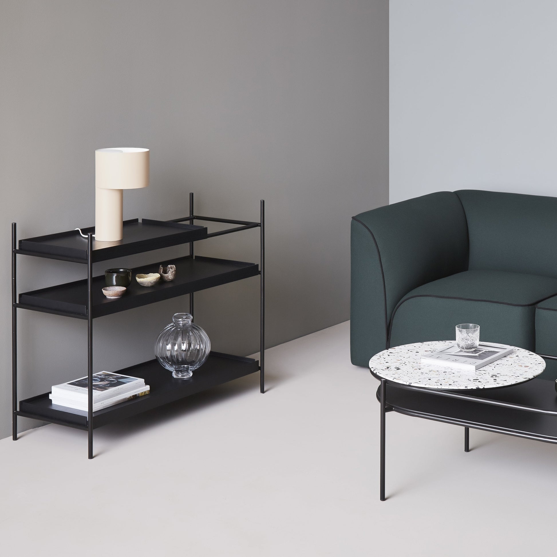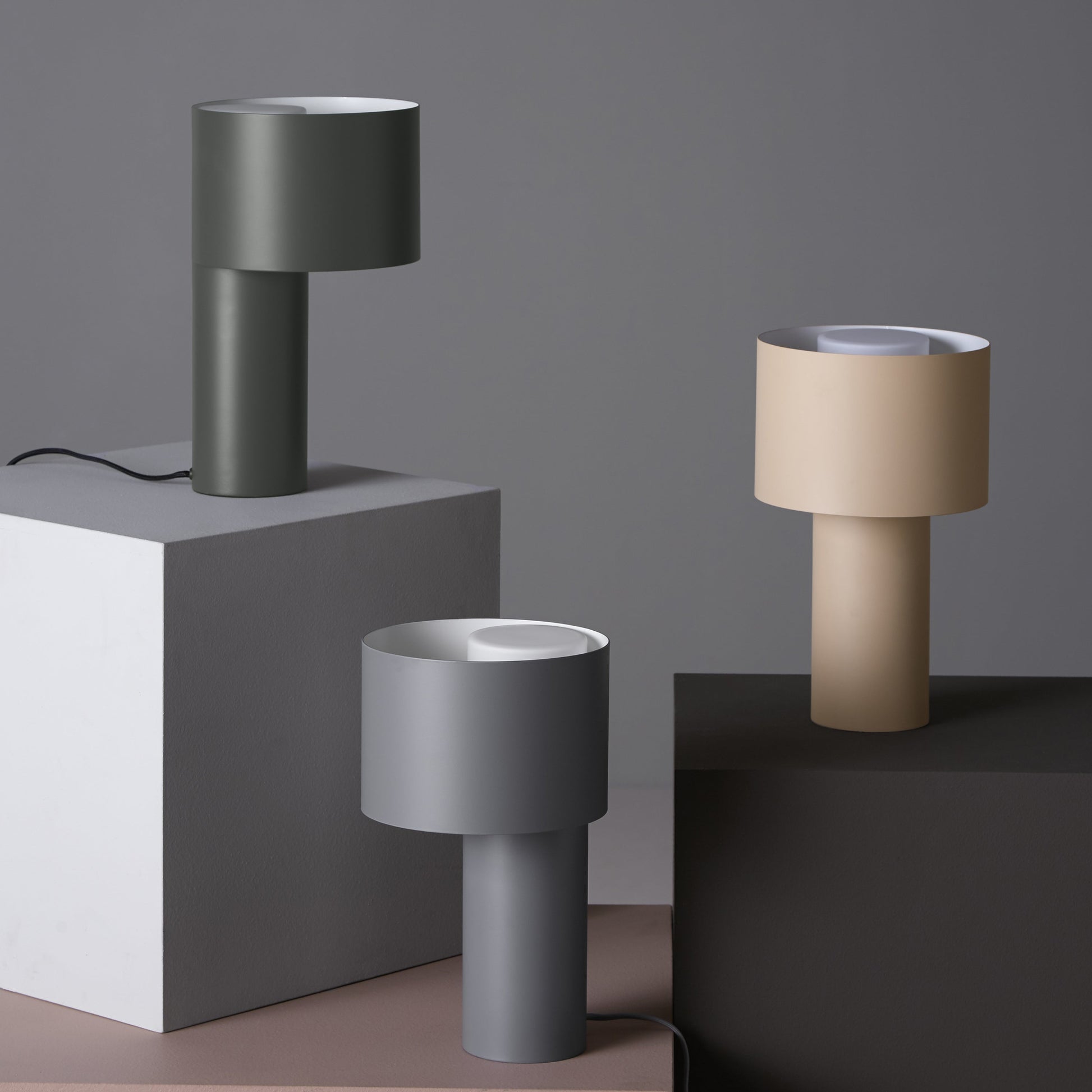 Tangent table lamp arose from an experimental study with tubes and proportion and how these can be joined together. A clean graphical design where two steel tubes meet at their tangential point of contact. The small tube provides space for the electrics while the large tube functions as the lampshade. On top of the inner metal tube is a shade made of opal glass that covers the bulb creating a soft light when turned on and a visual effect of one cylindrical tube when turned off.