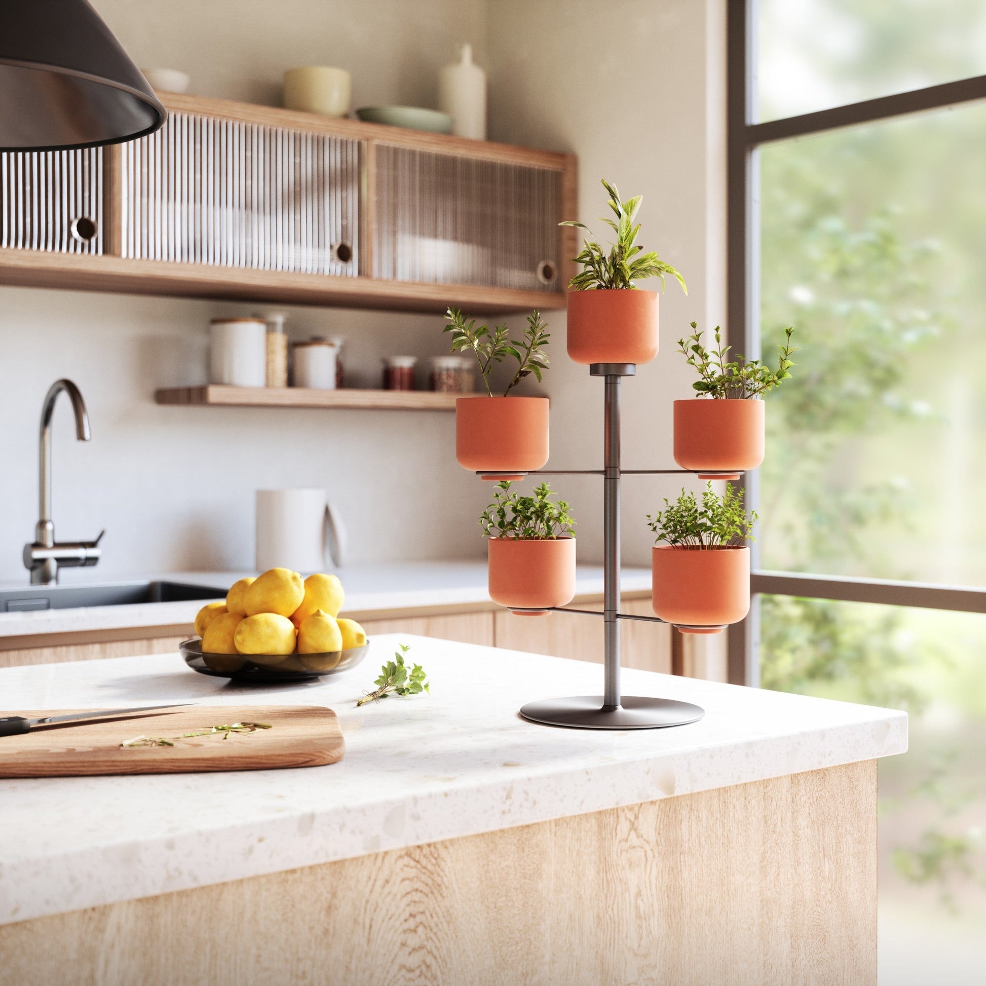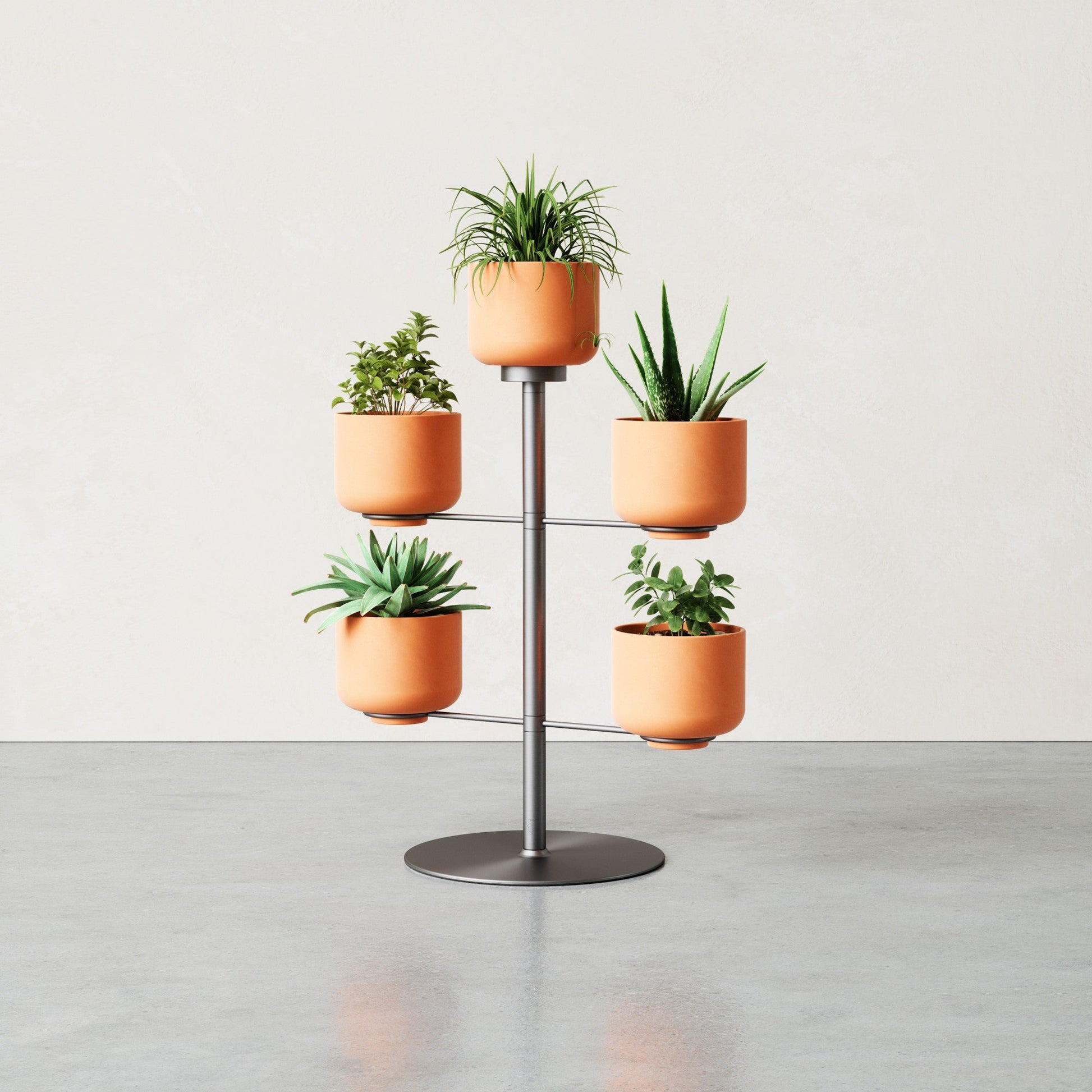 A desktop planter with 5 terracotta pots, showcase a variety of your favorite small plants with Terrapotta. This modern planter features two metal bars which rotate 360 degrees, allowing you to show off your plants from different angles. Pots accommodate 3-inch succulents or small plants.