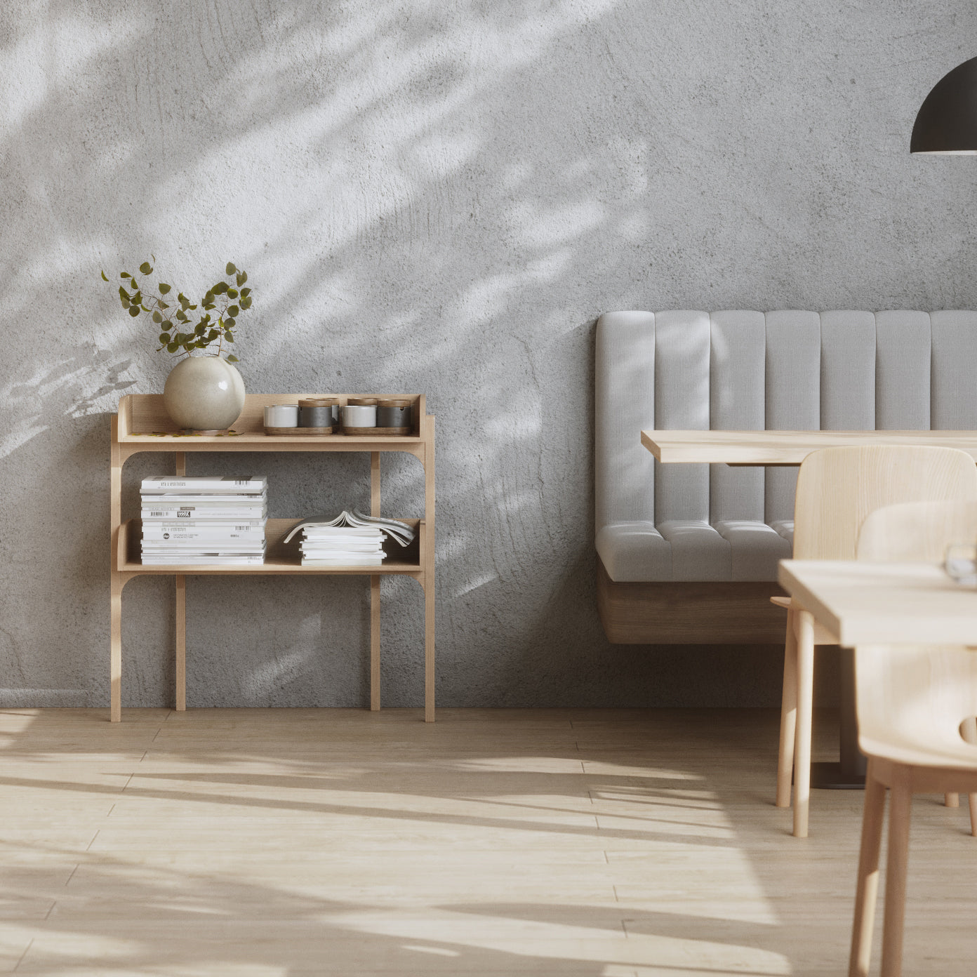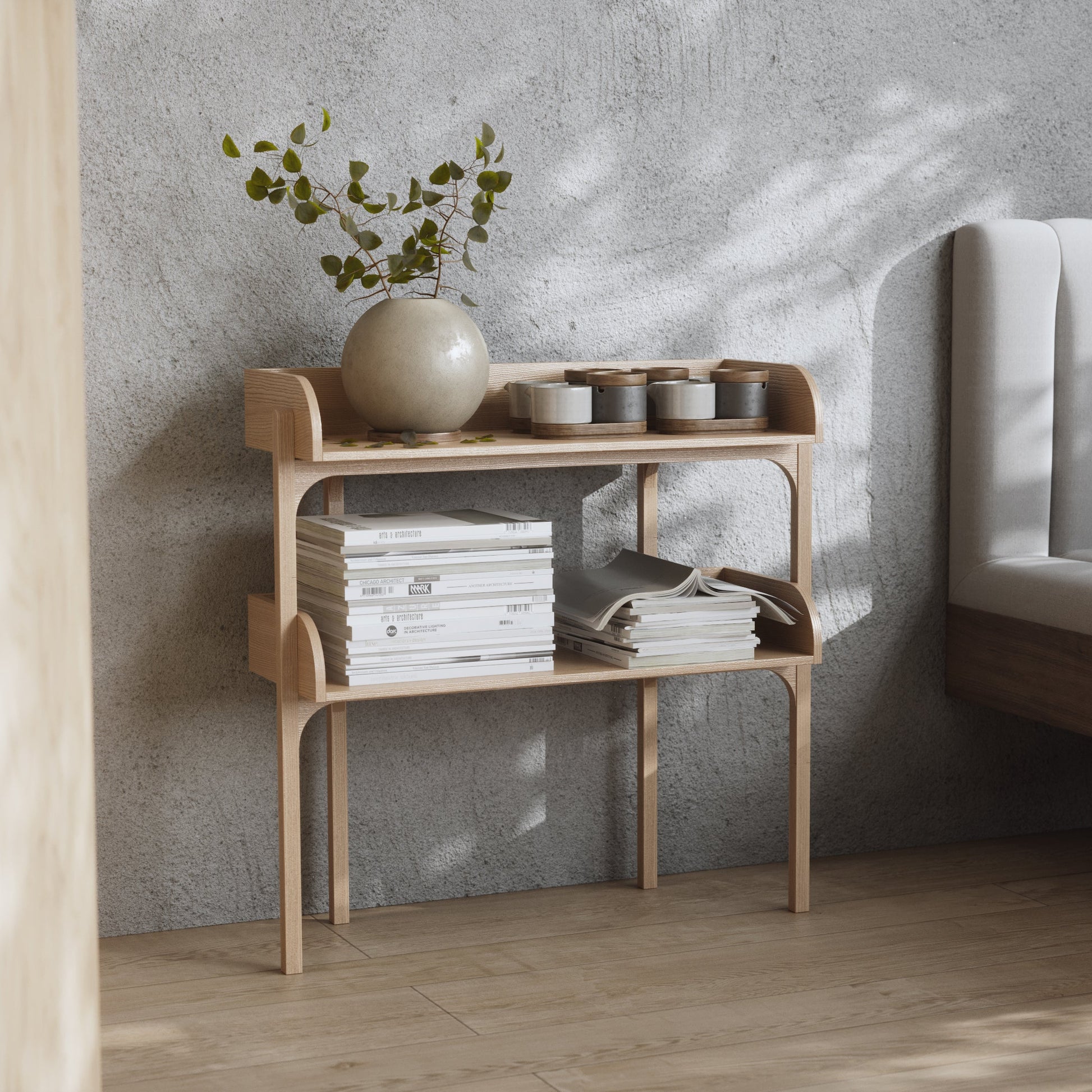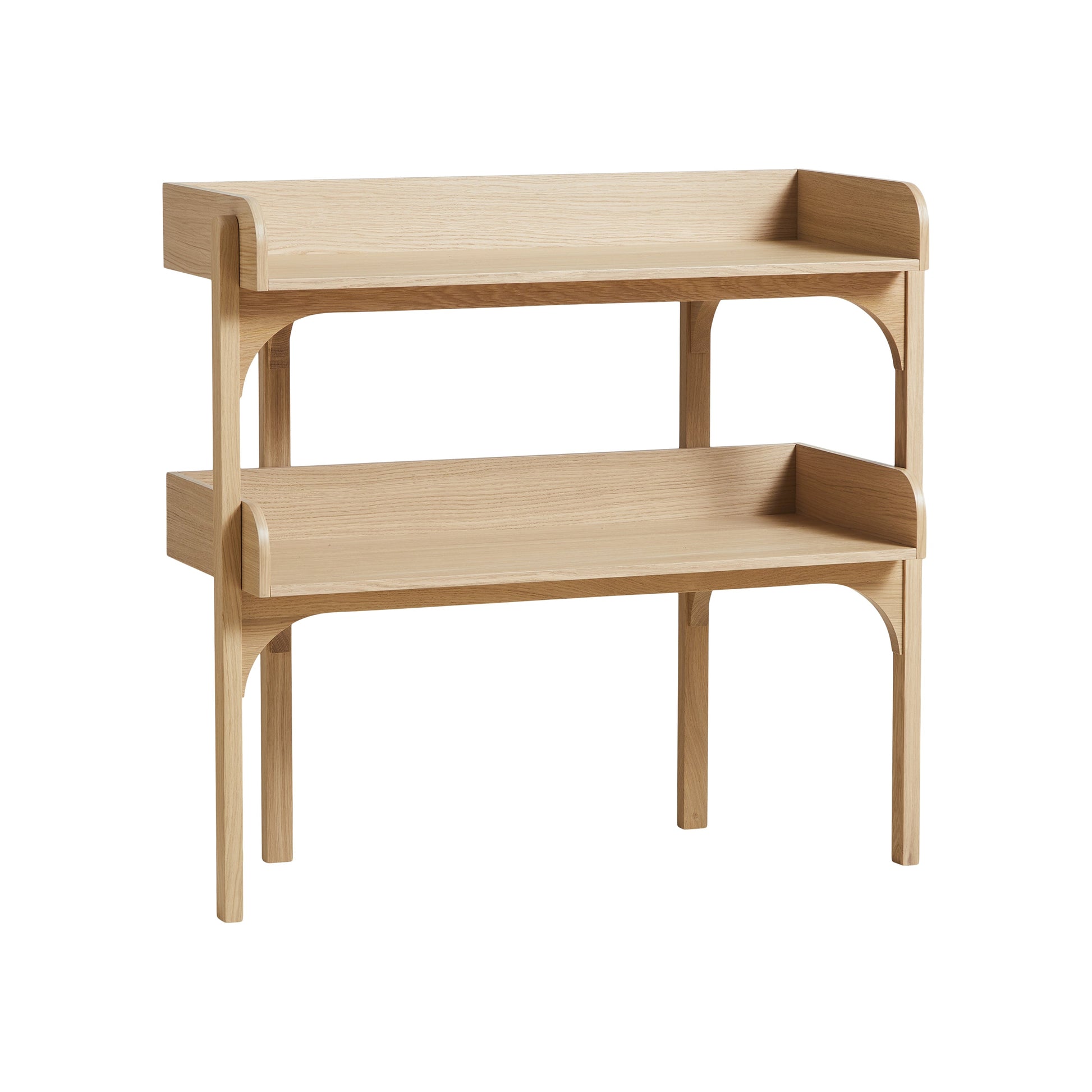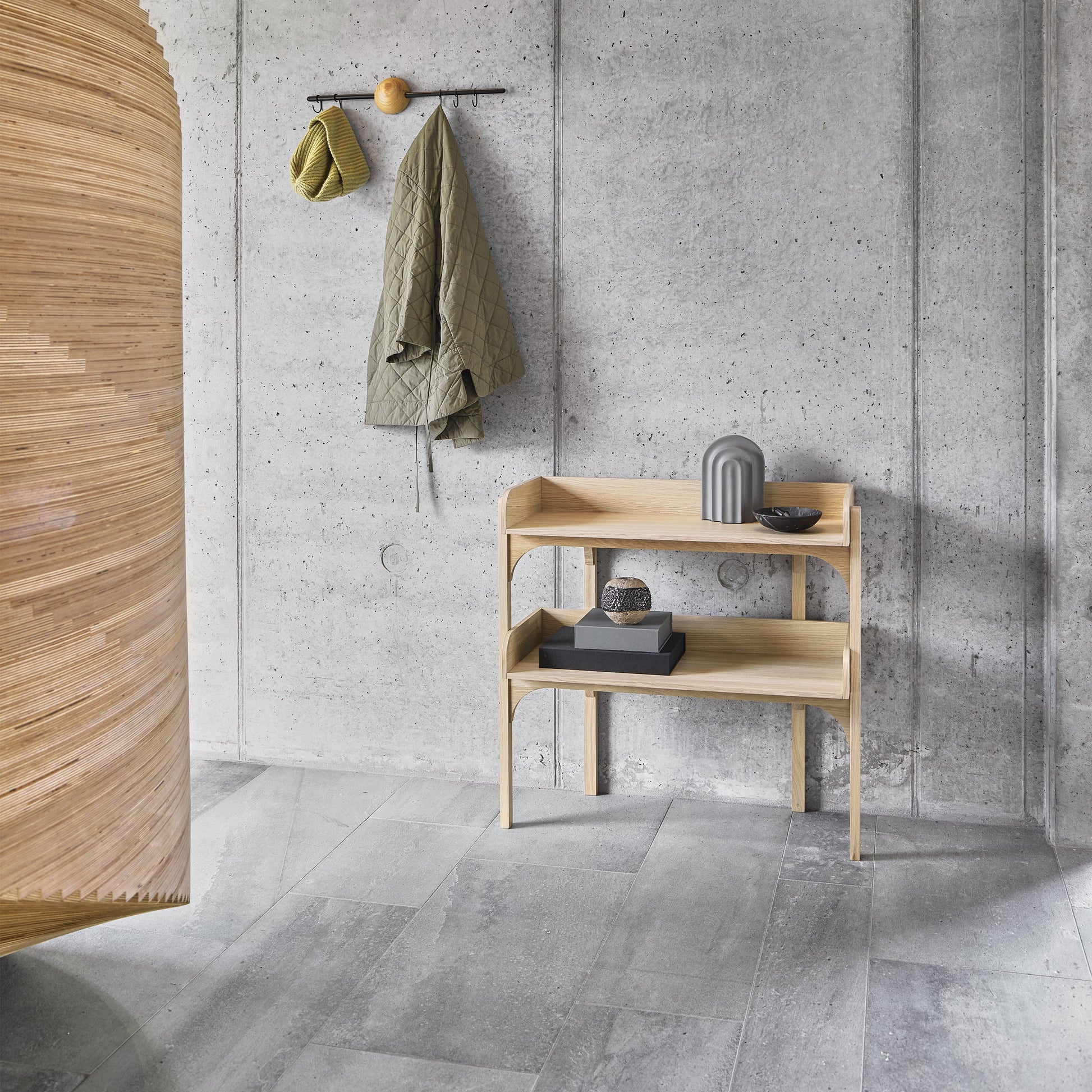 With a vision of combining the function of a cupboard and the lightness of an open shelving unit, the Utility shelf forms a versatile design, which is characterised by its soft curves and arches. Made of the natural oak material, Utility communicates an honest design. A design language that is beautifully enhanced through the exposed wooden construction, revealing the unique grain structure. The two compact shelves with three sides encourage you to contain and display both aesthetic pieces and convenient objects that should be easily accessible during the day. Whether that be towels in the bathroom, tableware in the kitchen or scarves and gloves in the hallway. Emphasising true utility.
