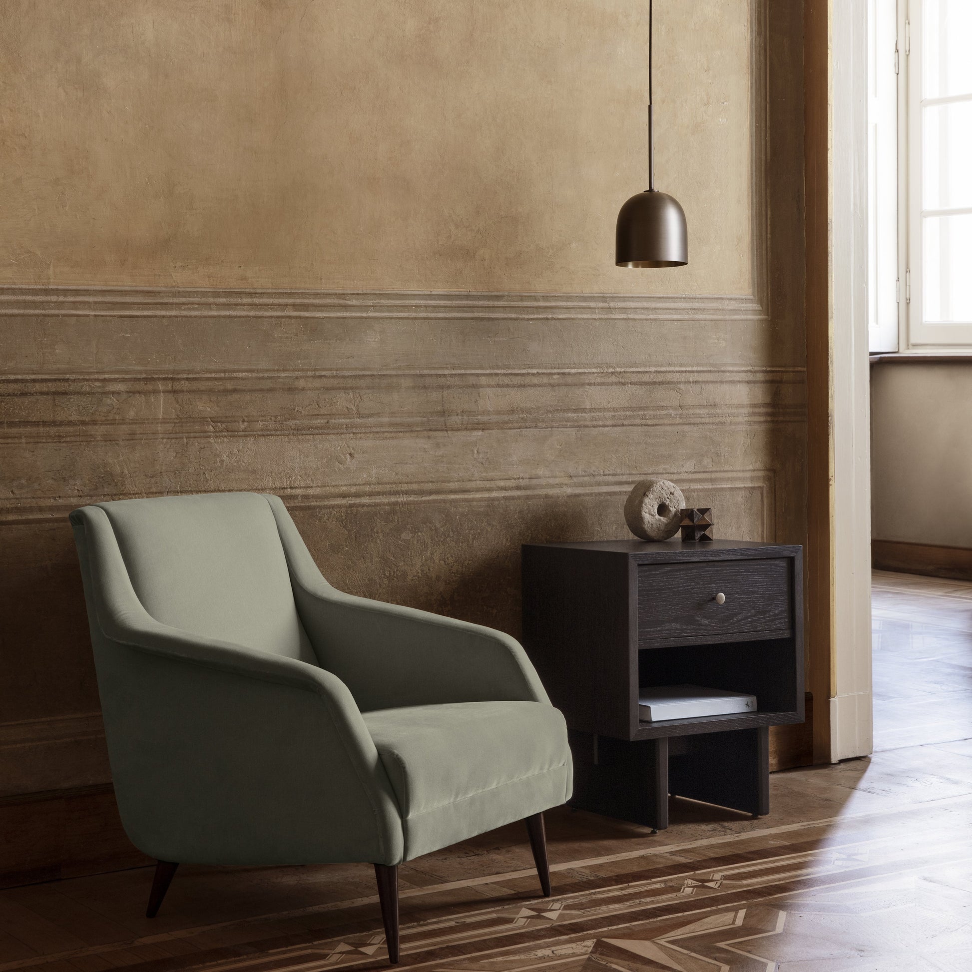 Warmth, strength and subtlety define the Howard Pendant Lamp – Space Copenhagen’s distinctly Scandinavian celebration of New York’s industrial palette. Abundant with material and atmospheric references from the SoHo location of the Howard Hotel, for which they were originally designed, they exude a warm, tactile feel. The carefully crafted gunmetal brass shades with a brushed brass interior lend an industrial, functional aesthetic while adding a warmth to the light it casts. For a more gentle effect, a bone china shade – providing a more diffuse light and a softer silhouette – can also be selected. The Howard Pendant is available in three distinct sizes, allowing them to be placed in many different settings, or be clustered into a more sculptural arrangement. As part of the highly coherent Howard Collection, they can be combined with a large range of elements which speaking the same sophisticated and elegant and modern language.