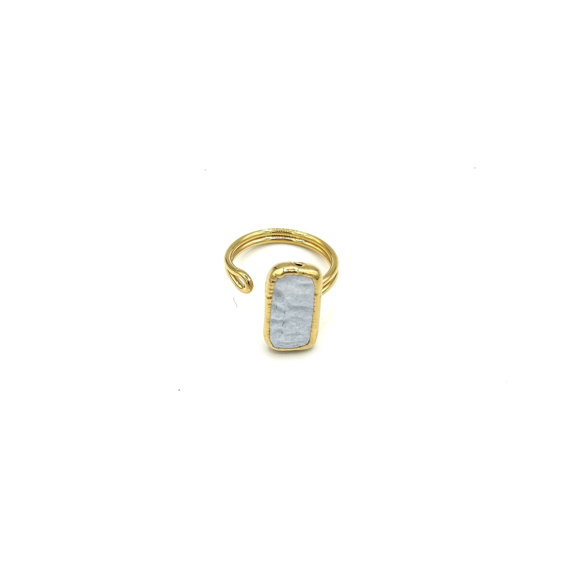The ring is gold plated and adjustable in size with a natural mother of pearl feature rectangular cut stone.