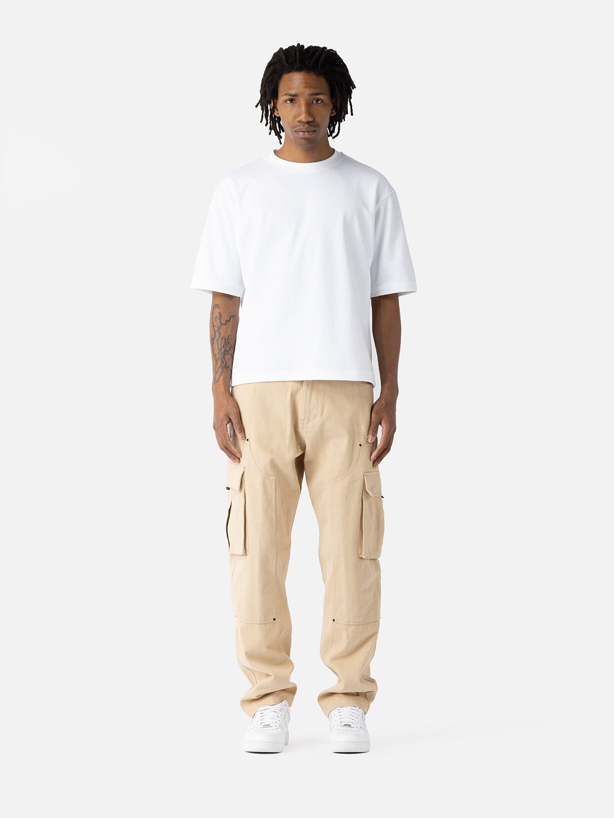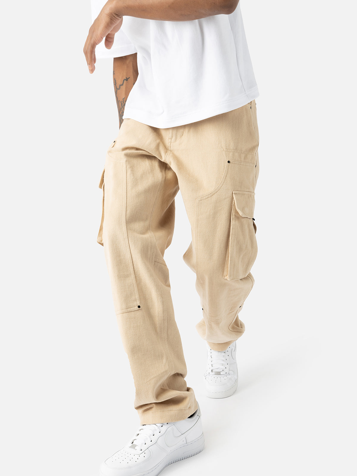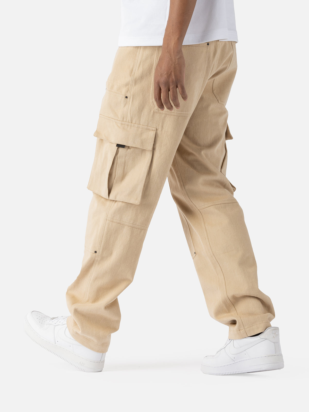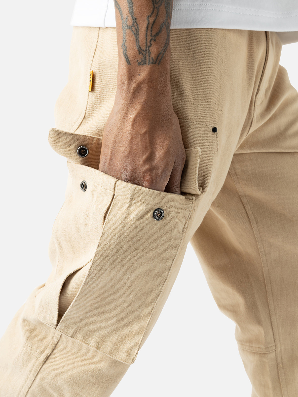Crafted from heavyweight cotton-made twill, the N37 Cargo features an extra layer from thigh to calf, patch pockets with flaps on the side seam, a patch pocket at the back, and a coins bag on the right curved inset pocket.