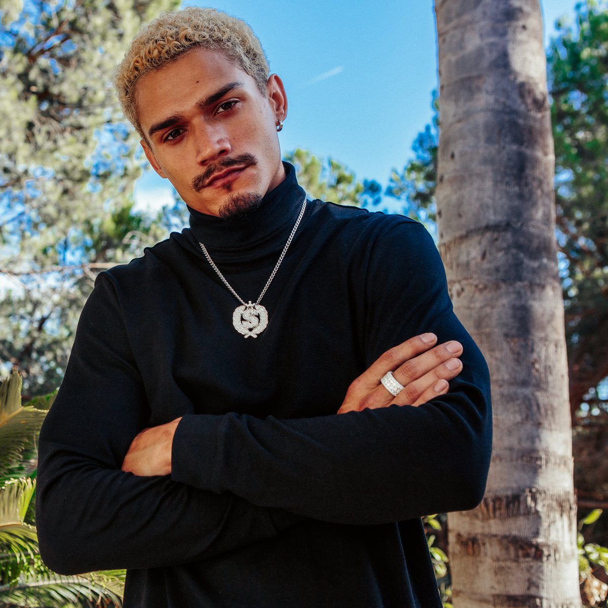 A wreath wrapped dollar sign forms an emblem representing a cash empire. This piece features raised gold channels that line the handset stones and an integrated bail.