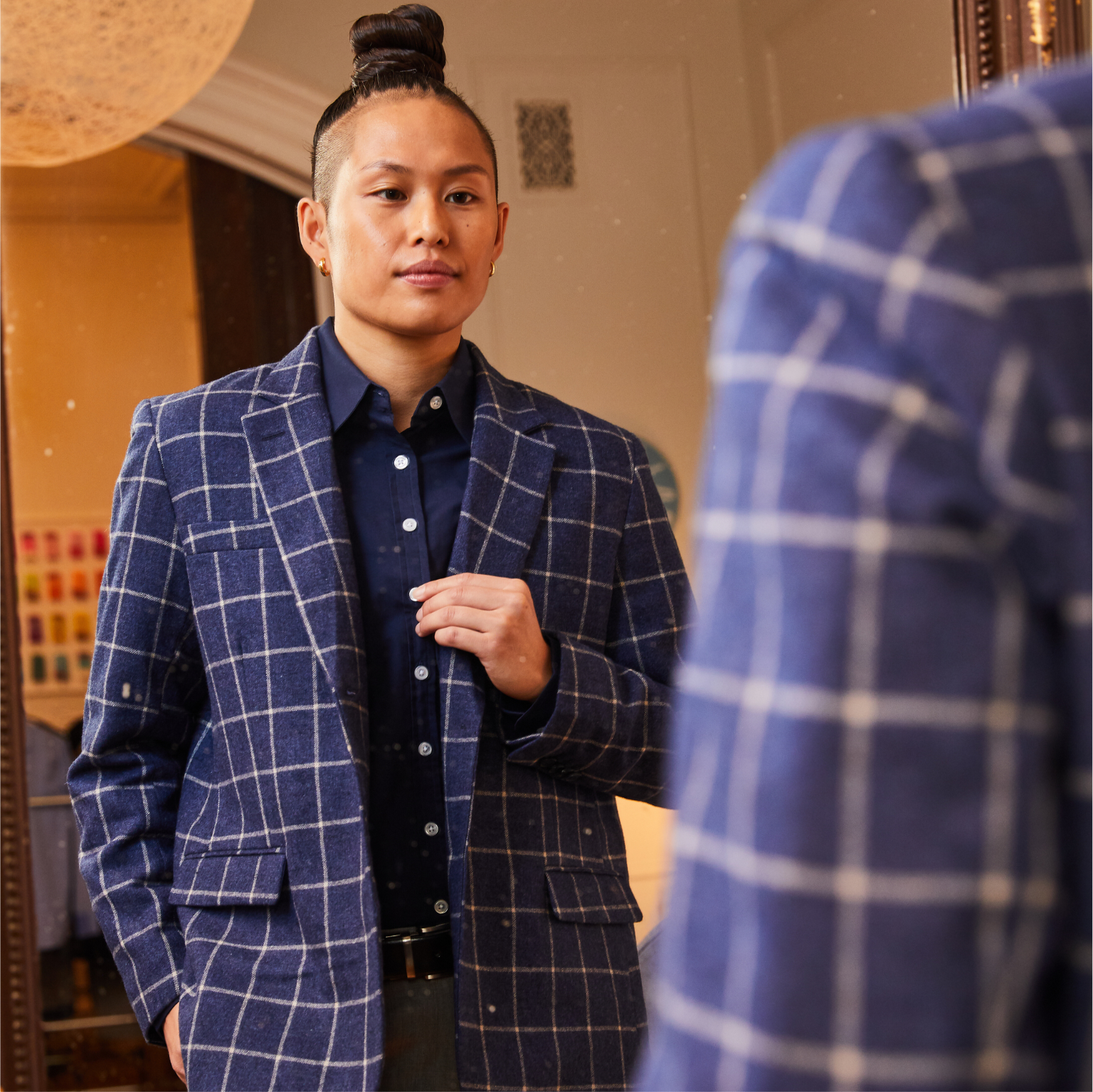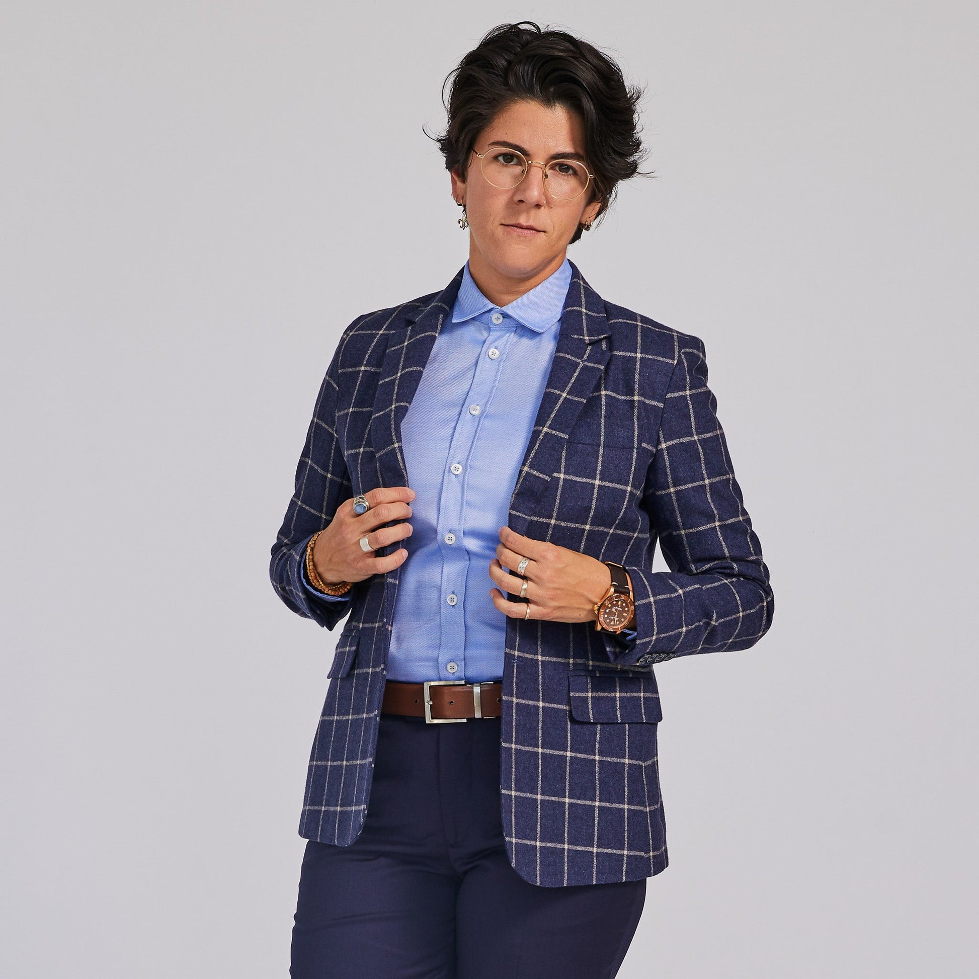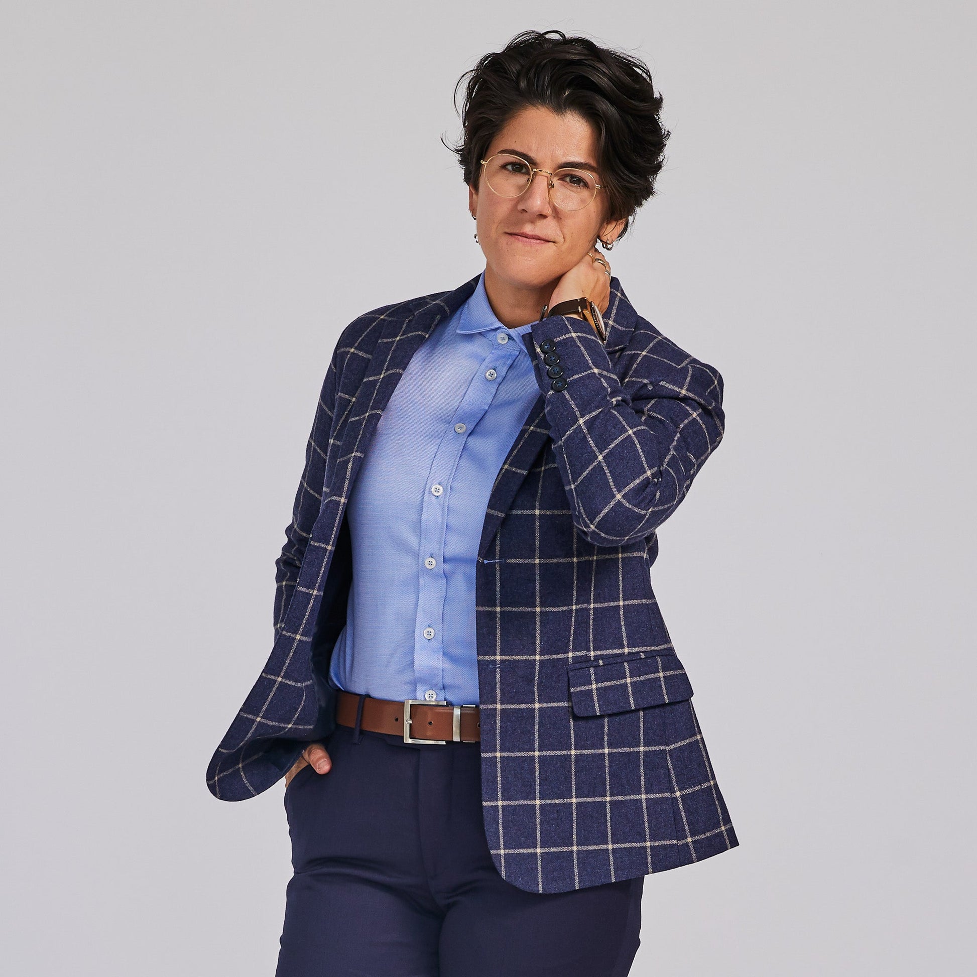 Empower your identity with the show-stopping Windowpane blazer. Its eye-catching brushed indigo color perfectly pairs with the Joni jeans and wide range of dress shirts.